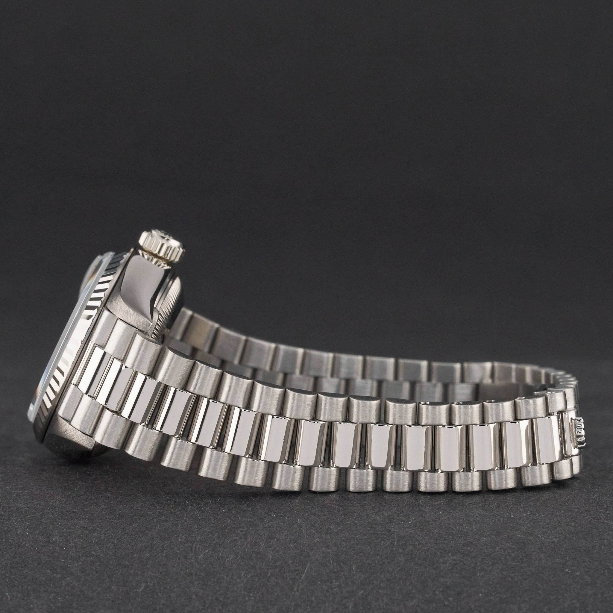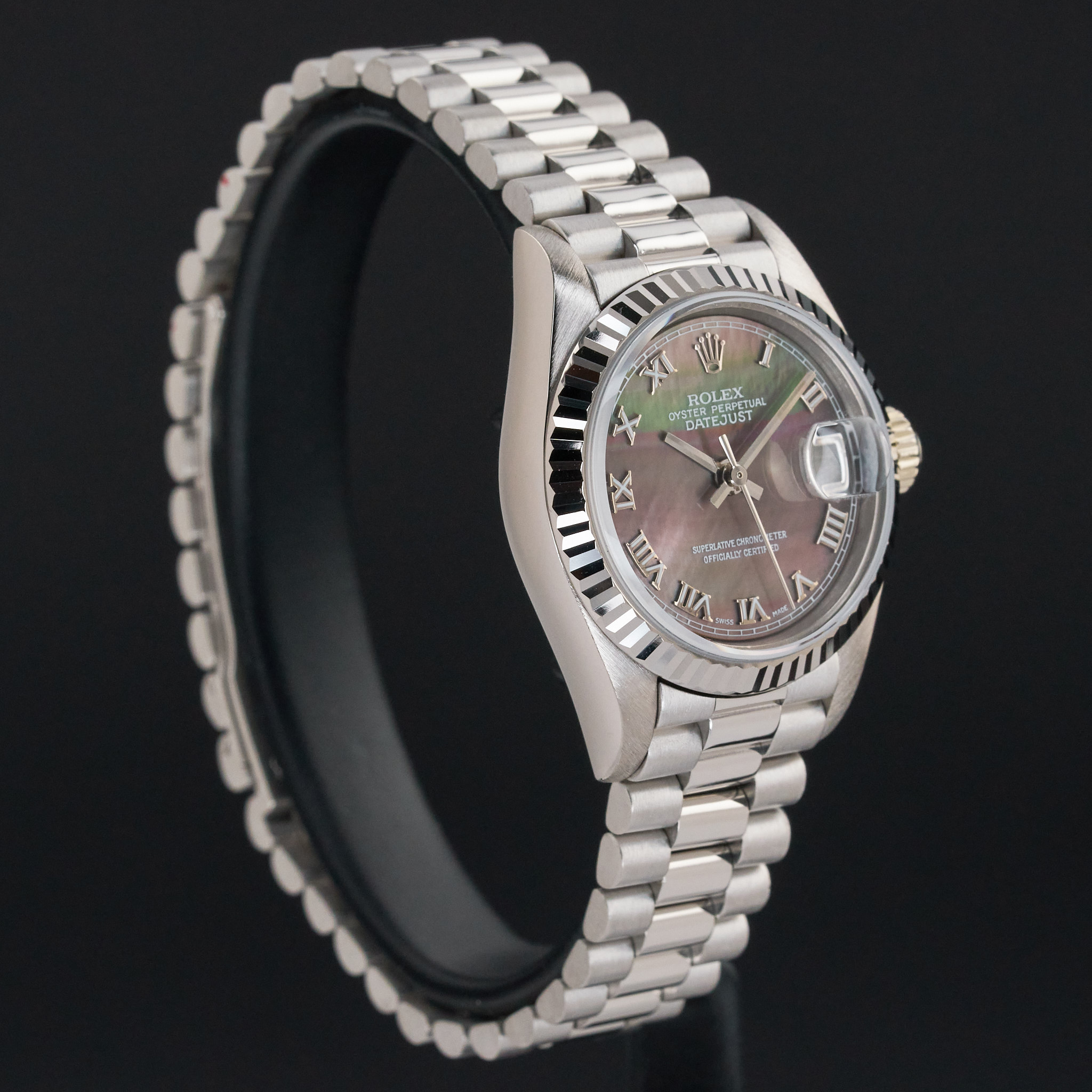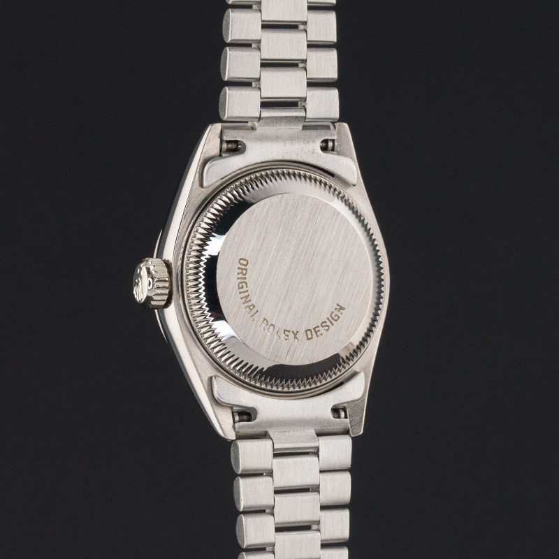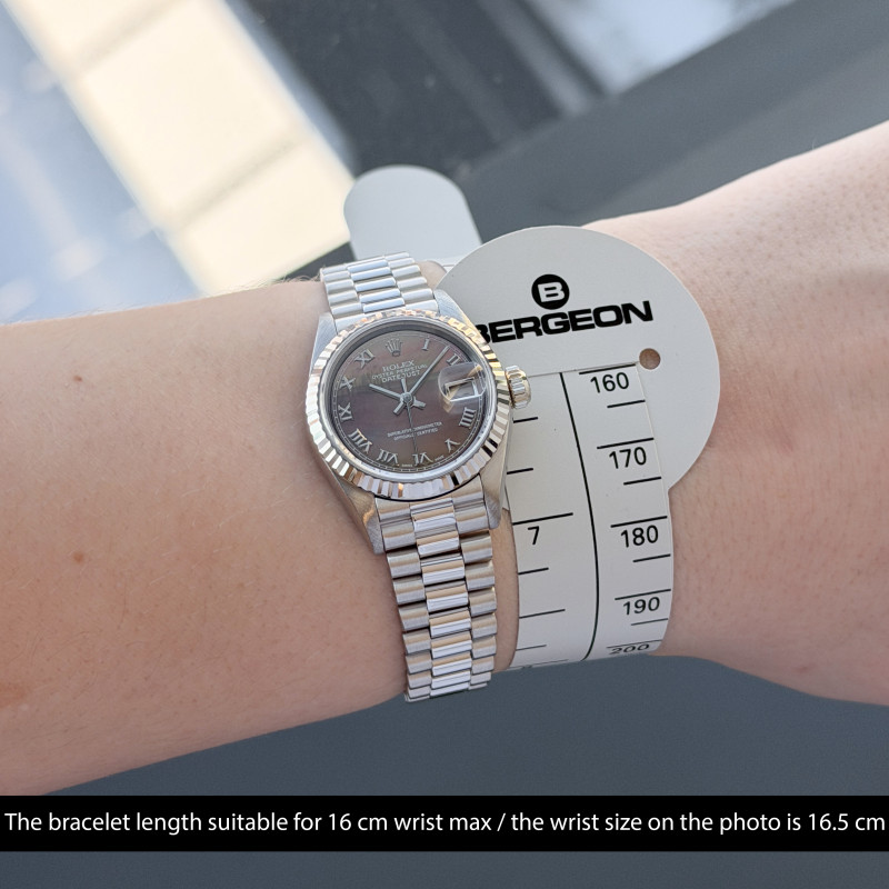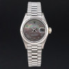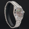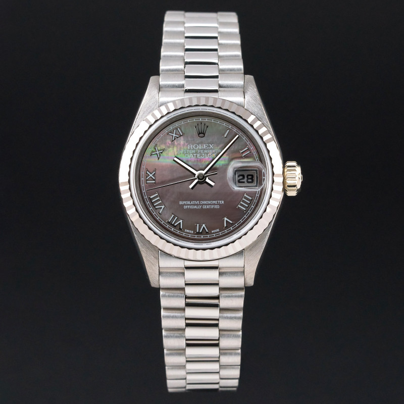 This Rolex Lady-Datejust 69179 features a Tahitian Mother of Pearl Roman dial and is crafted from 18K white gold, with a production year of 1995.