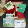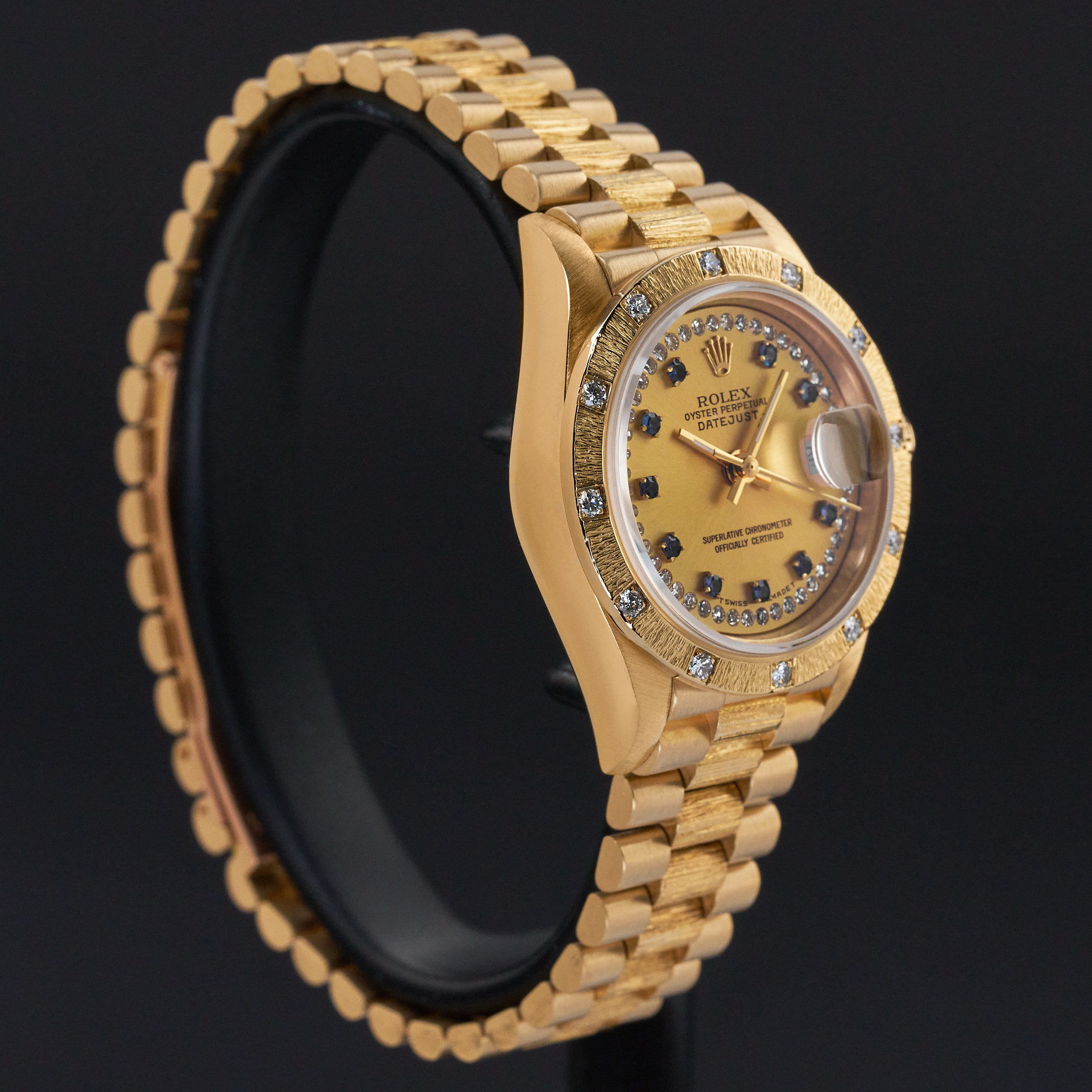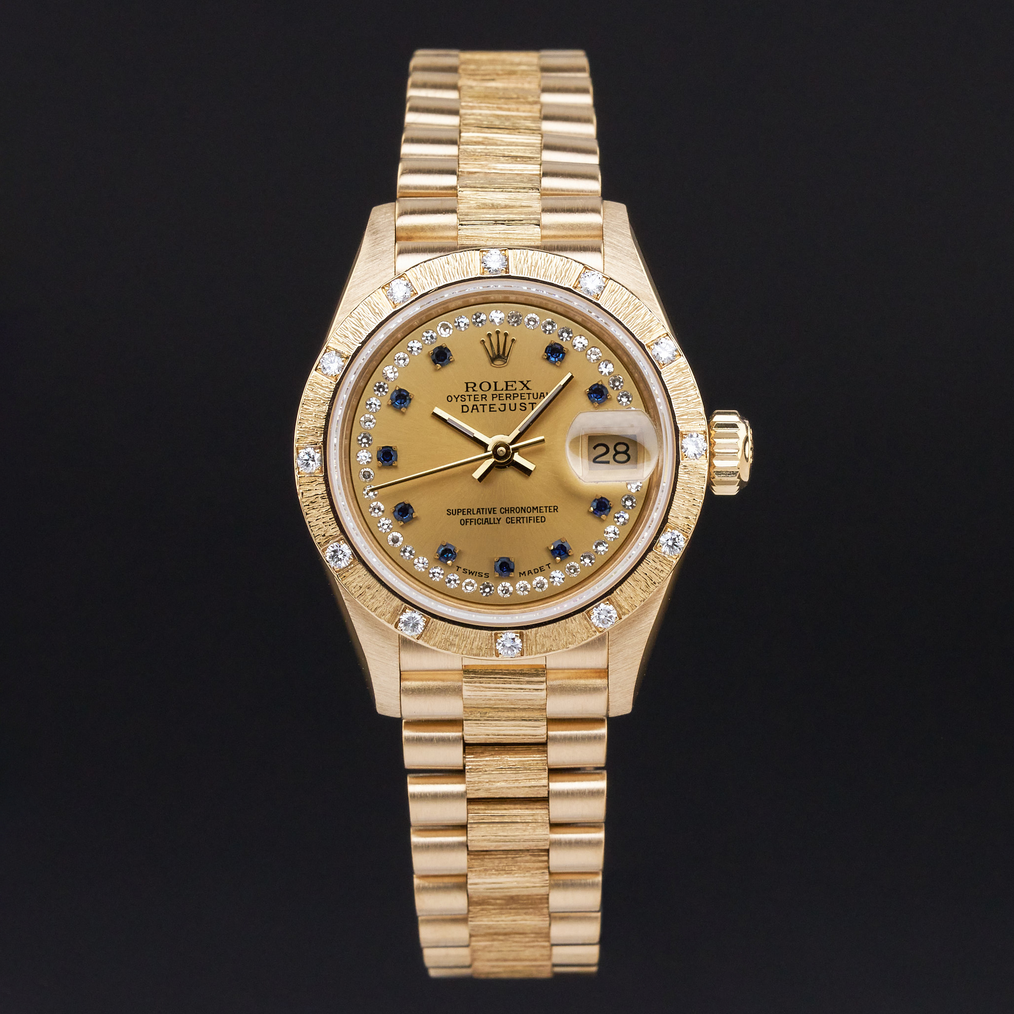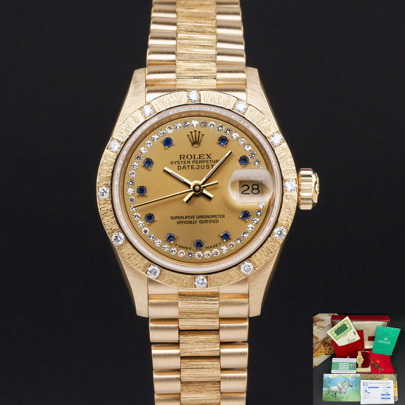 This Rolex Lady-Datejust features a Champagne string sapphire & diamond dial and is crafted from 18K yellow gold, with a production year of 1988.