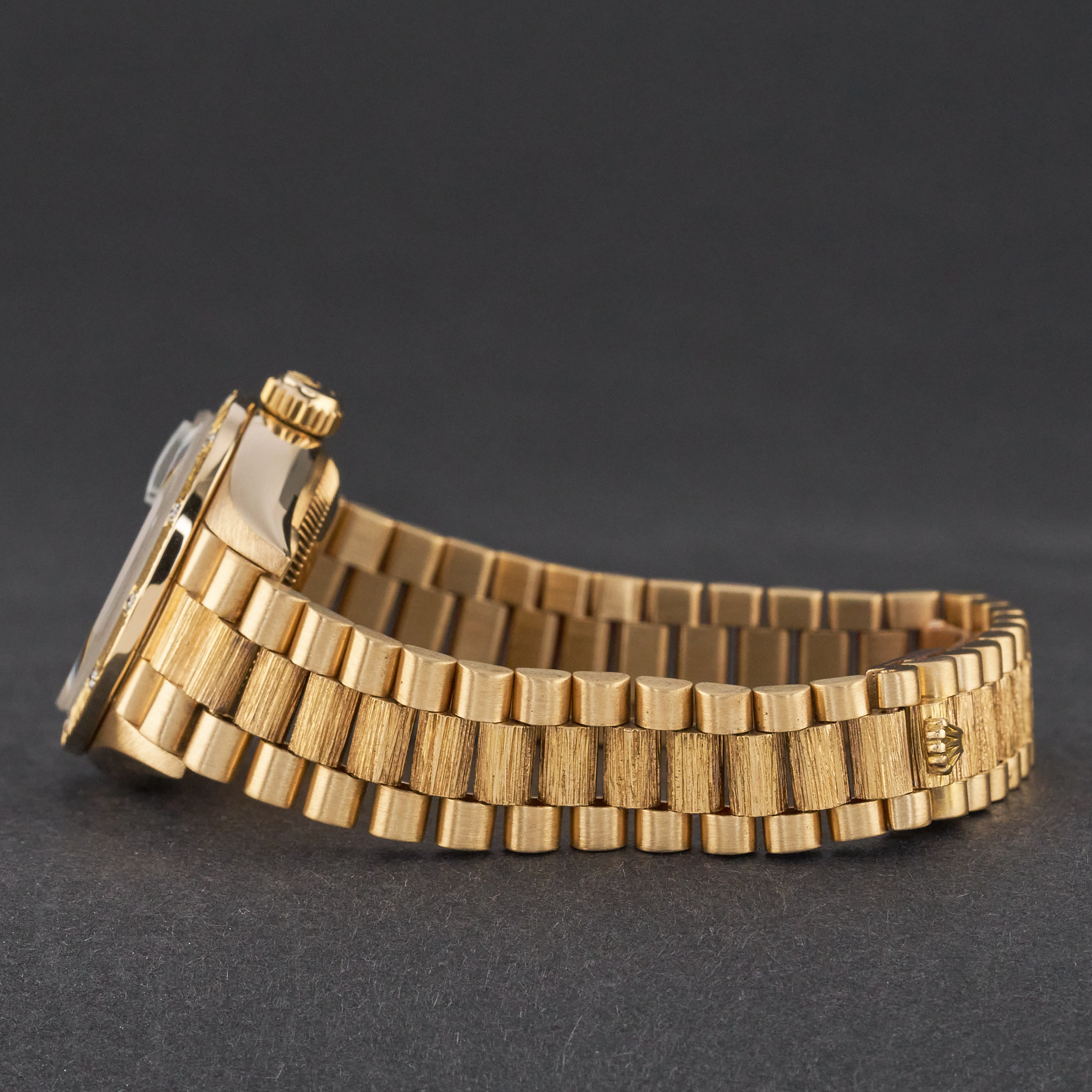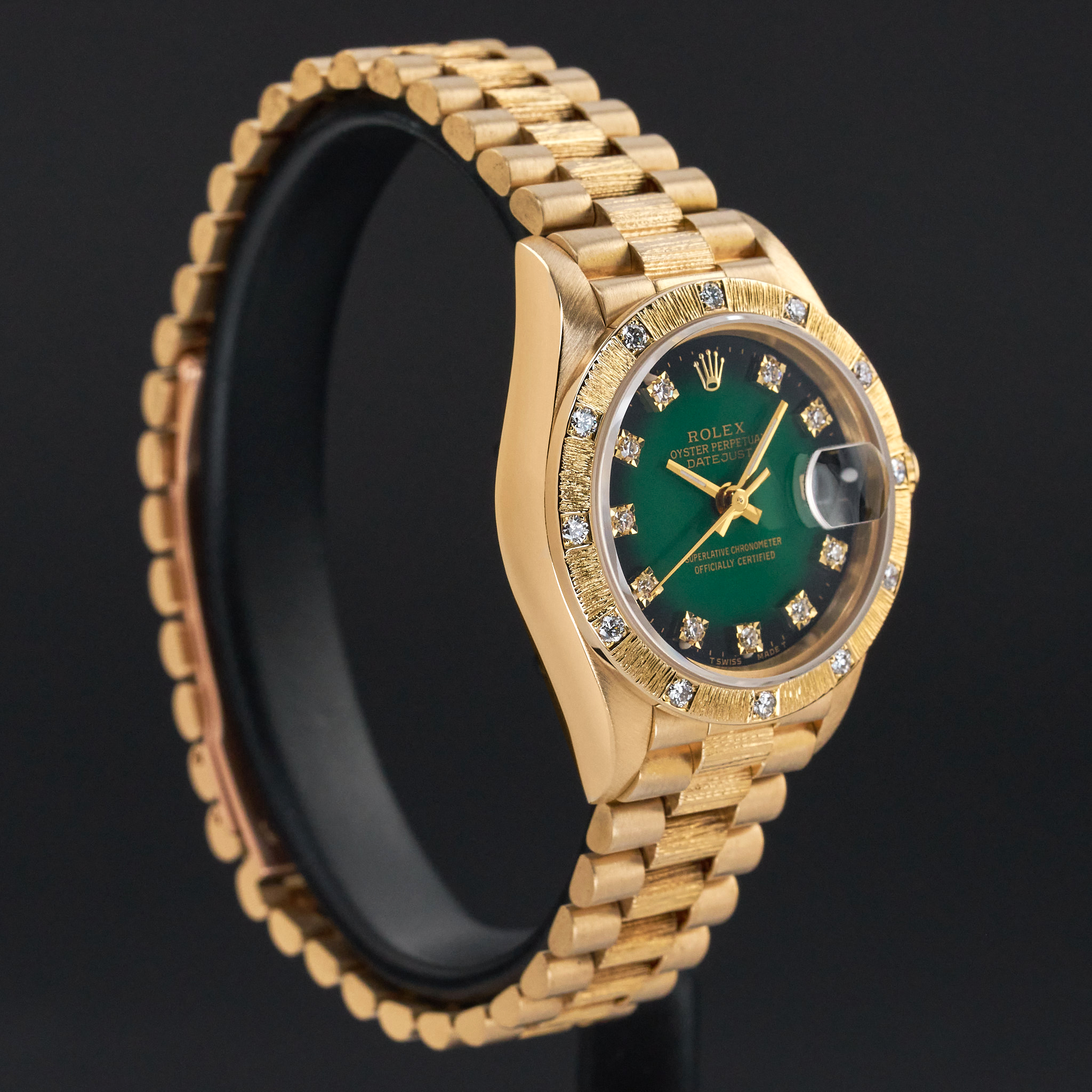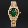 This Rolex Lady-Datejust 69288 features a Green vignette small diamond dial and is crafted from 18K yellow gold, with a production year of 1991.