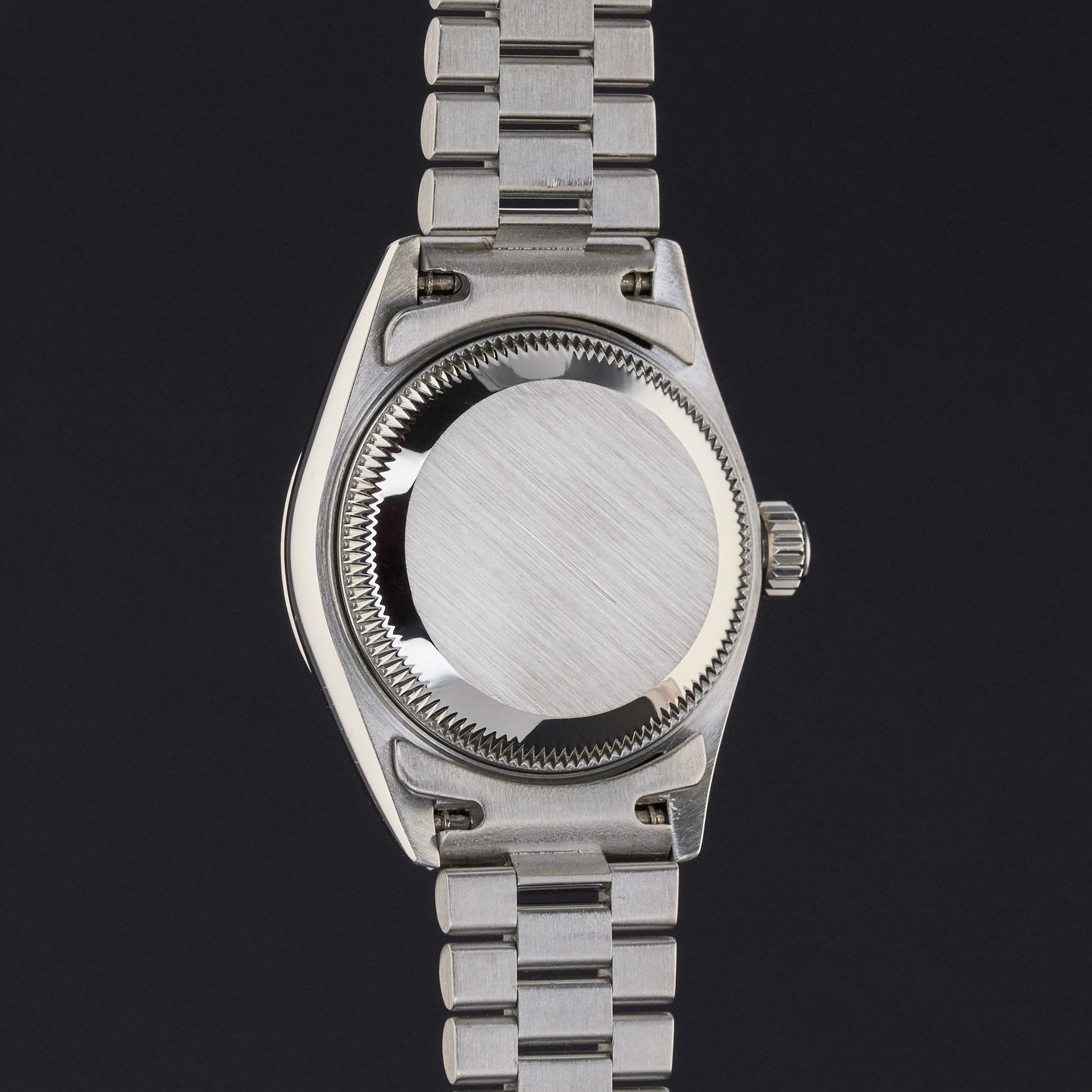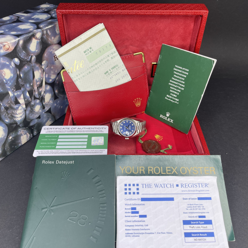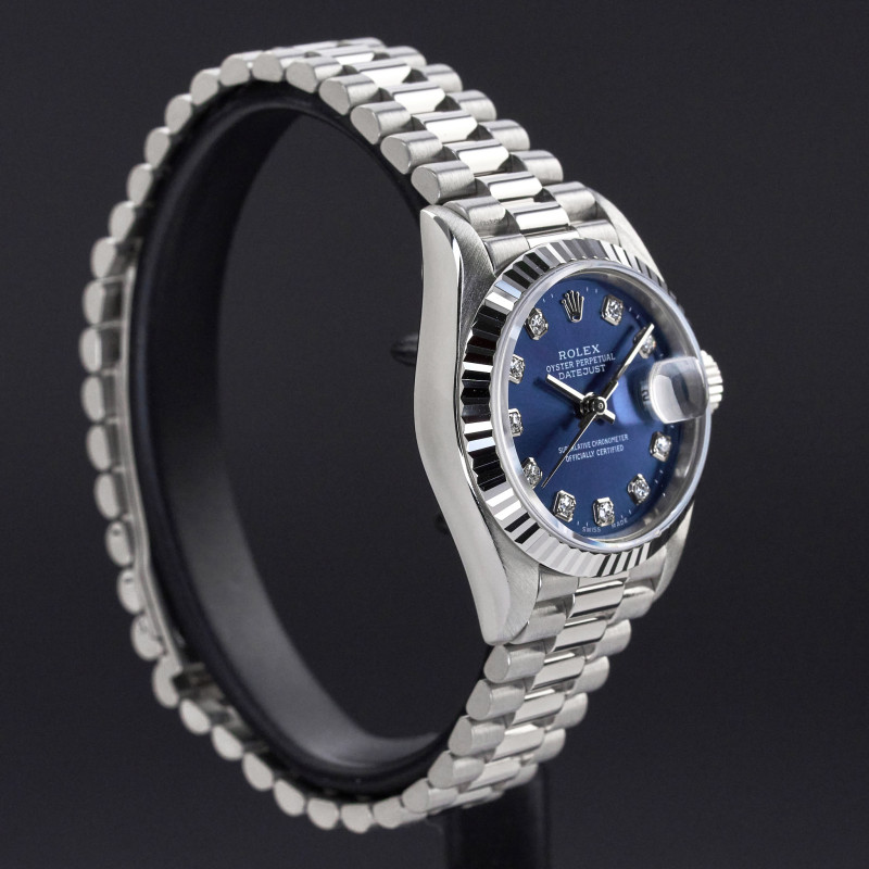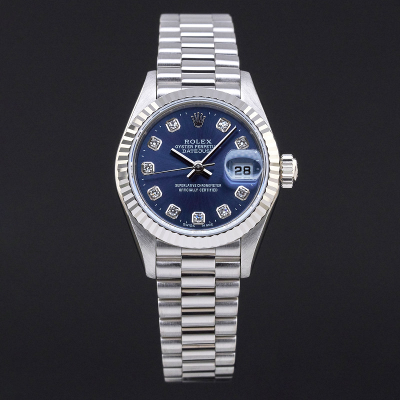 This Rolex Lady-Datejust 79179 features a Blue big diamond dial and is crafted from 18K white gold, with a production year of 2000.