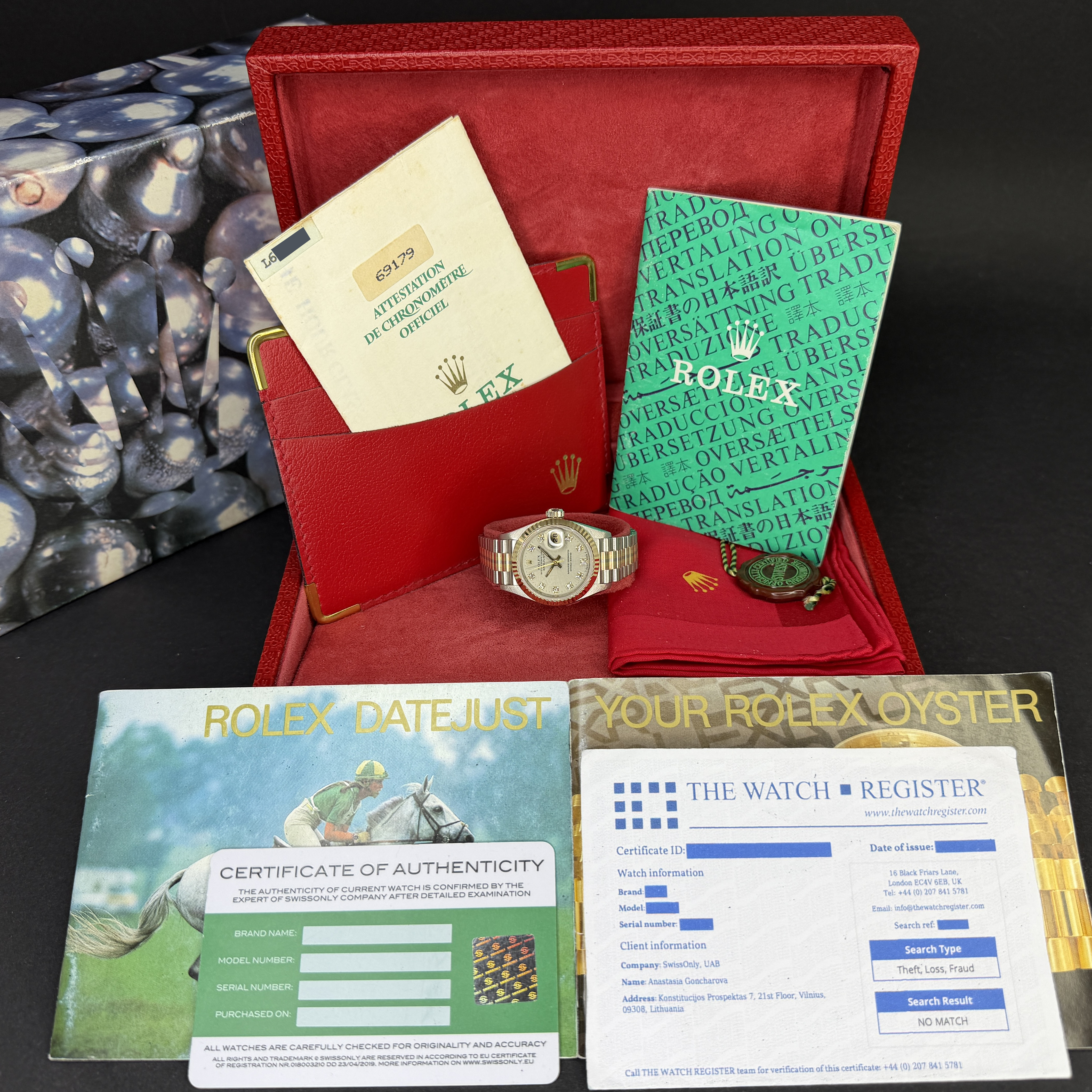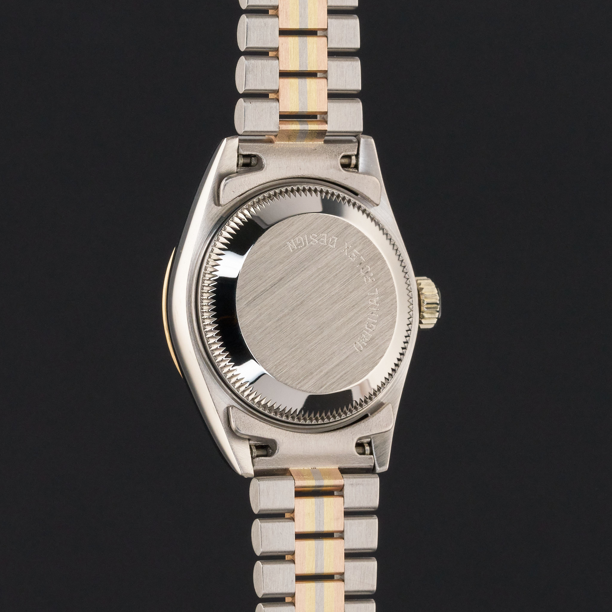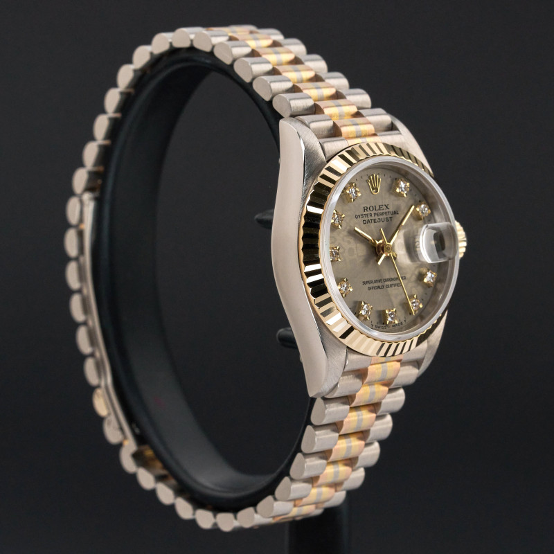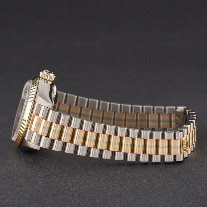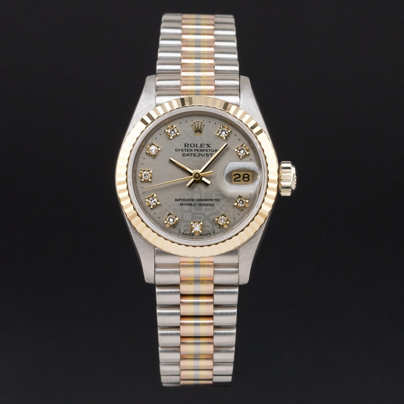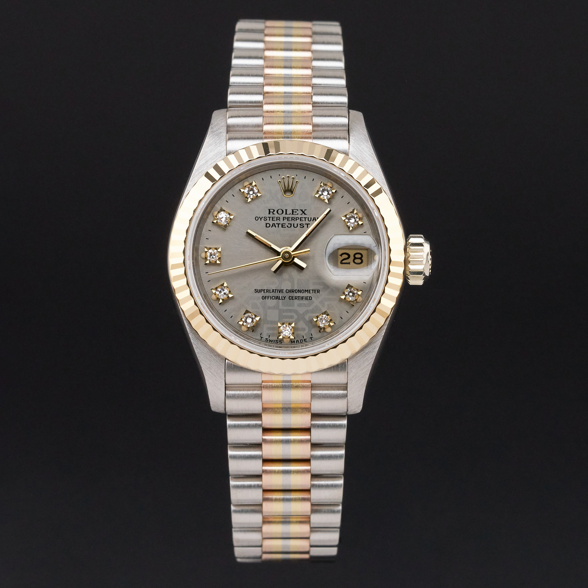 This Rolex Rare TRIDOR Lady-Datejust 69179 features a Grey jubilee small diamond dial and is crafted from 18K white gold, with a production year of 1989.