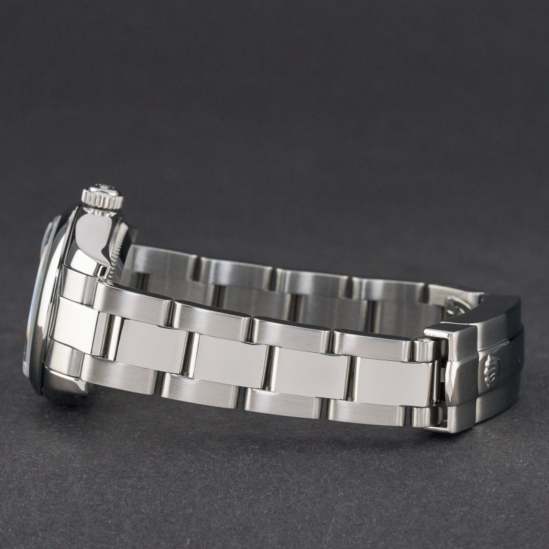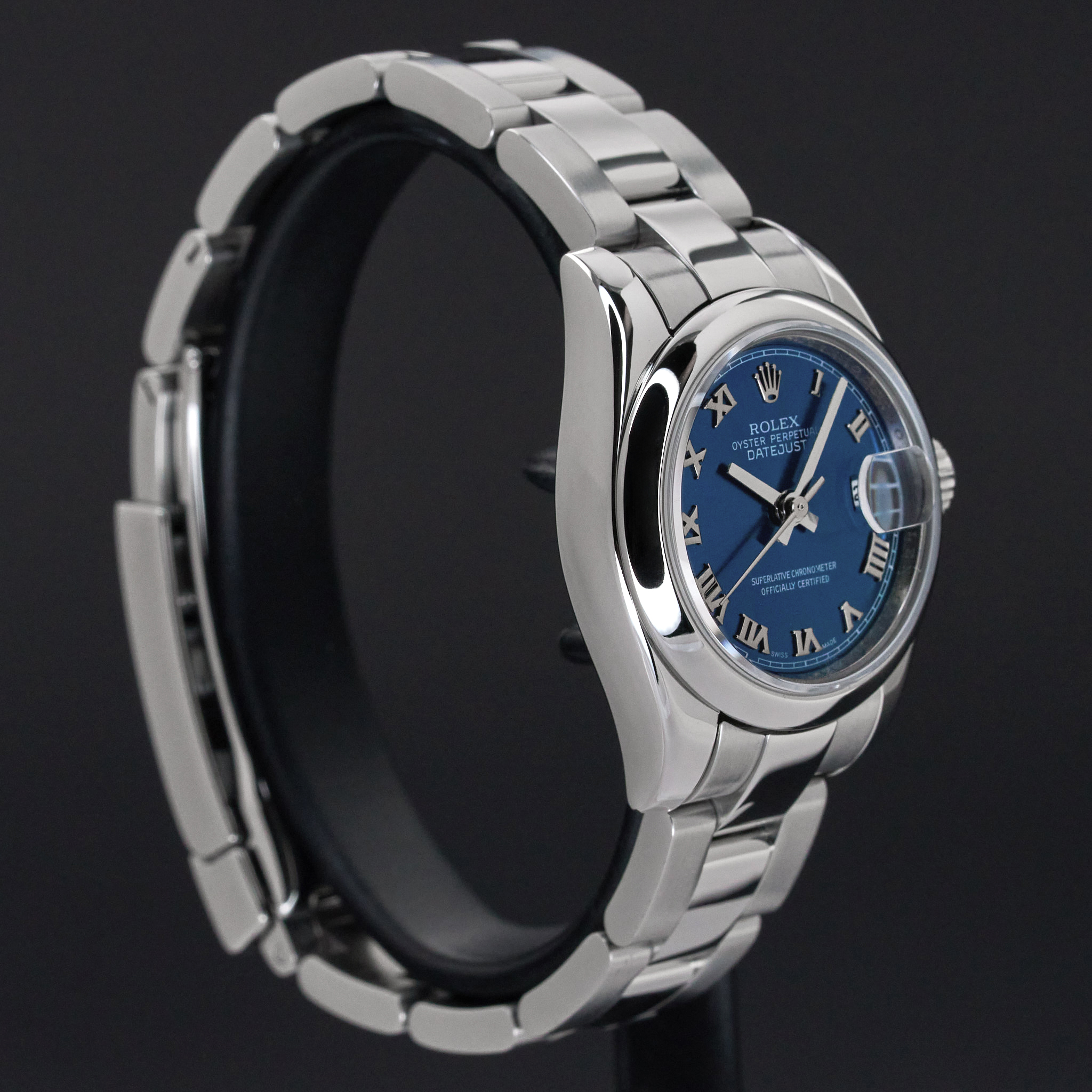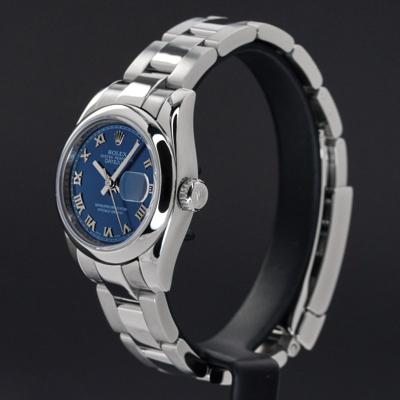 This Rolex Lady-Datejust 179160 features a Blue Roman dial and is crafted from stainless steel, with a production year of 2008.