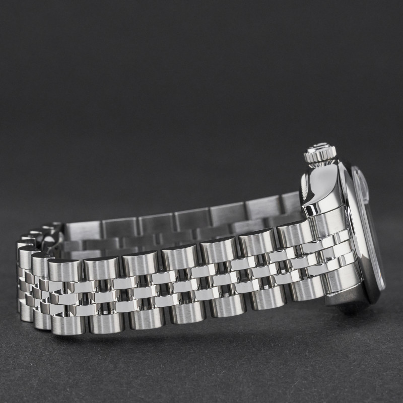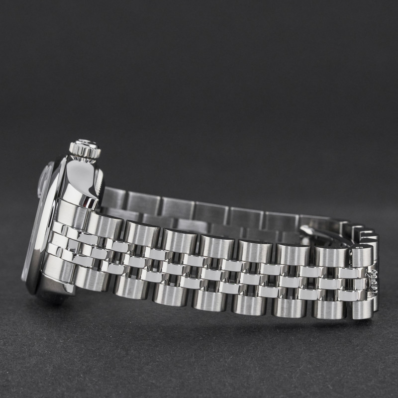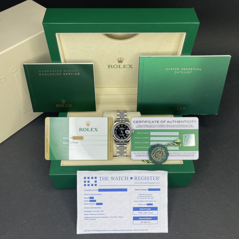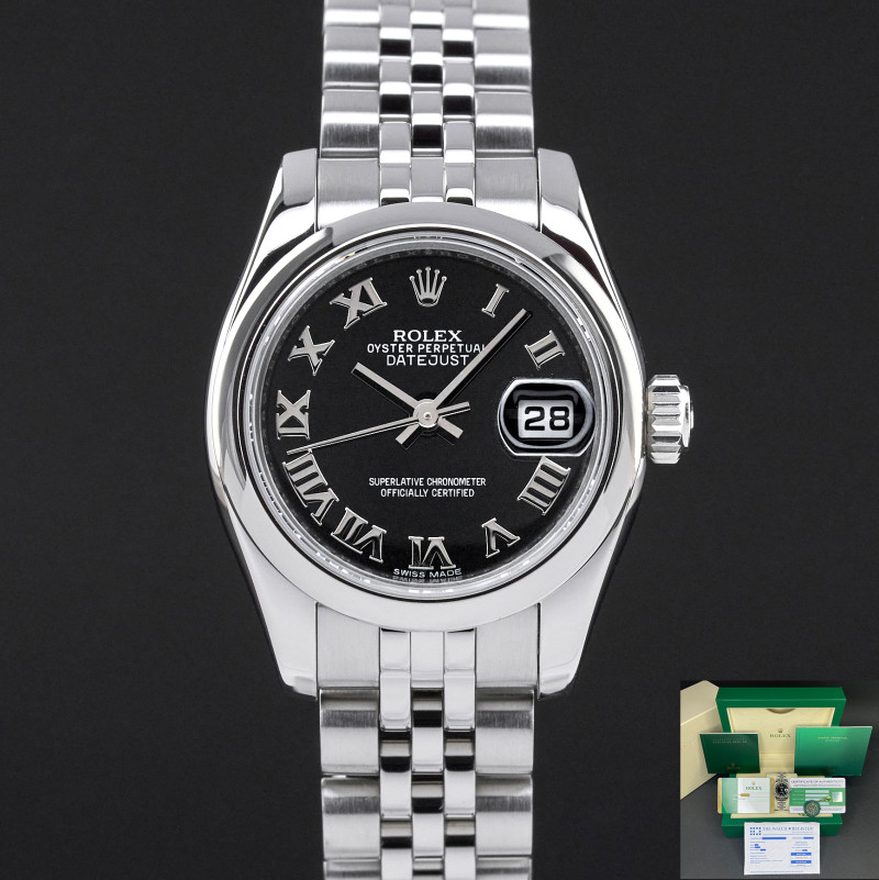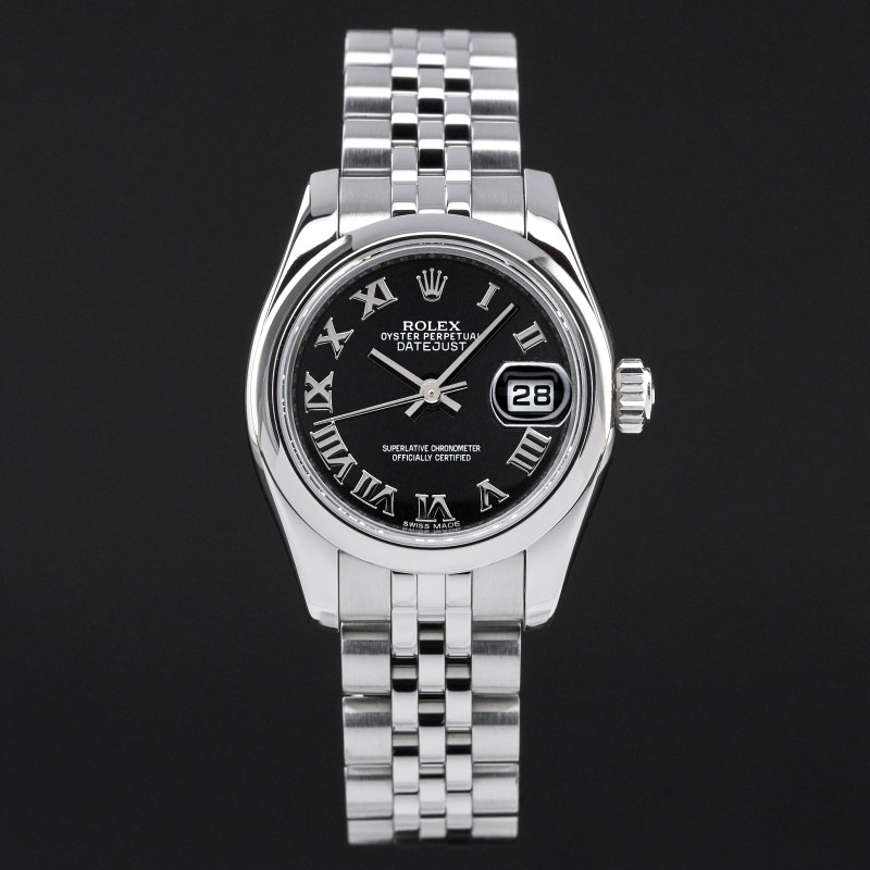 This Rolex Lady-Datejust 179160 features a Black Roman dial and is crafted from stainless steel, with a production year of 2017.