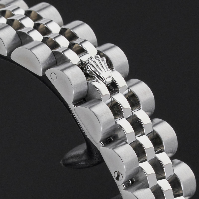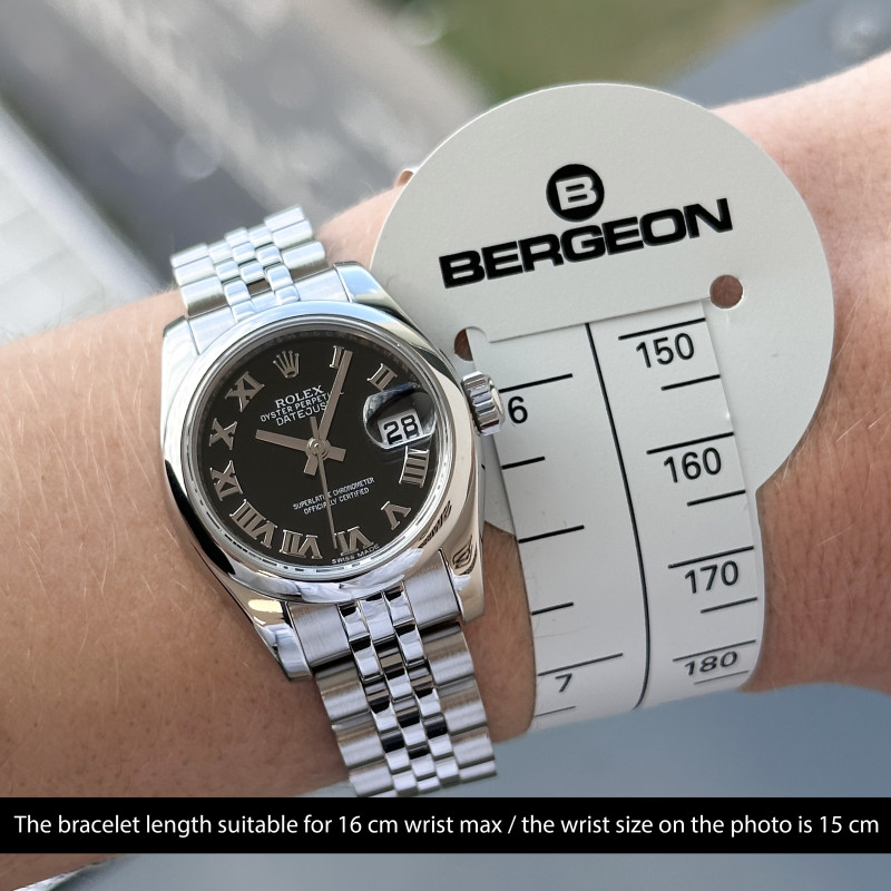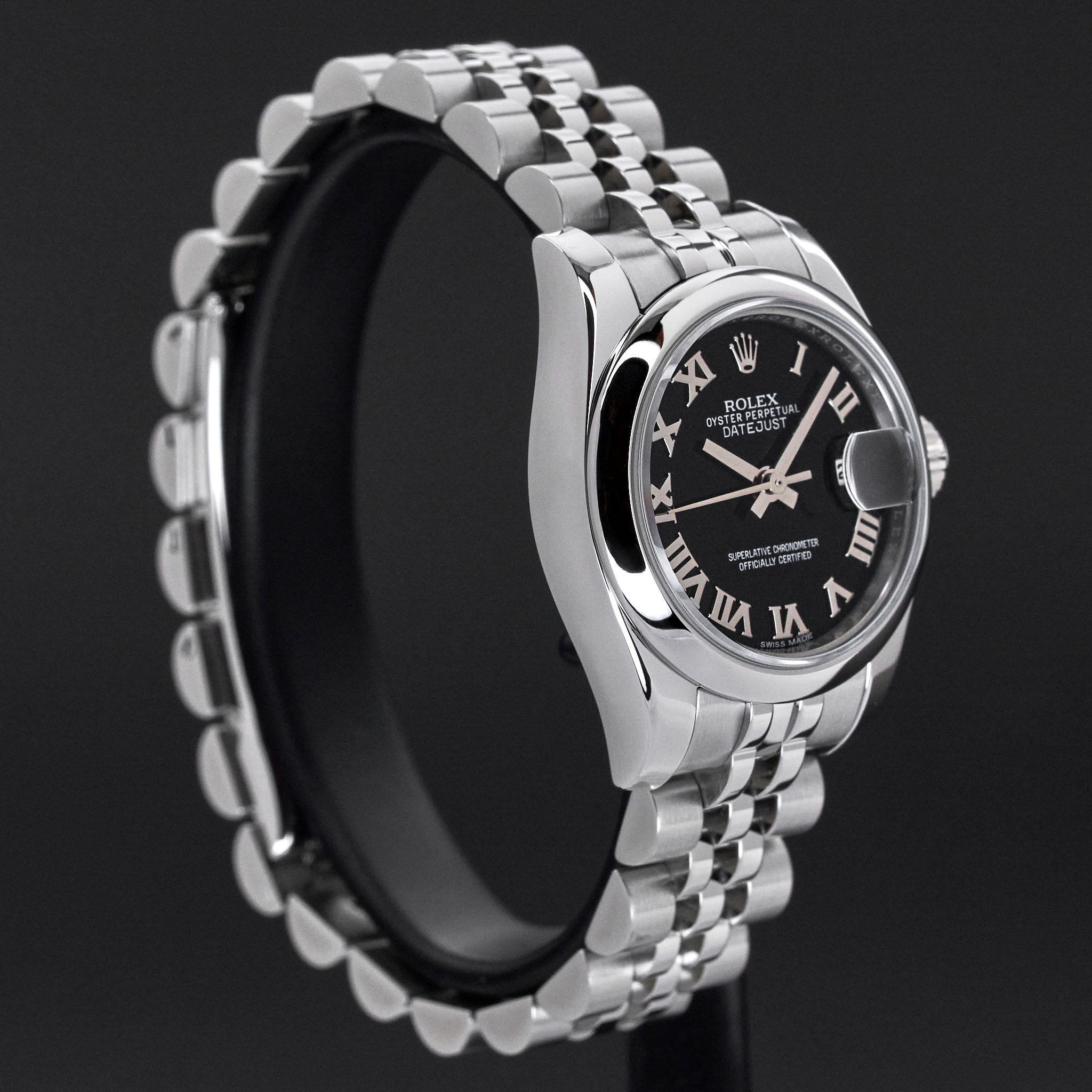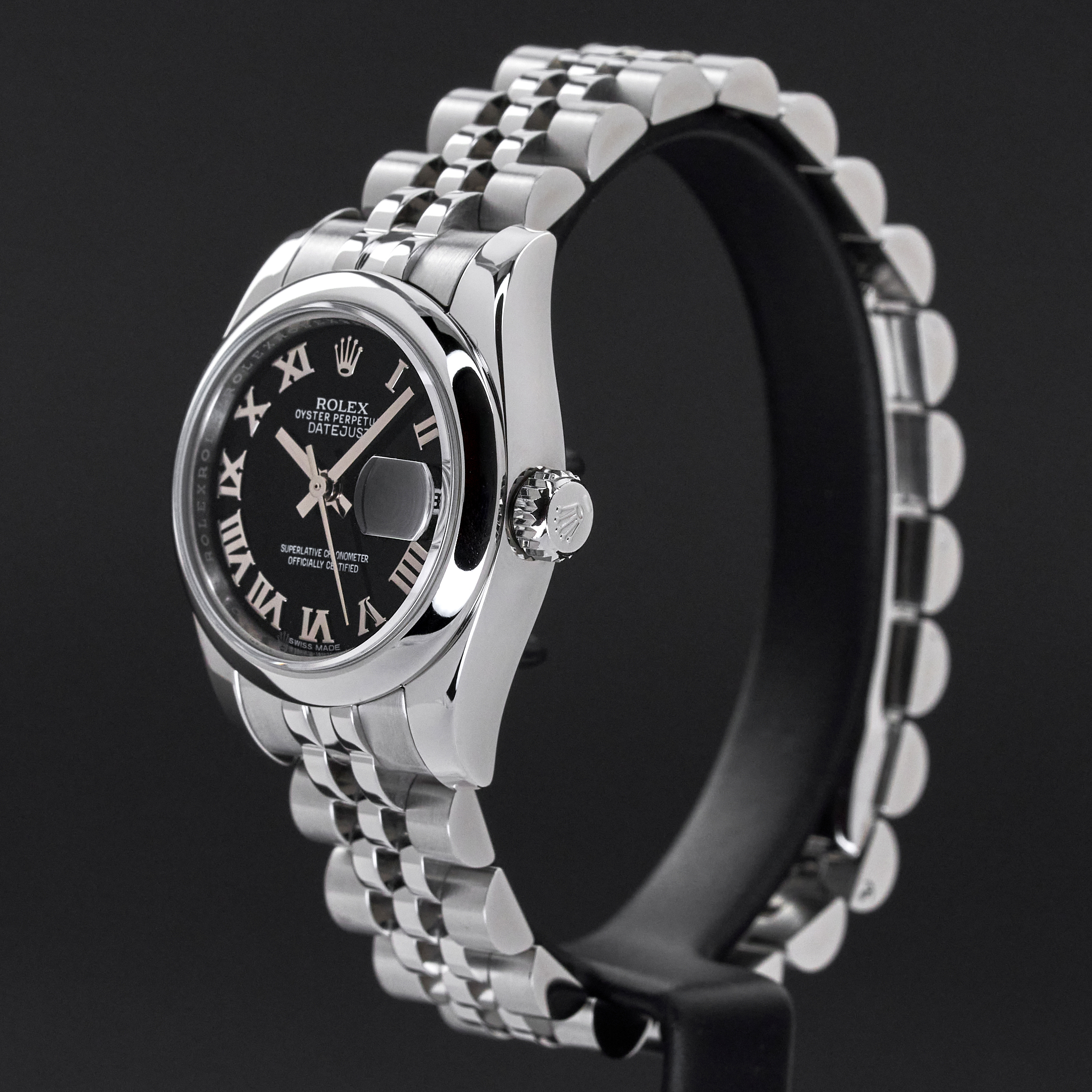 This Rolex Lady-Datejust 179160 features a Black Roman dial and is crafted from stainless steel, with a production year of 2017.