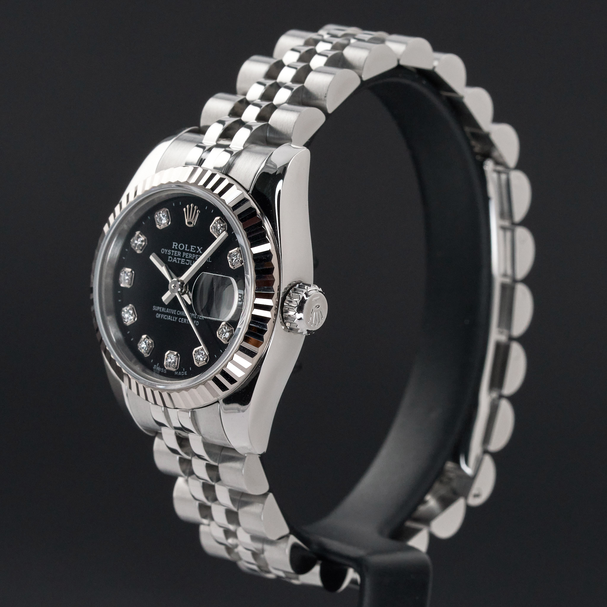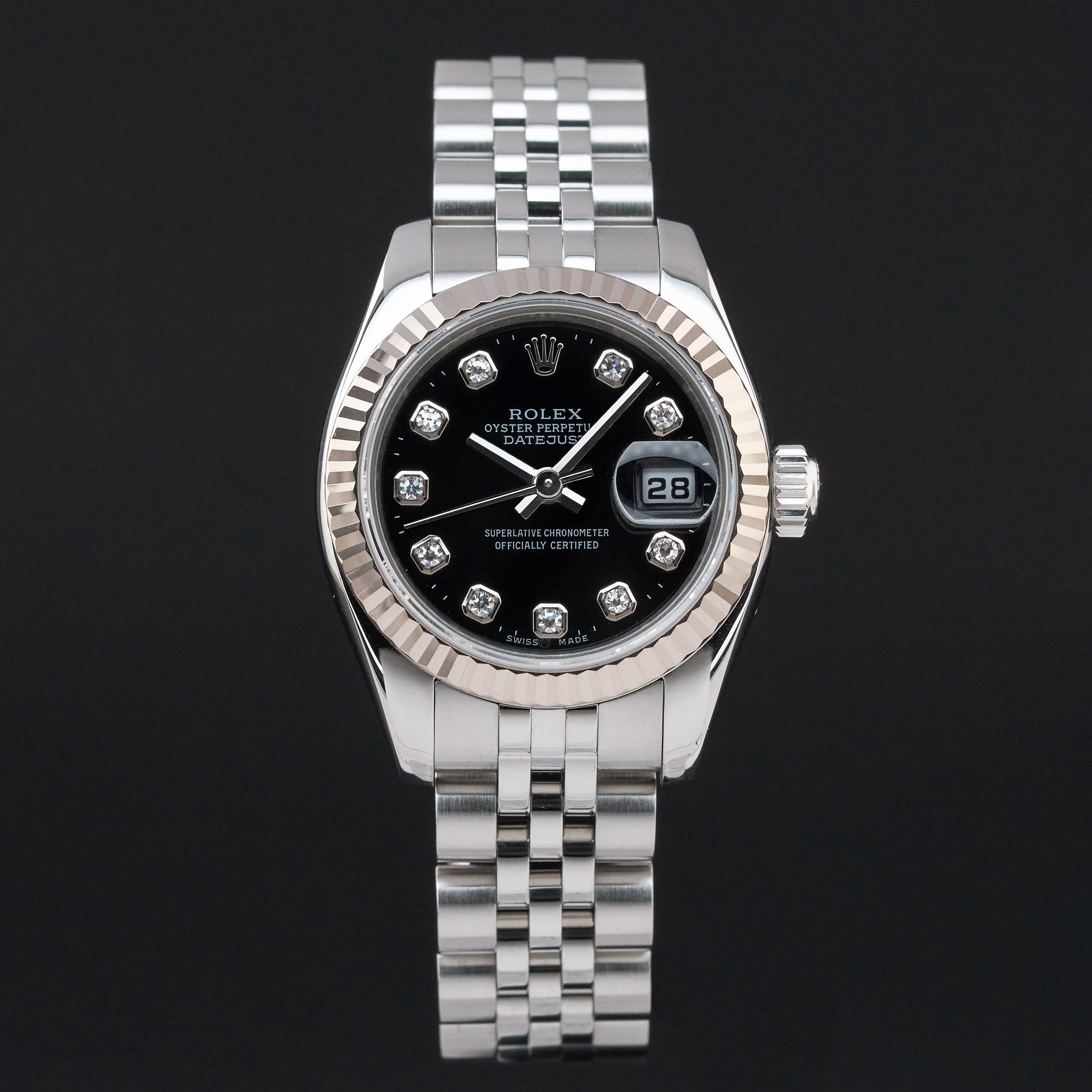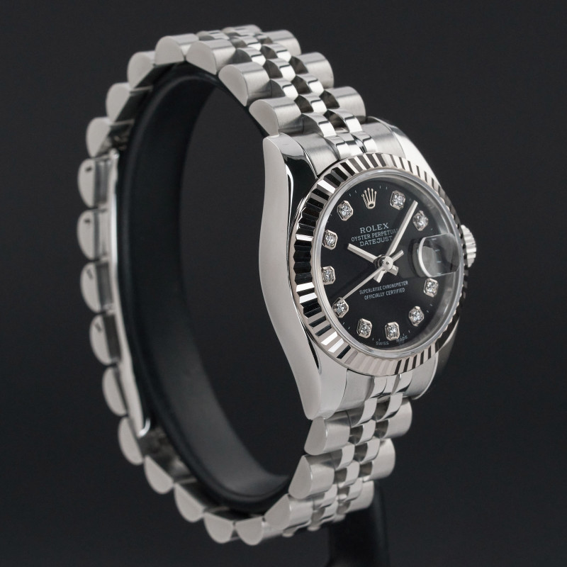 This Rolex Lady-Datejust 179174 features a Black diamond dial and is crafted from stainless steel, with a production year of 2006.
