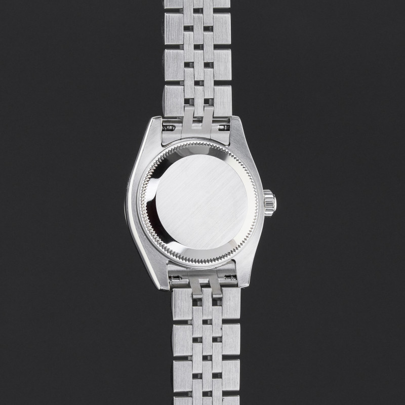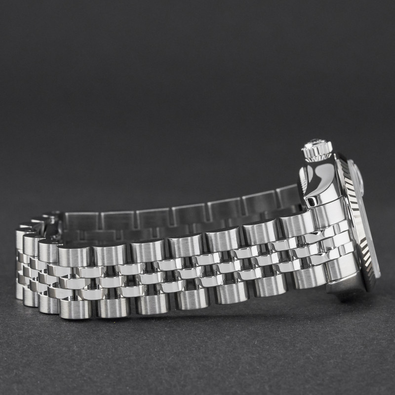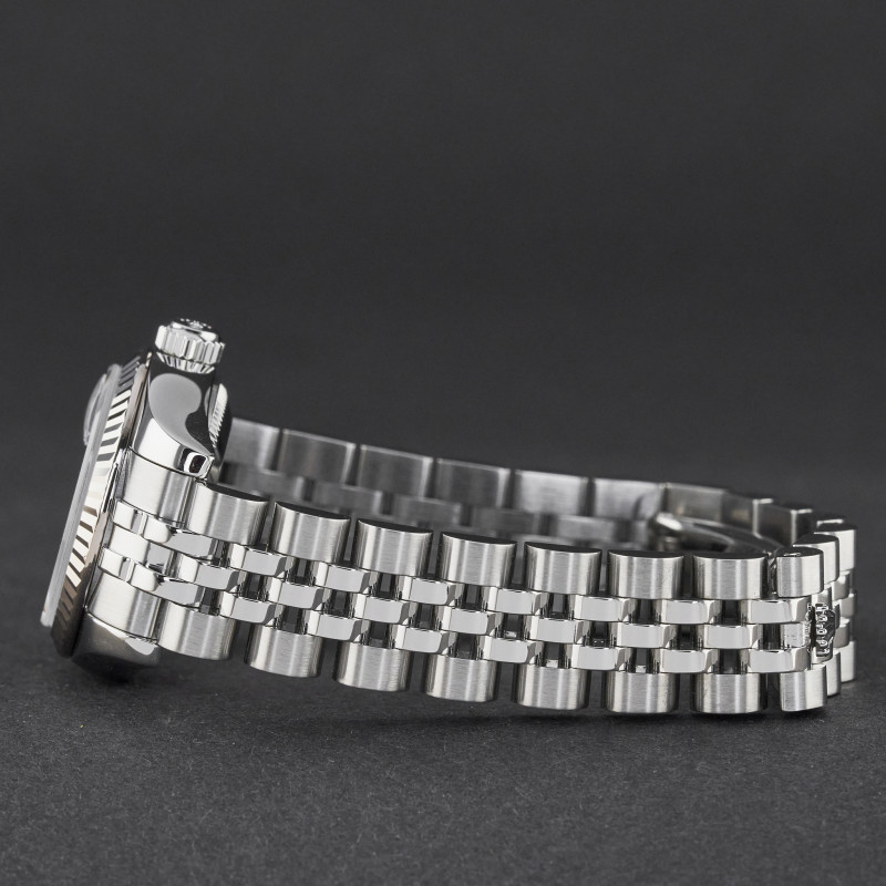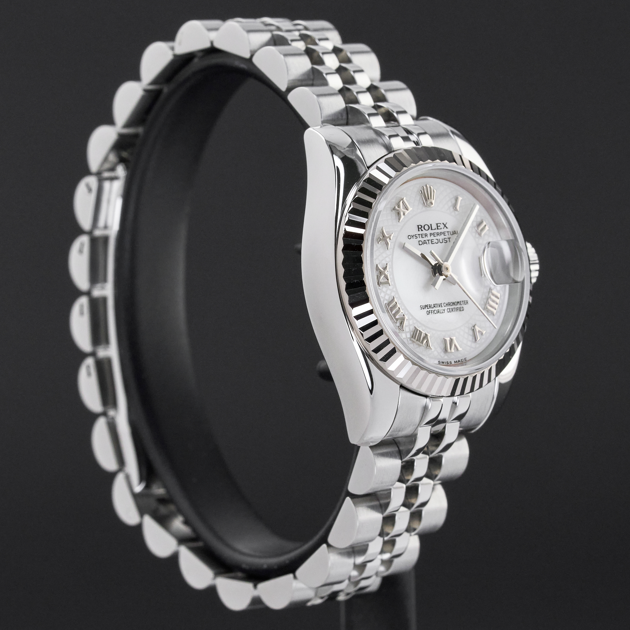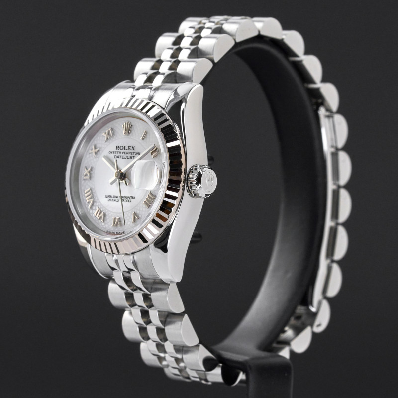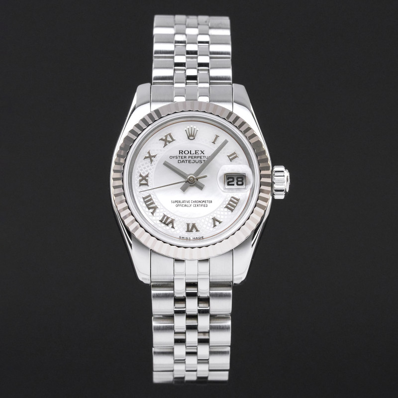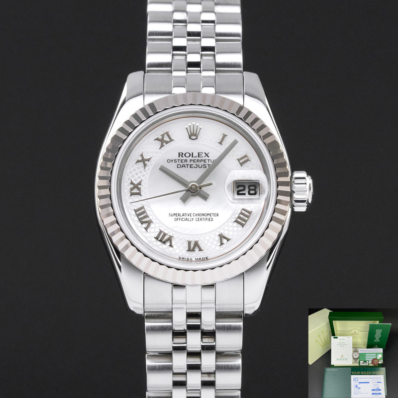 This Rolex Lady-Datejust 179174 features a Mother of Pearl myriad Roman dial dial and is crafted from stainless steel, with a production year of 2006.