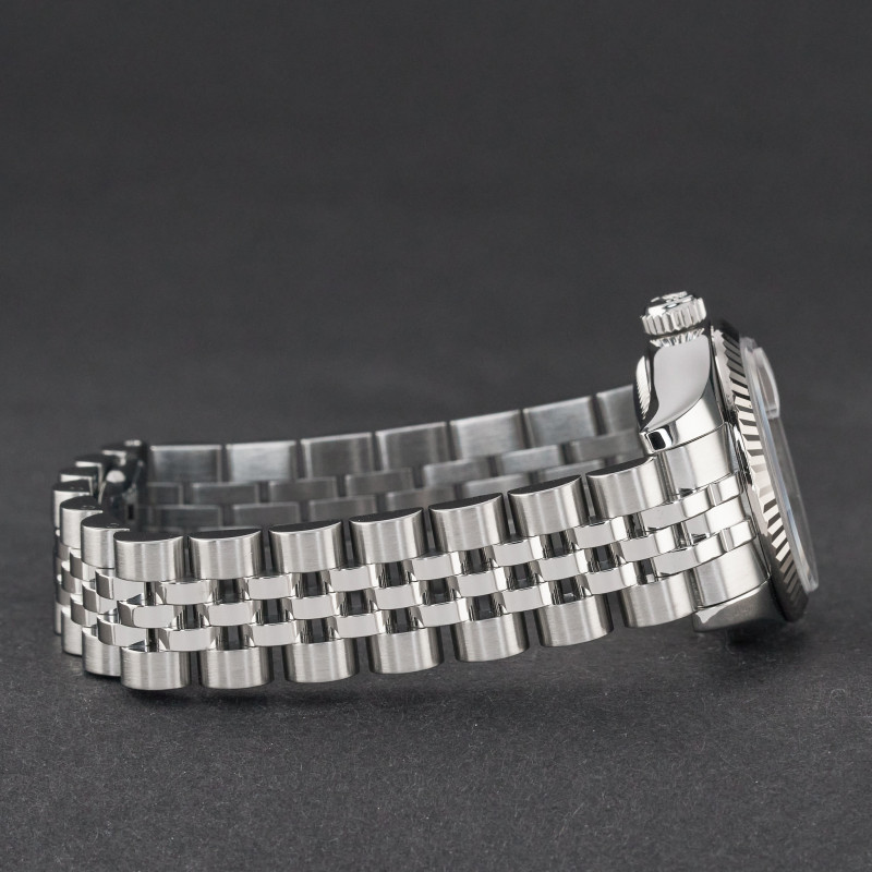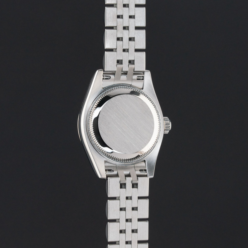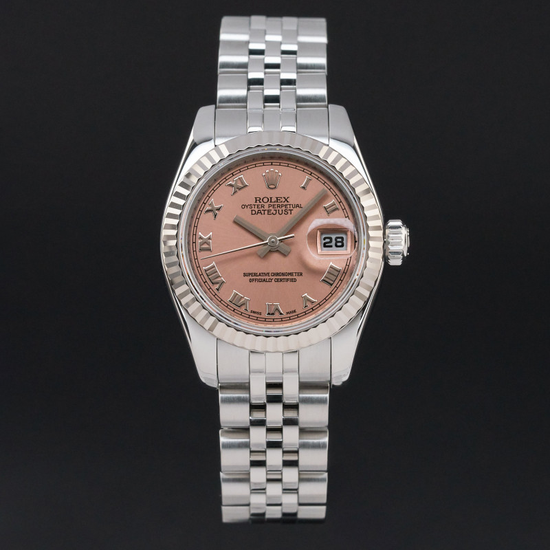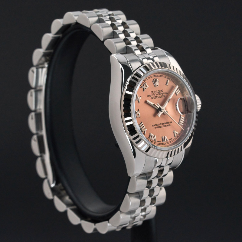 This Rolex Lady-Datejust 179174 features a Salmon Roman dial and is crafted from stainless steel, with a production year of 2006.