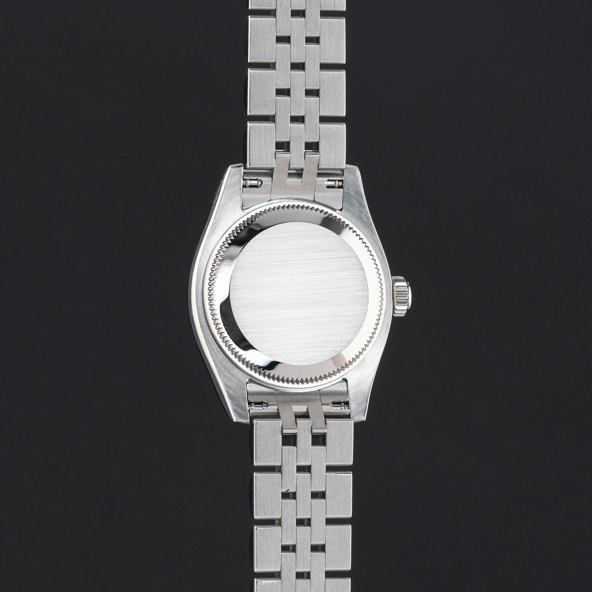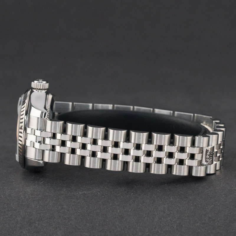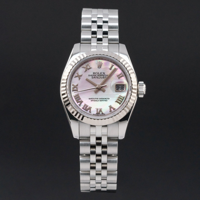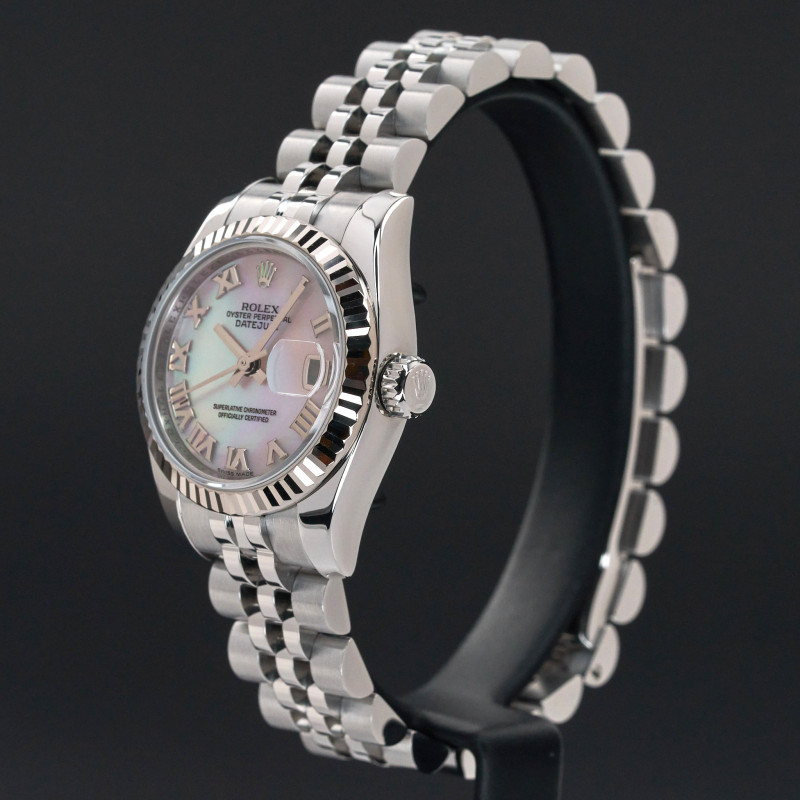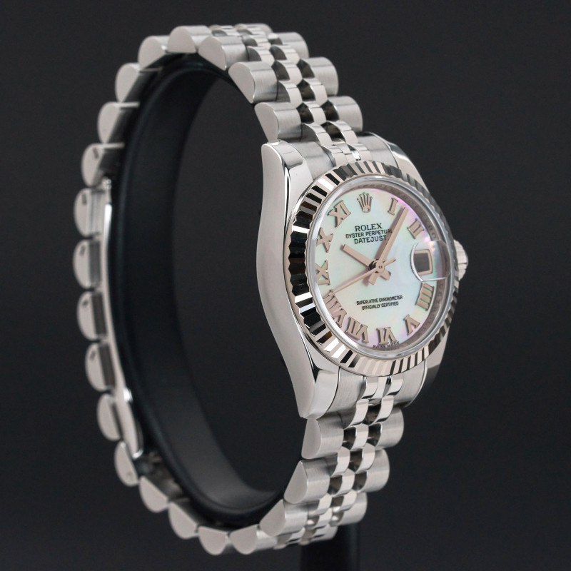 This Rolex Lady-Datejust 179174 features a Silver Mother of pearl Roman dial and is crafted from stainless steel, with a production year of 2006.