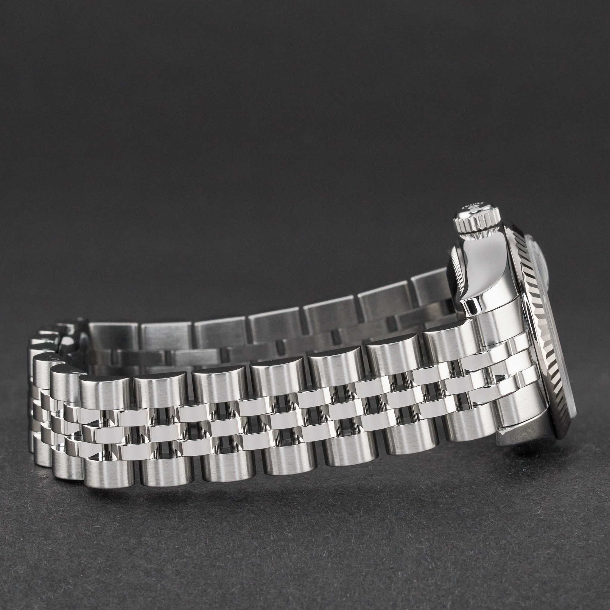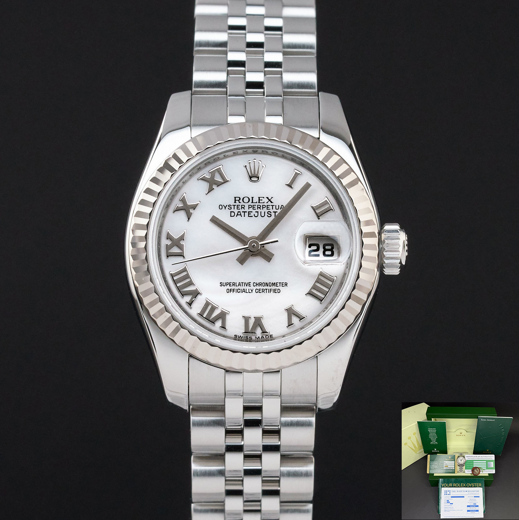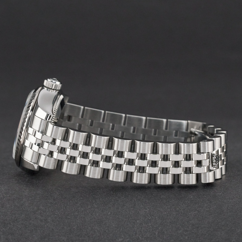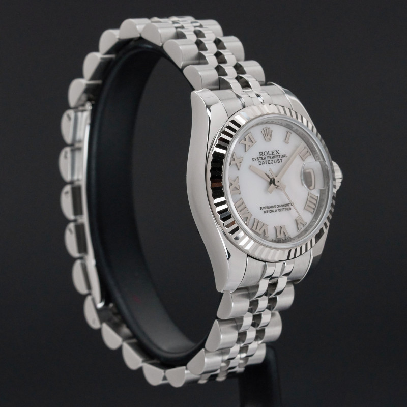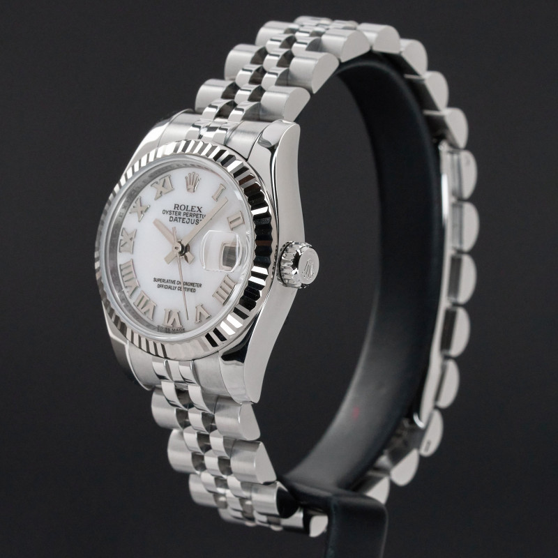 This Rolex Lady-Datejust 179174 features a Silver mother of pearl Roman dial and is crafted from stainless steel, with a production year of 2006.