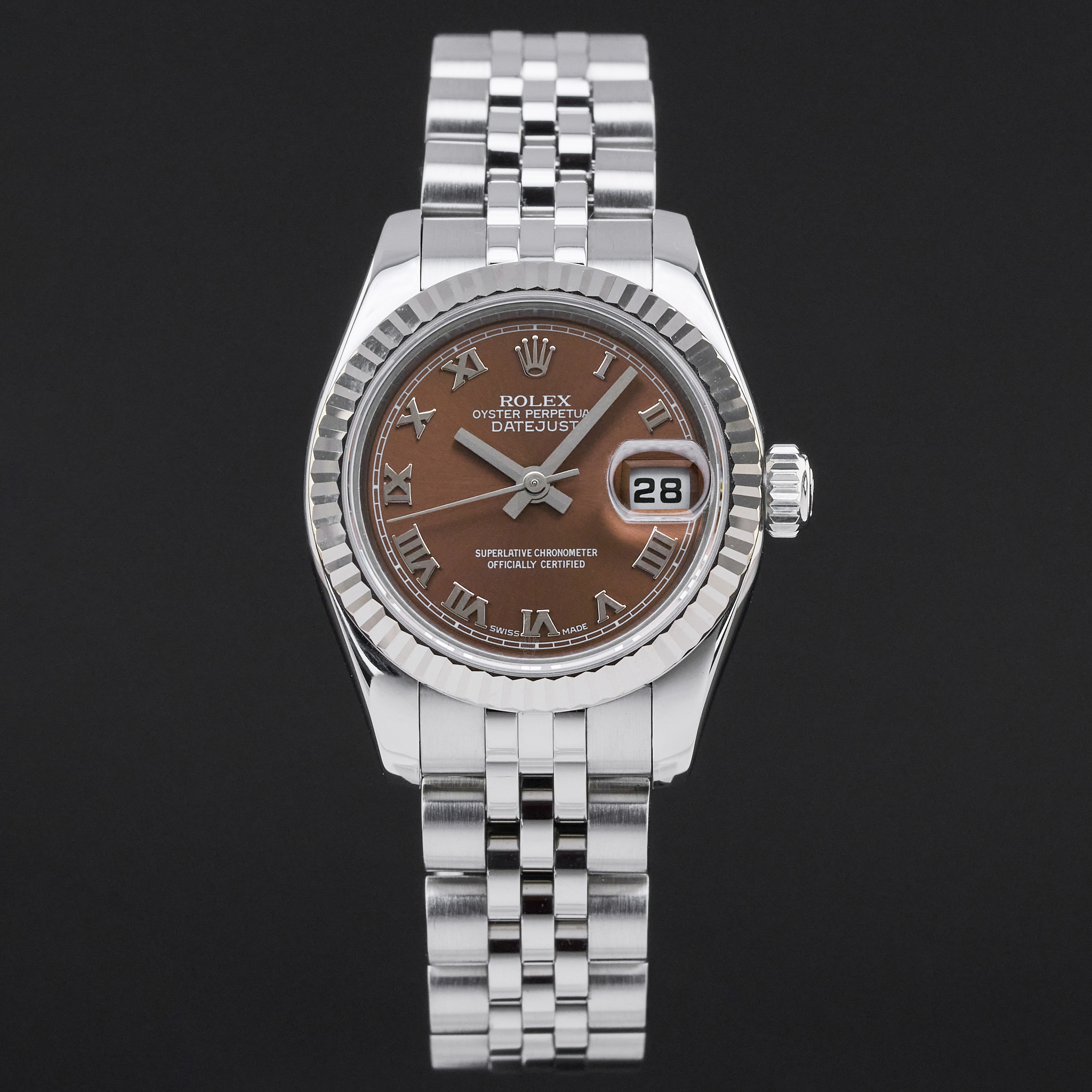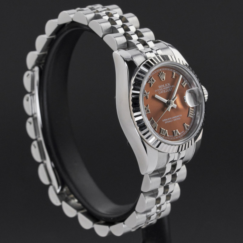 This Rolex Lady-Datejust 179174 features a Bronze Roman dial dial and is crafted from stainless steel, with a production year of 2007.