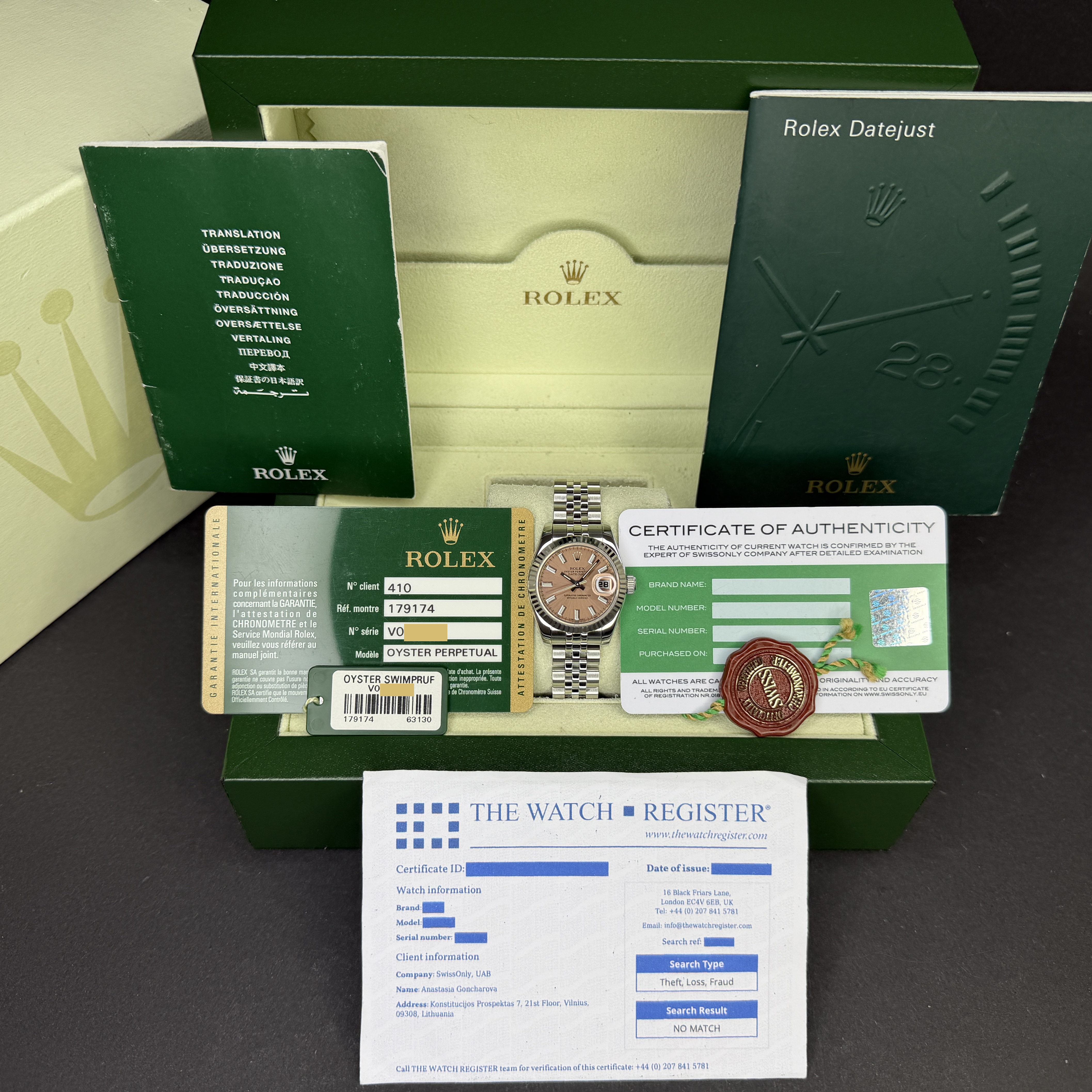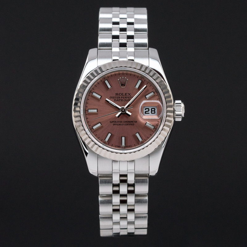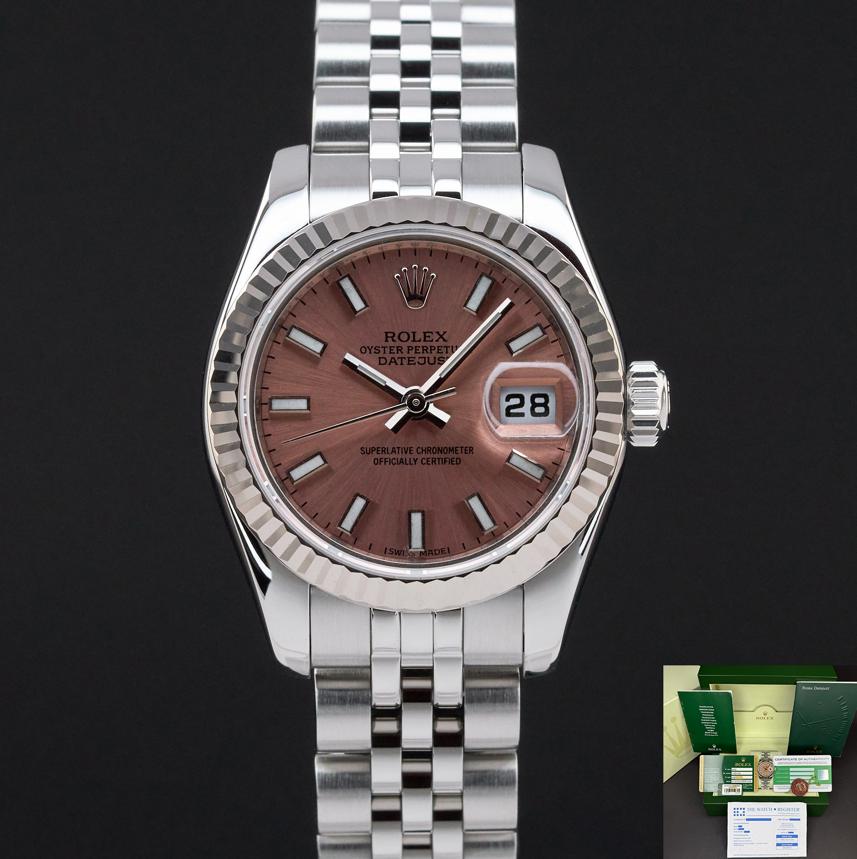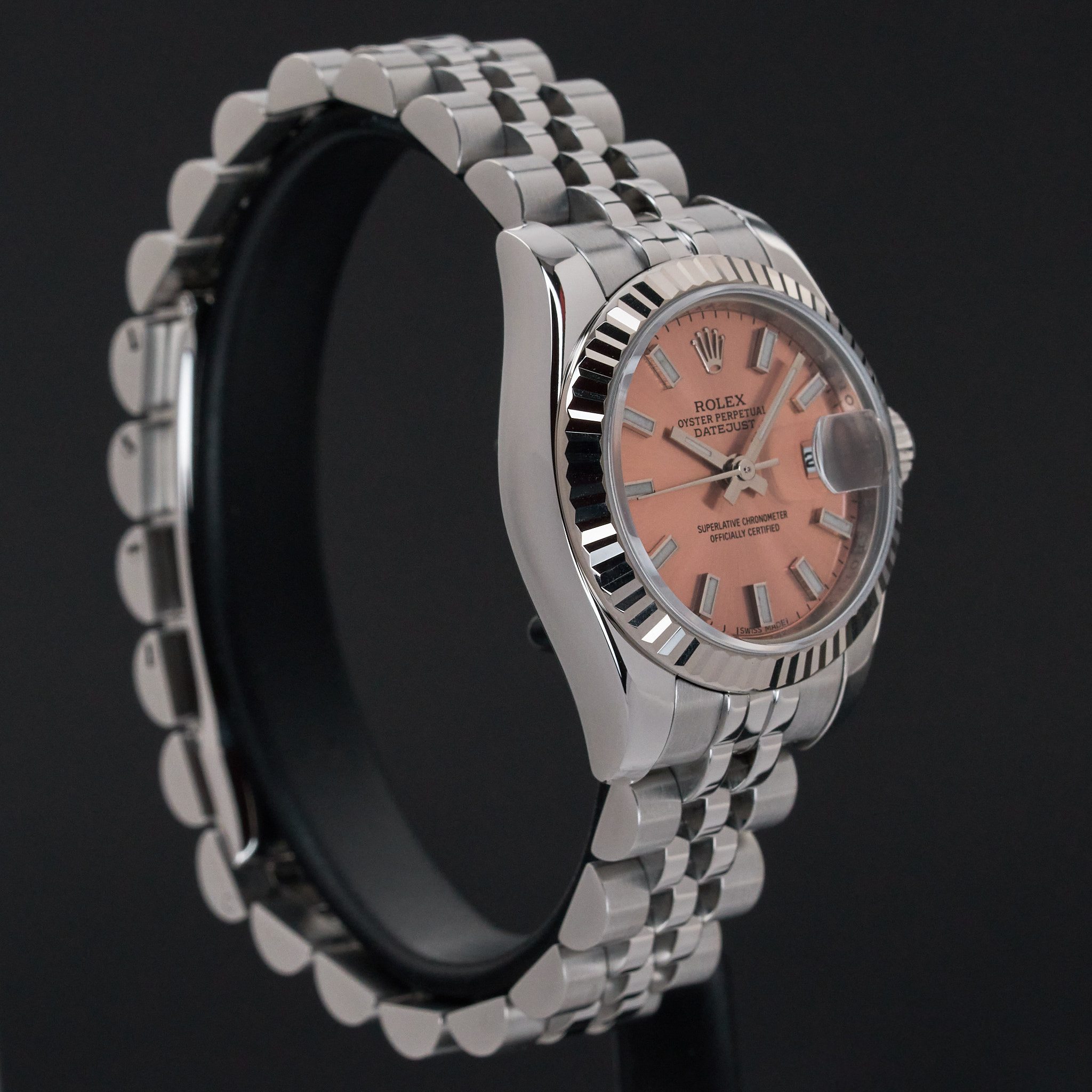 This Rolex Lady-Datejust 179174 features a Salmon dial dial and is crafted from stainless steel, with a production year of 2009.