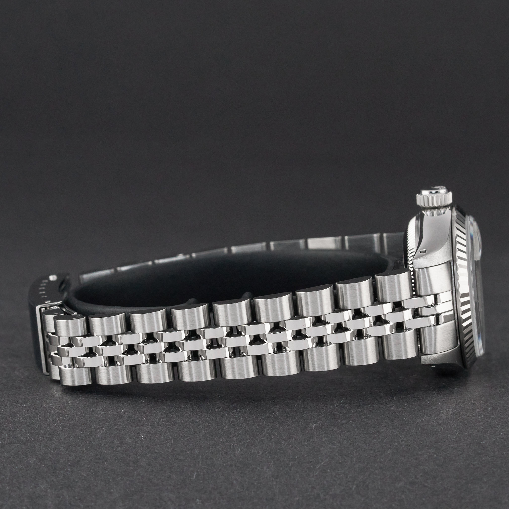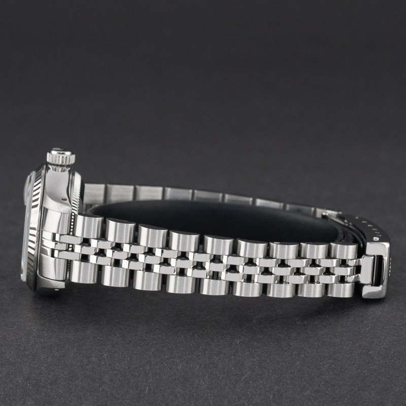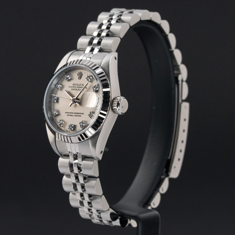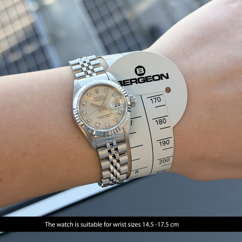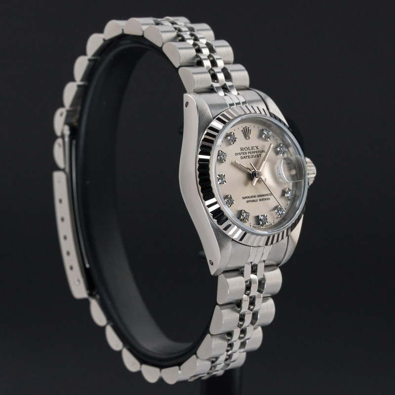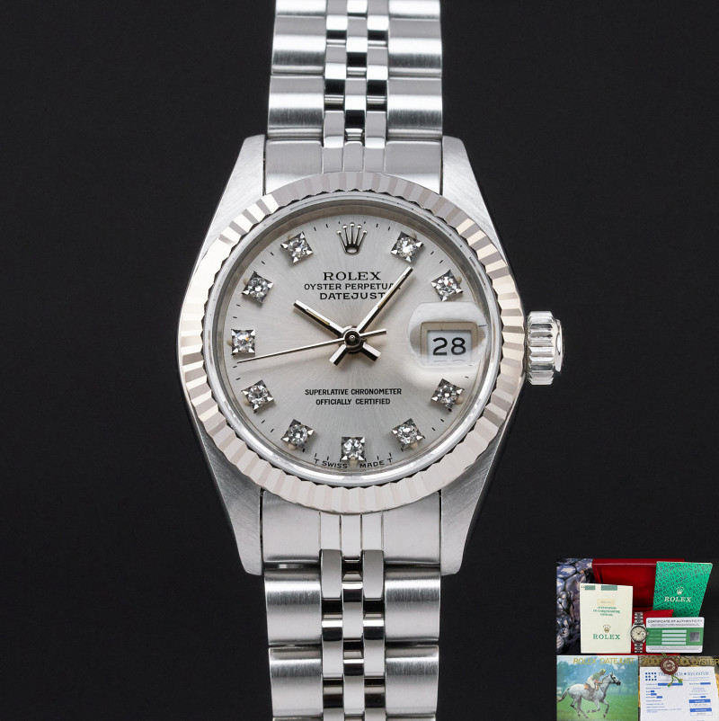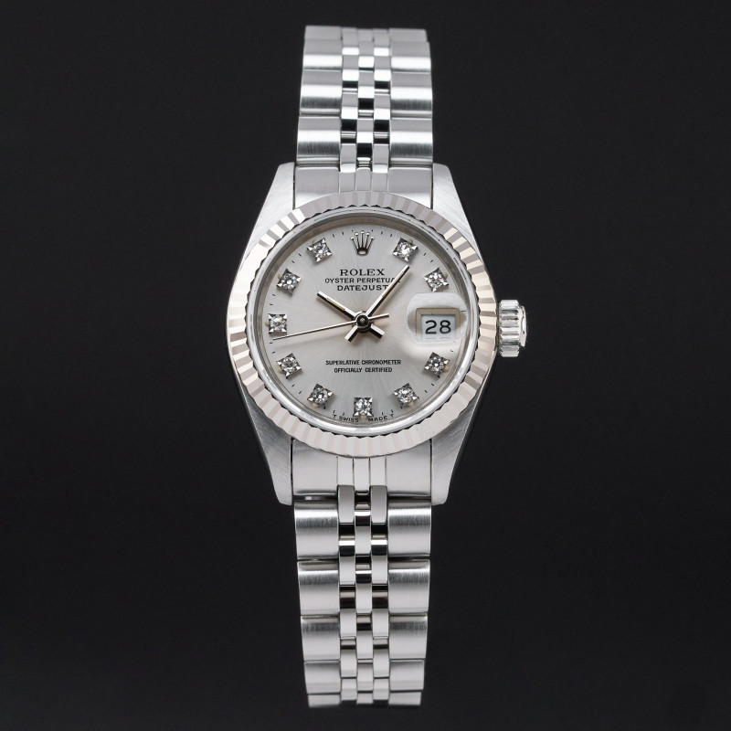This Rolex Lady-Datejust 69174 features a Silver Small Diamond dial and is crafted from stainless steel, with a production year of 1990.