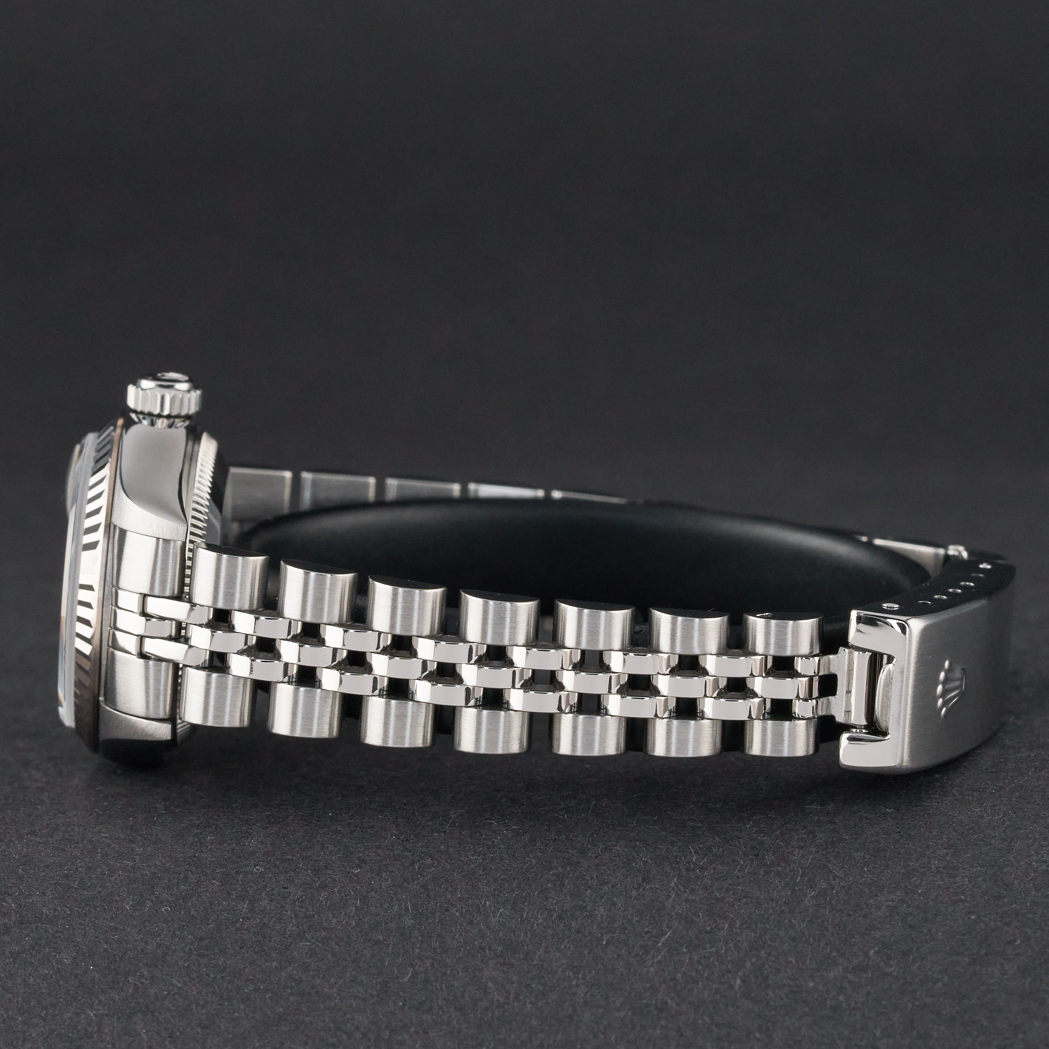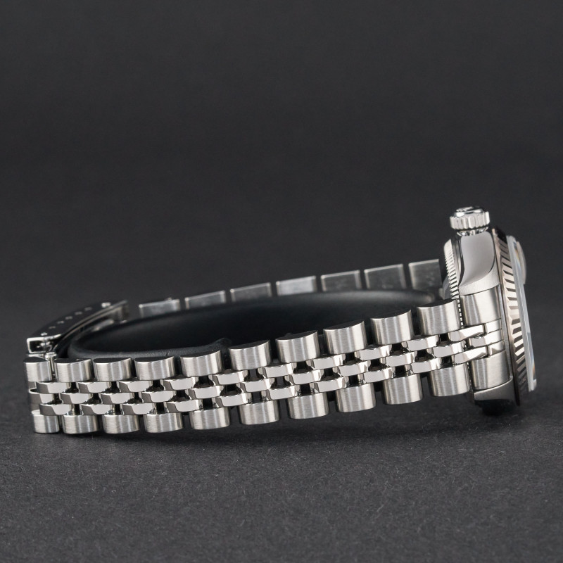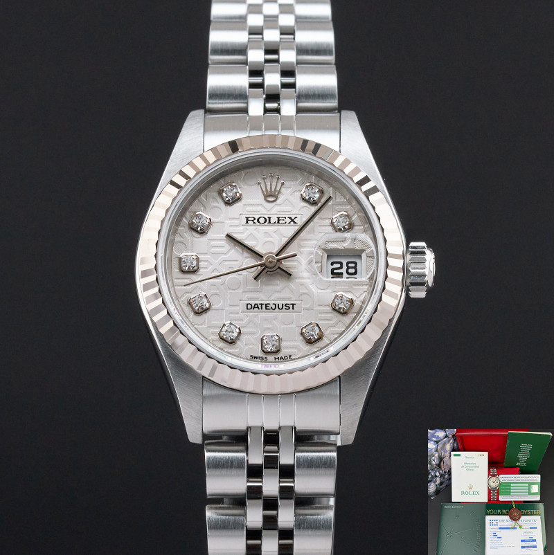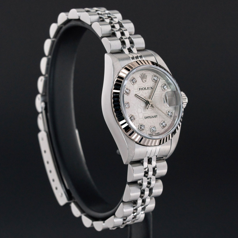 This Rolex Lady-Datejust 79174 features a Silver jubilee diamond dial and is crafted from stainless steel, with a production year of 2002.