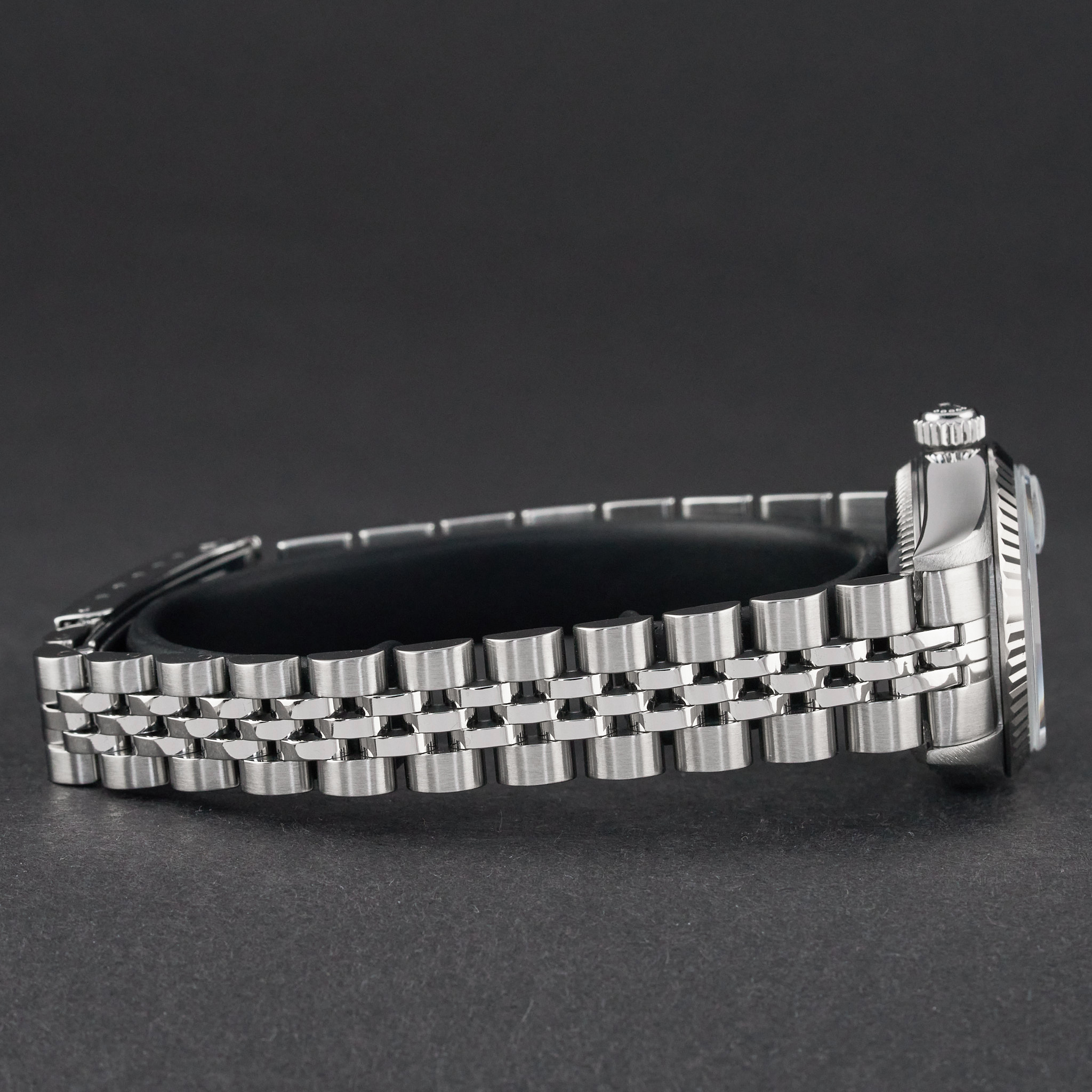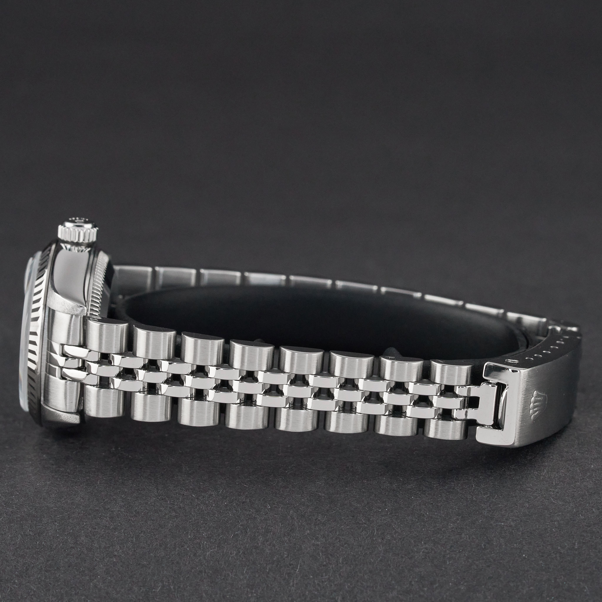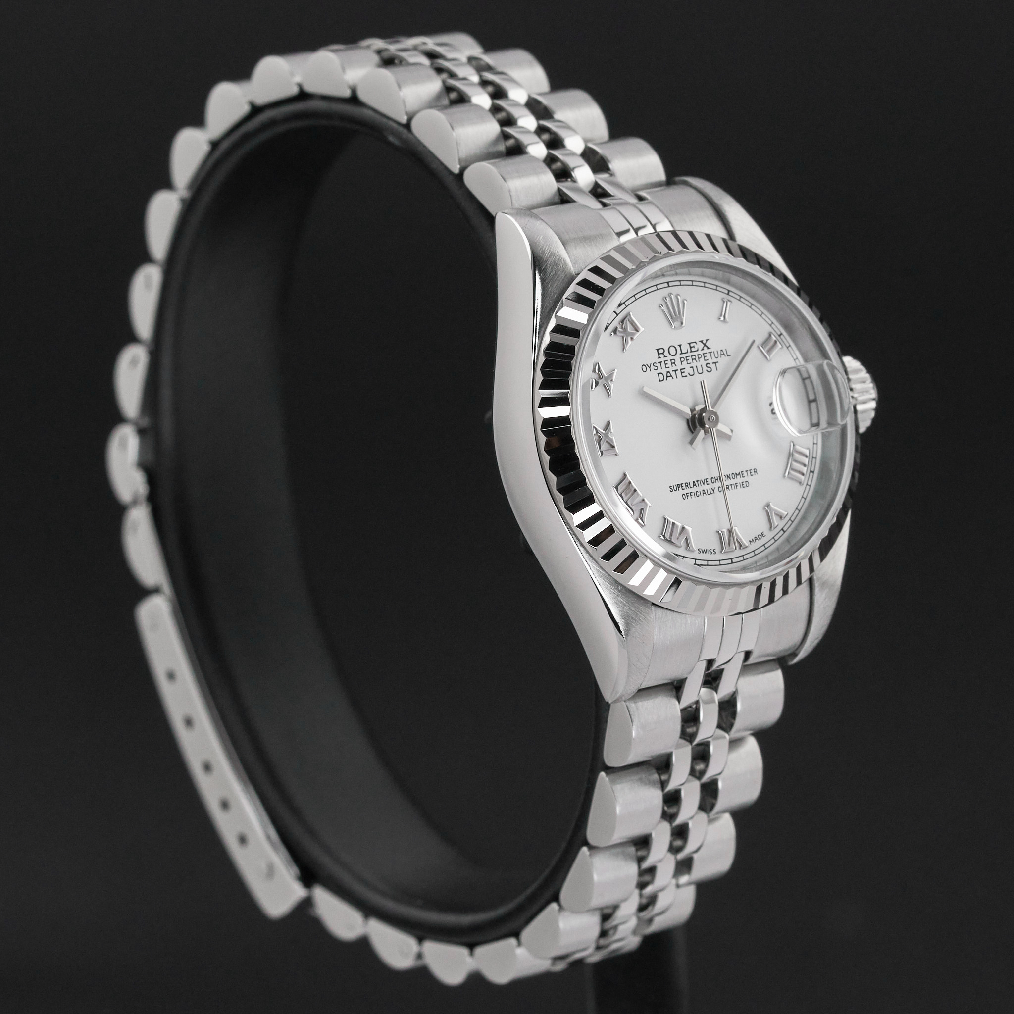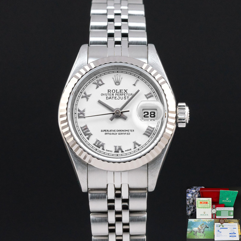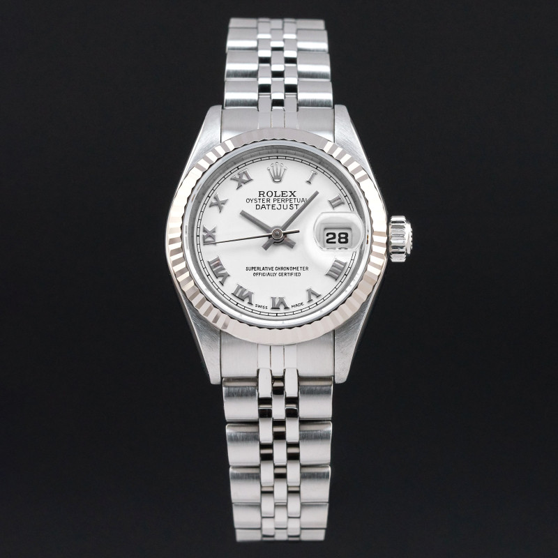 This Rolex Lady-Datejust 79174 features a White Roman dial and is crafted from stainless steel, with a production year of 2002.