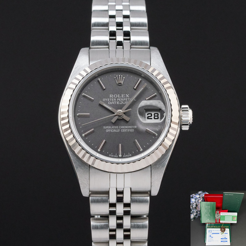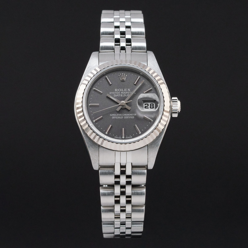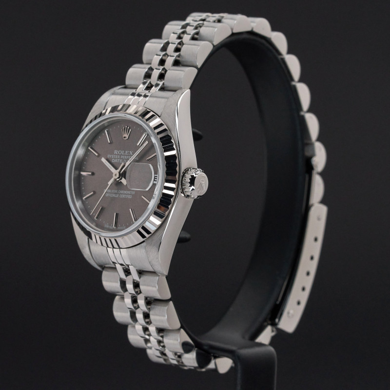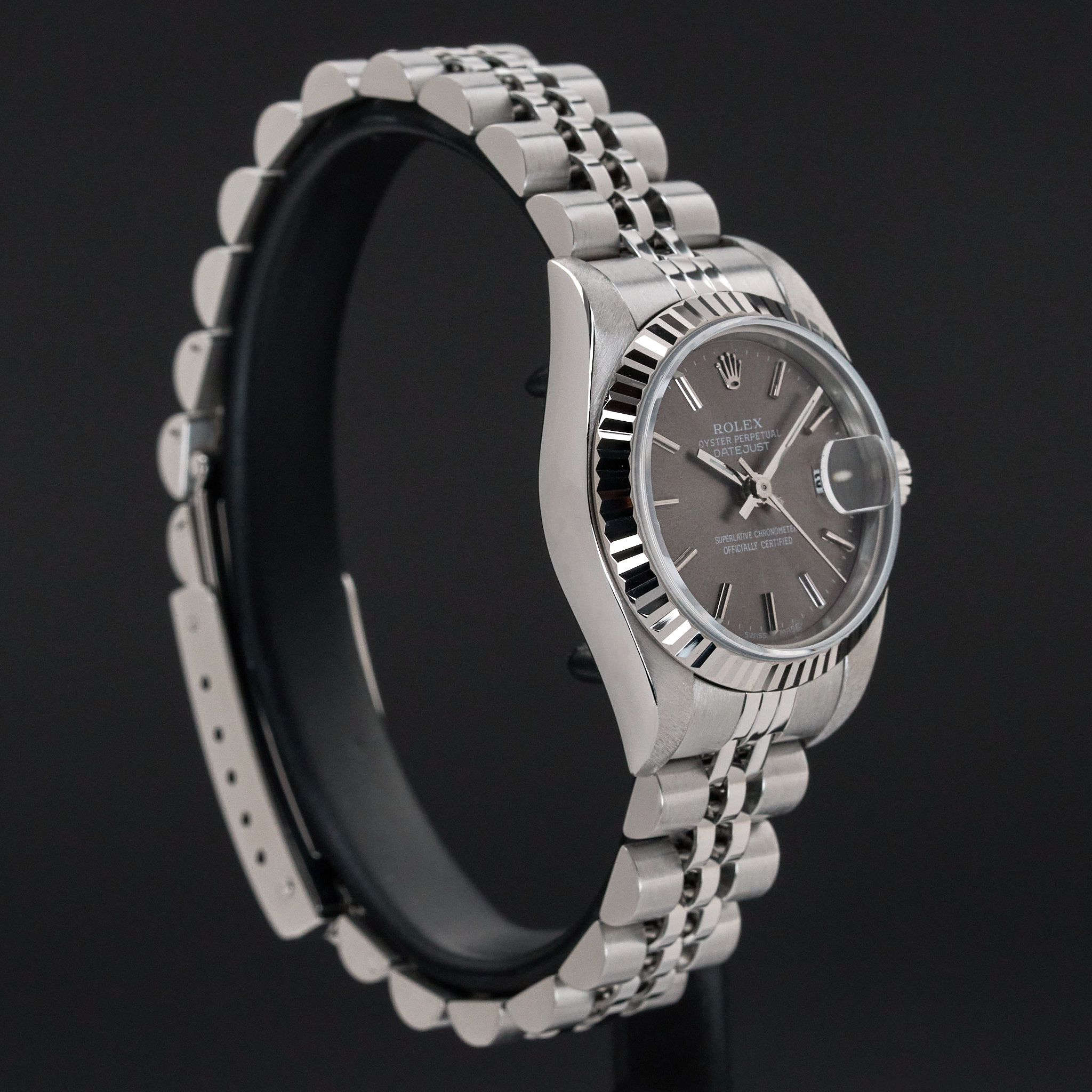 This Rolex Lady-Datejust 79174 features a Grey dial and is crafted from stainless steel, with a production year of 2005.