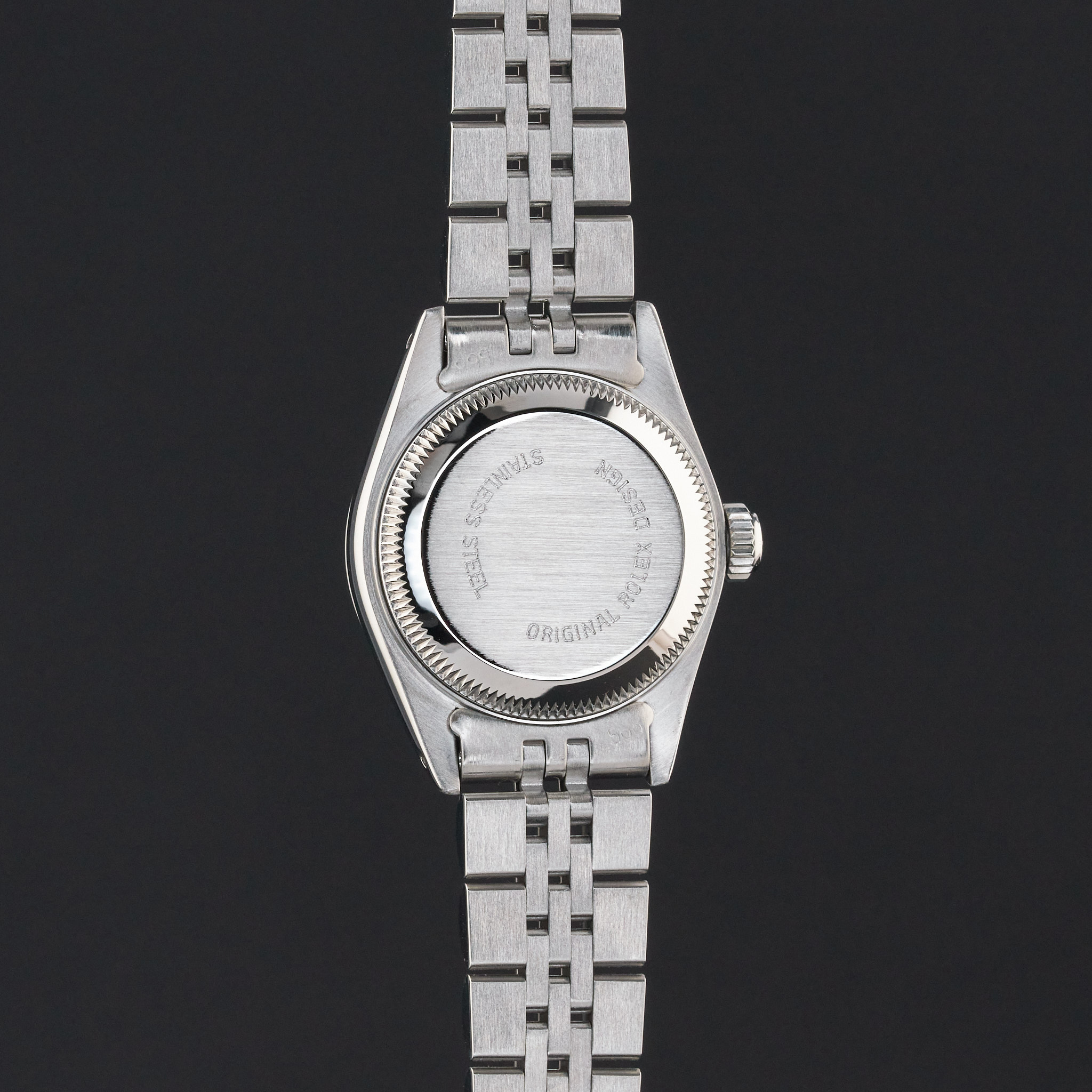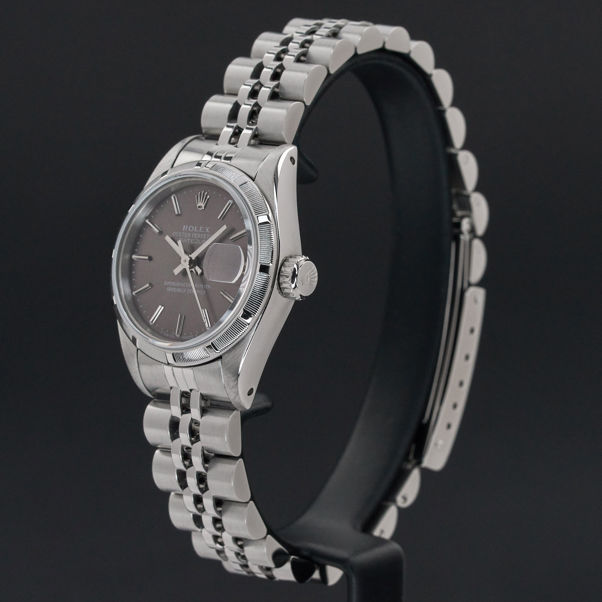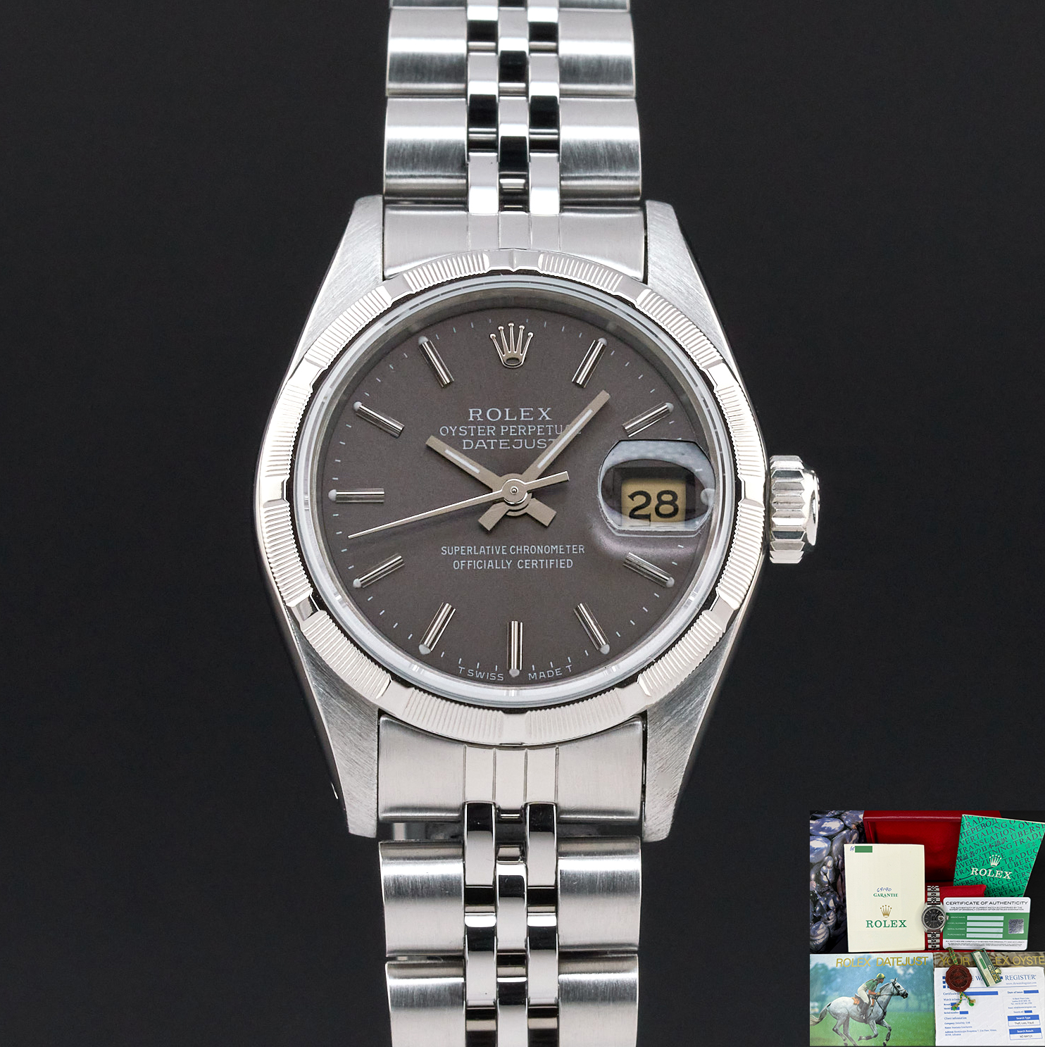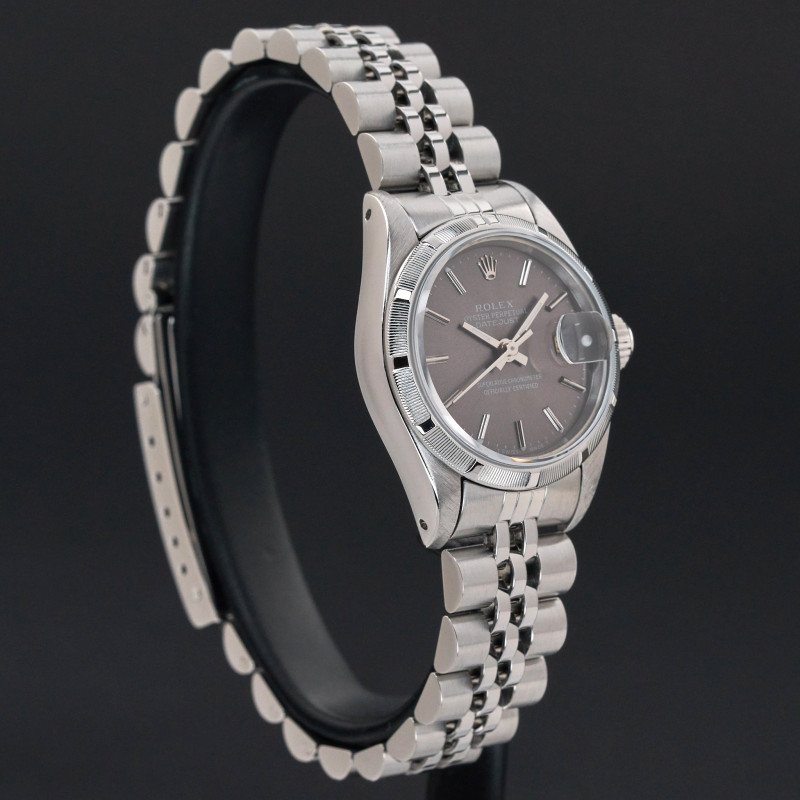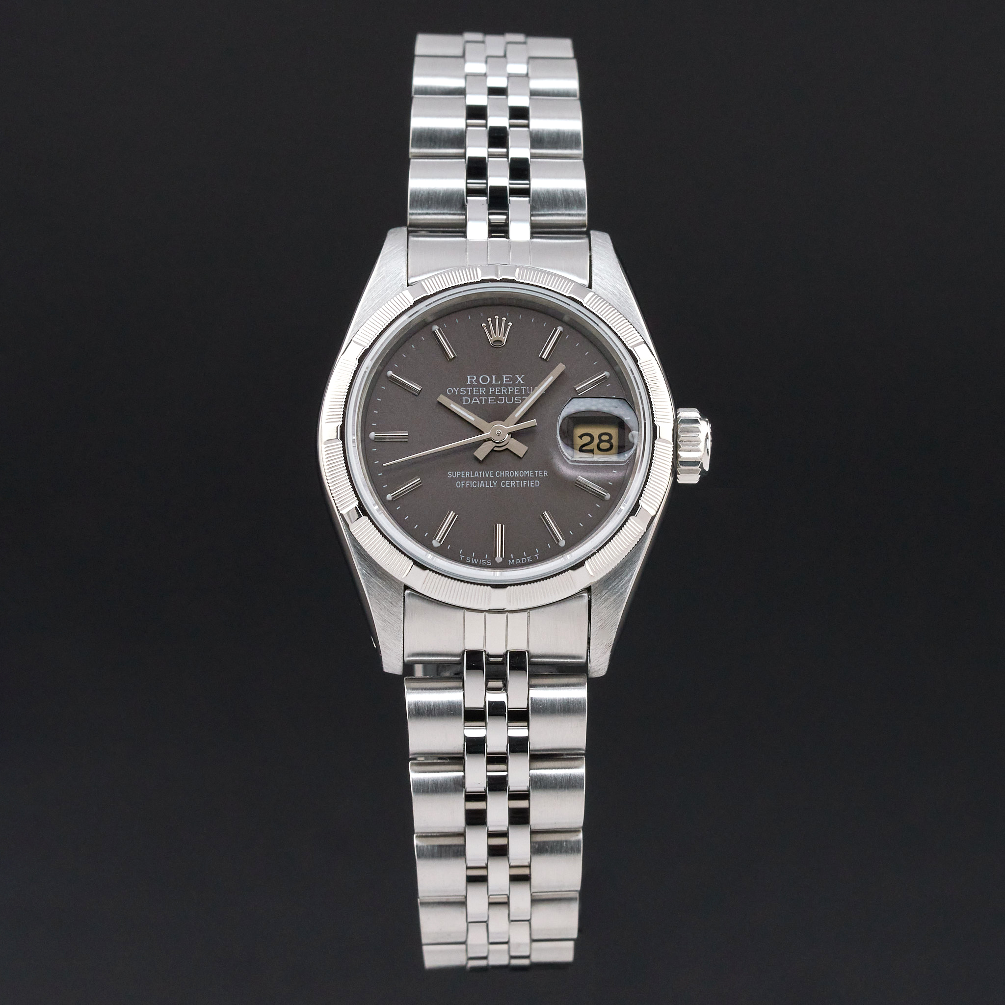This Rolex Oyster Perpetual Lady Date 69190 features a Grey dial and is crafted from stainless steel, with a production year of 1984.