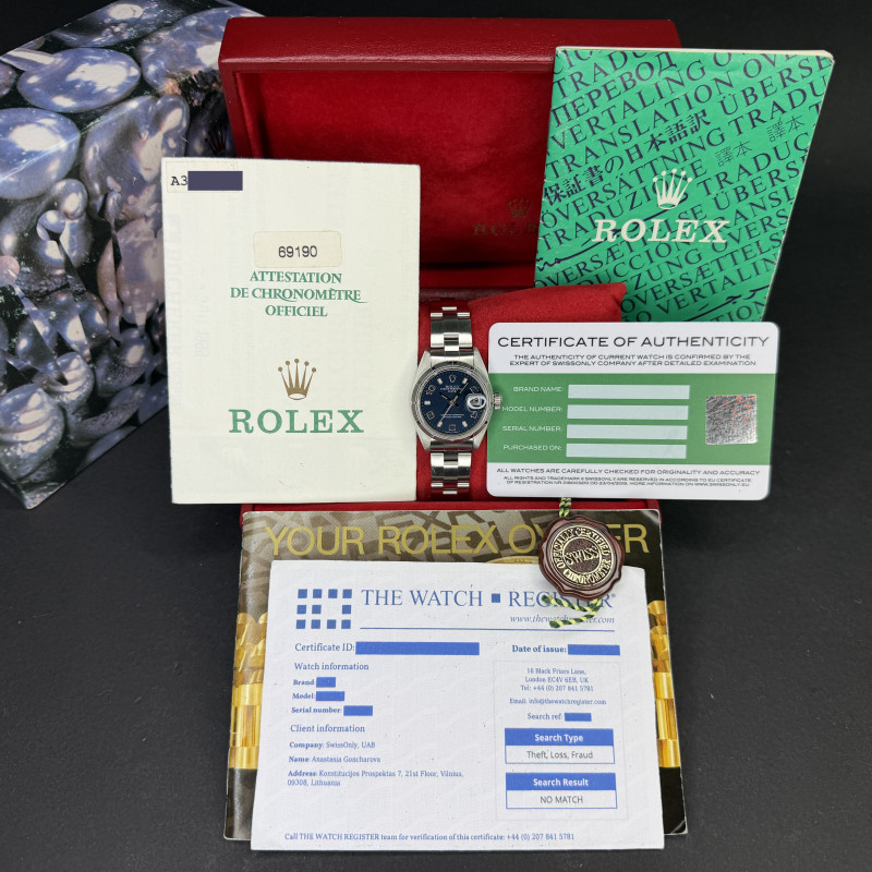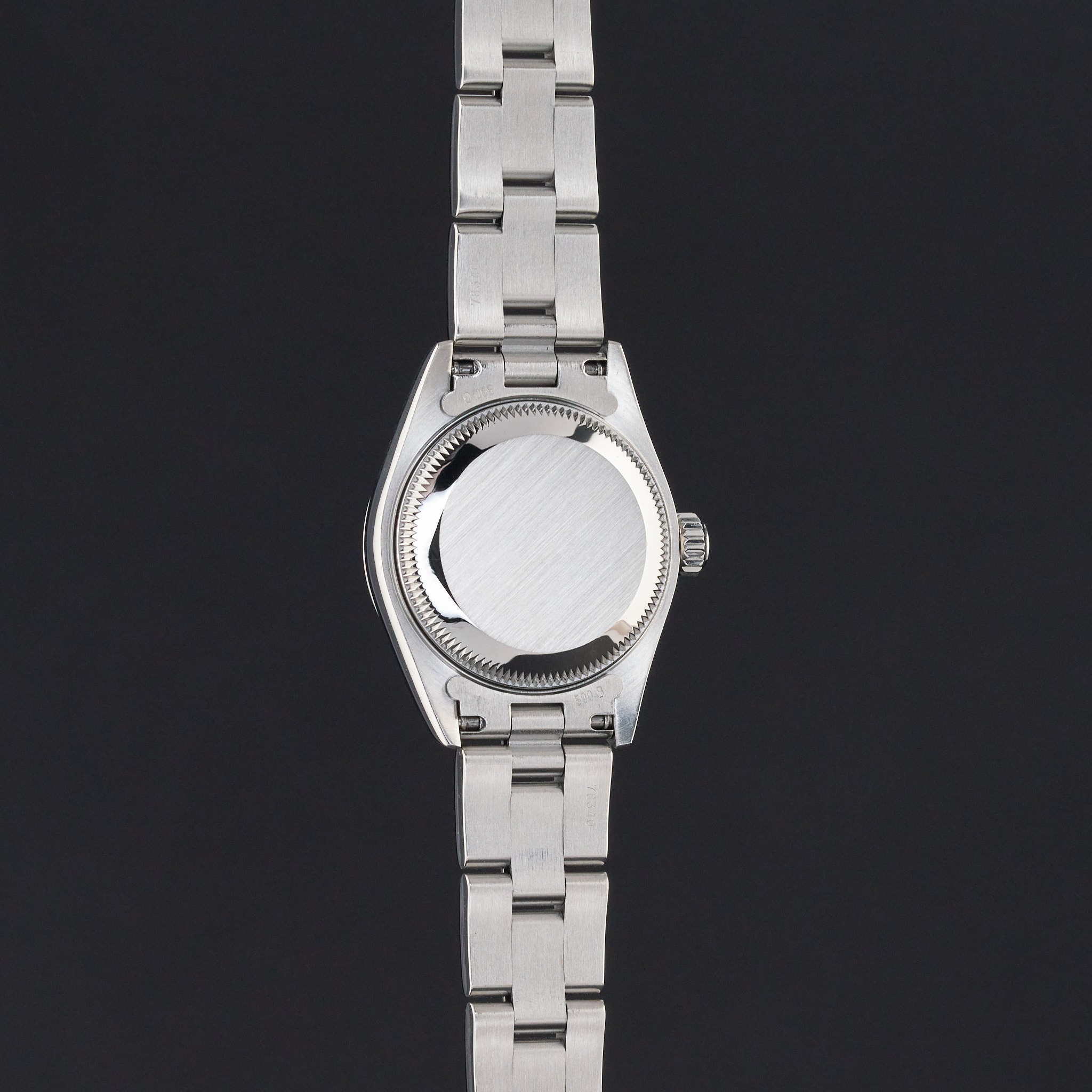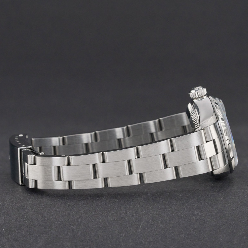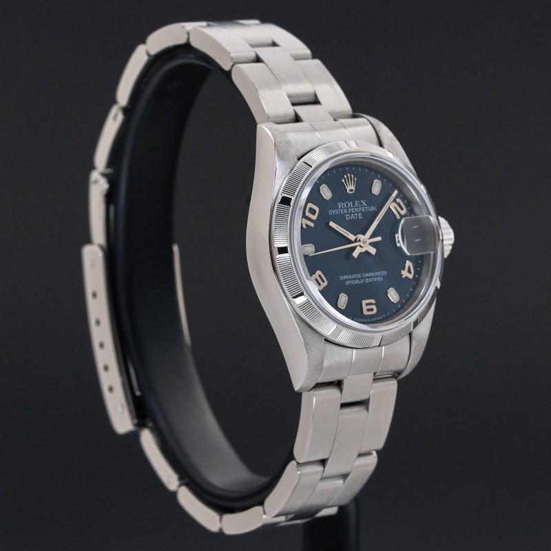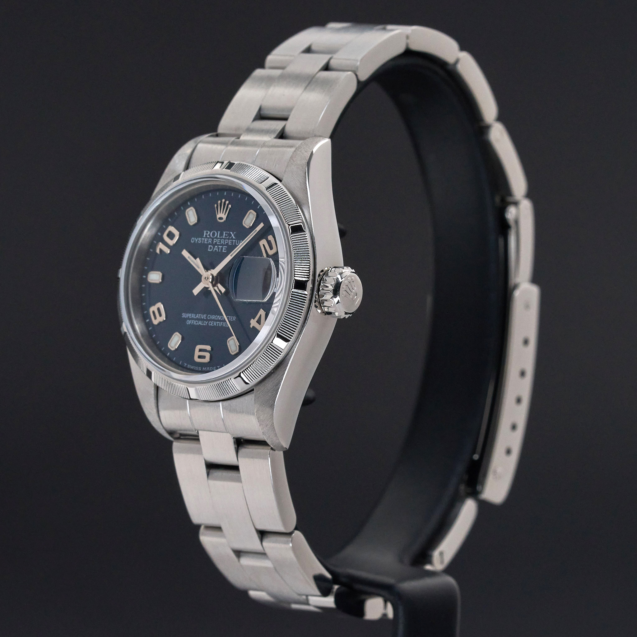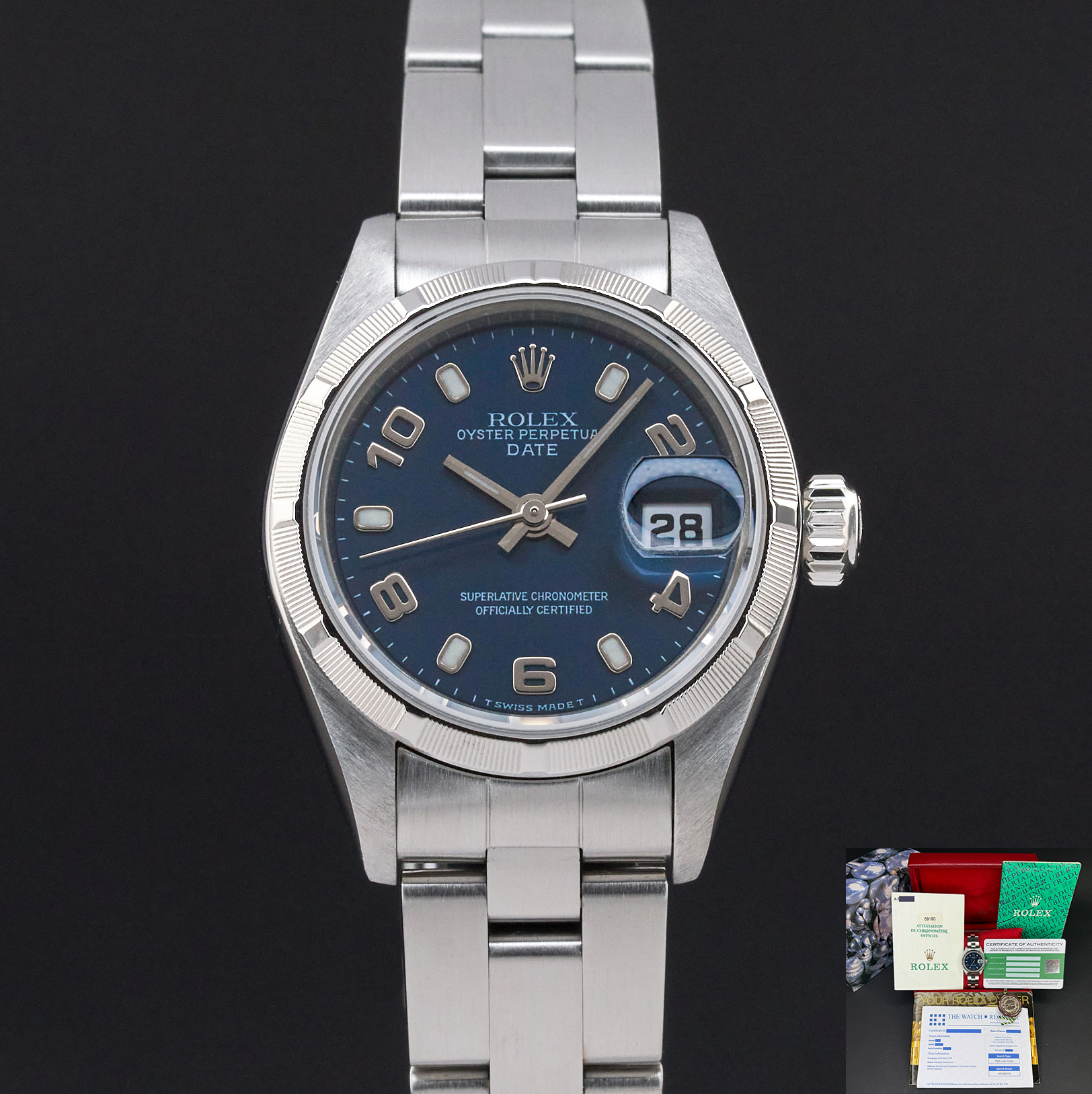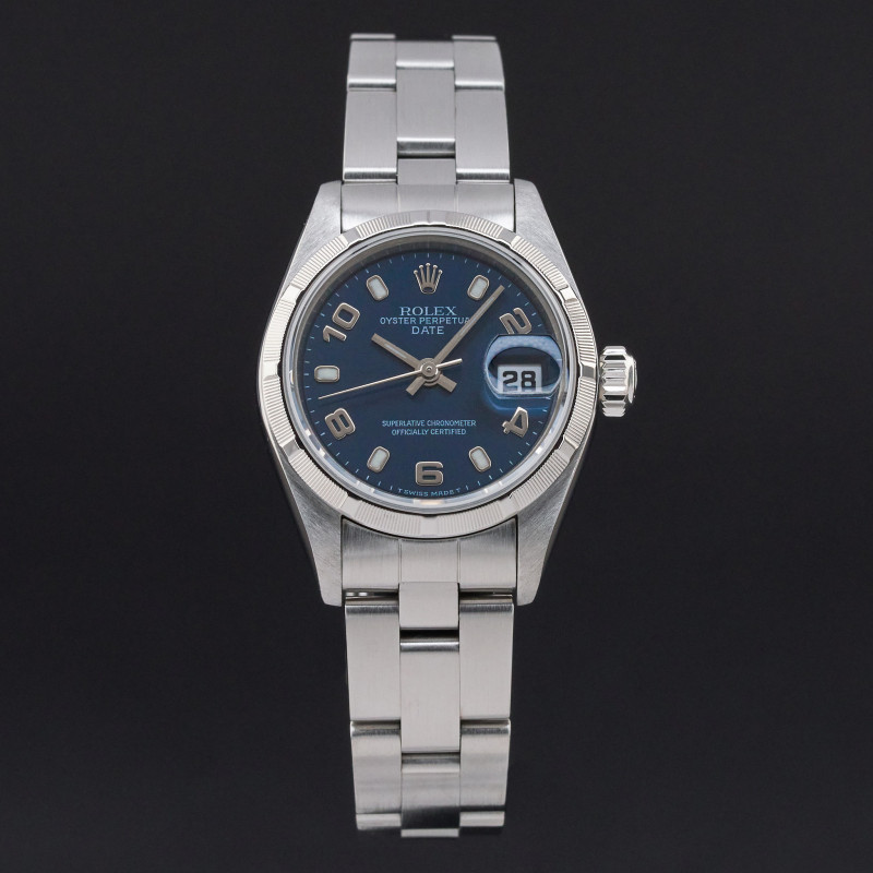 This Rolex Oyster Perpetual Lady Date 69190 features a Blue Arabic dial and is crafted from stainless steel, with a production year of 1999.