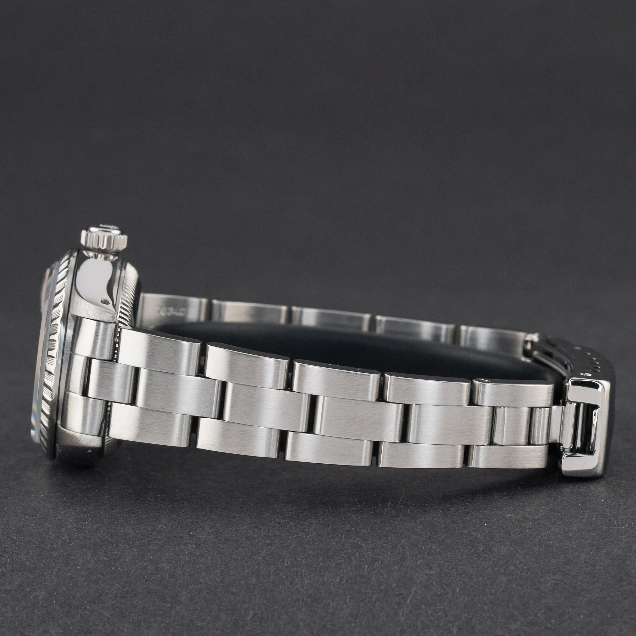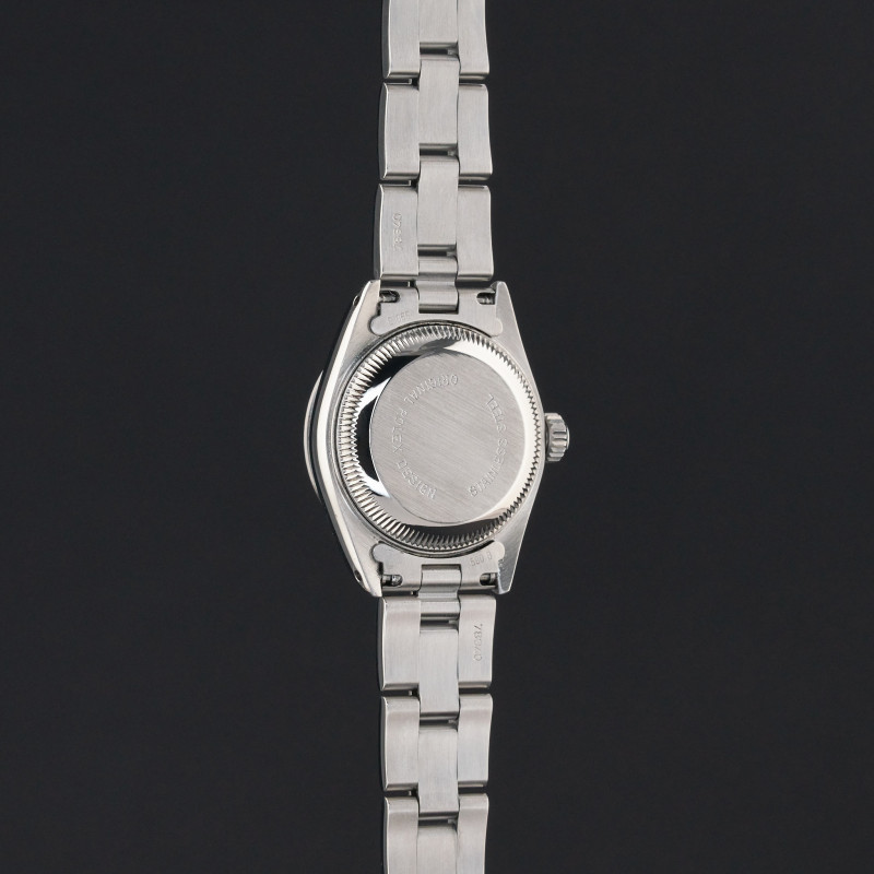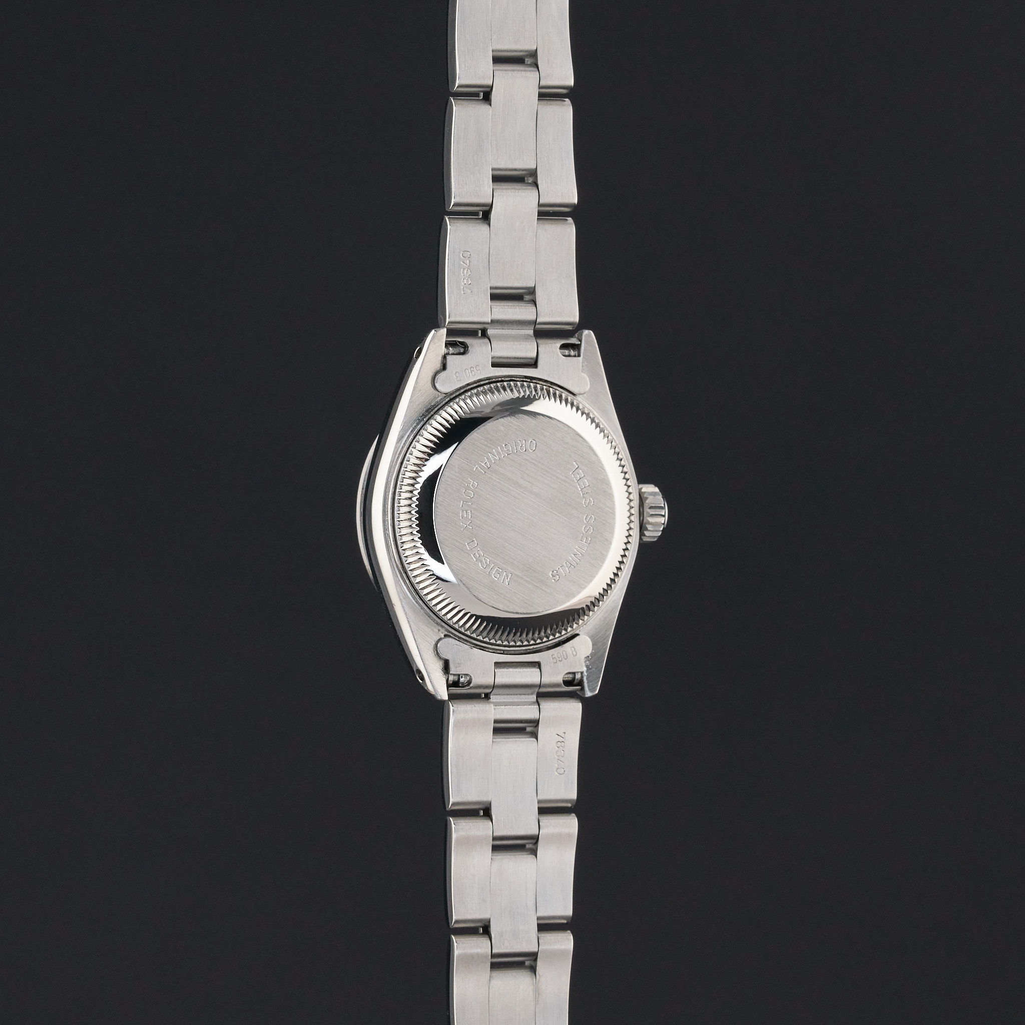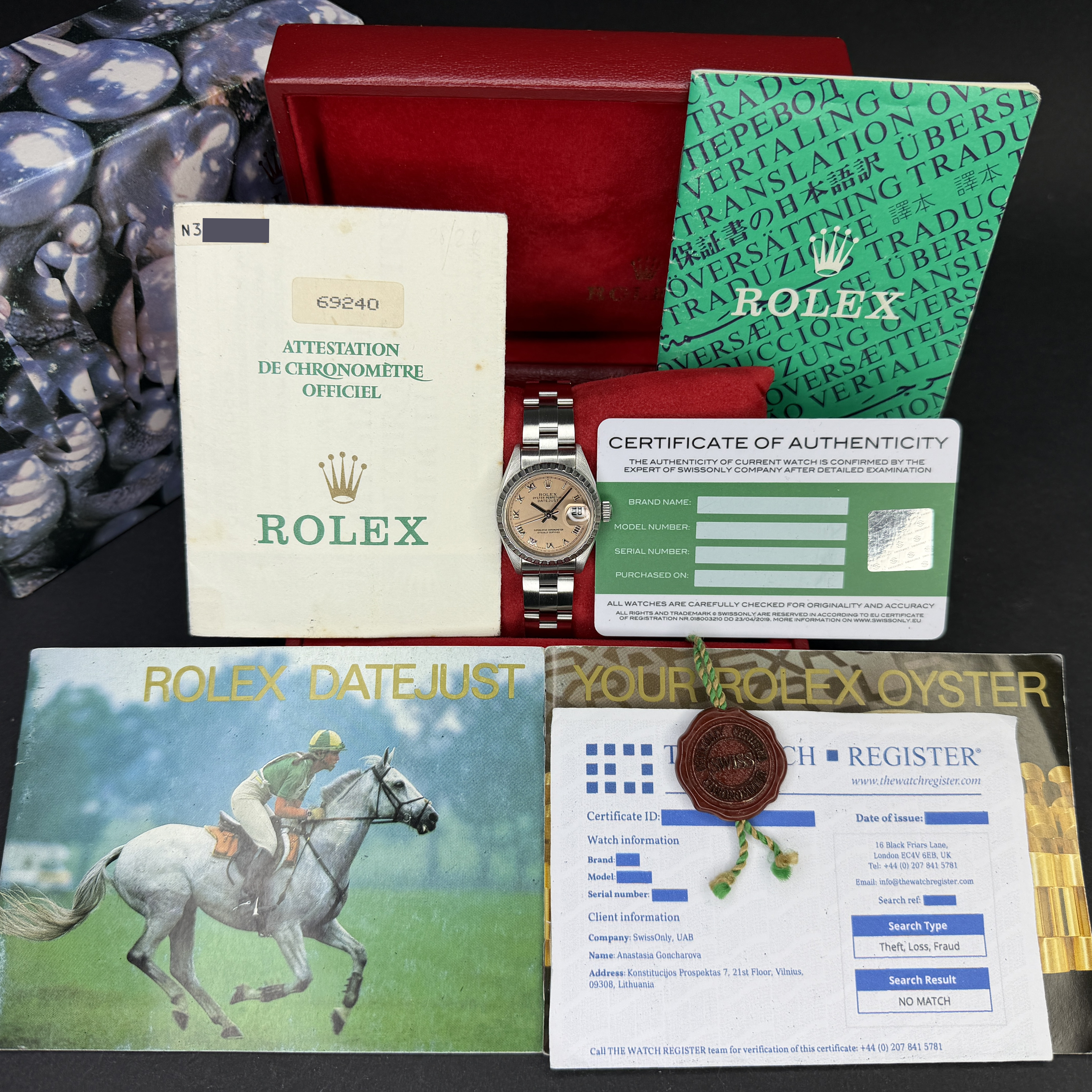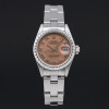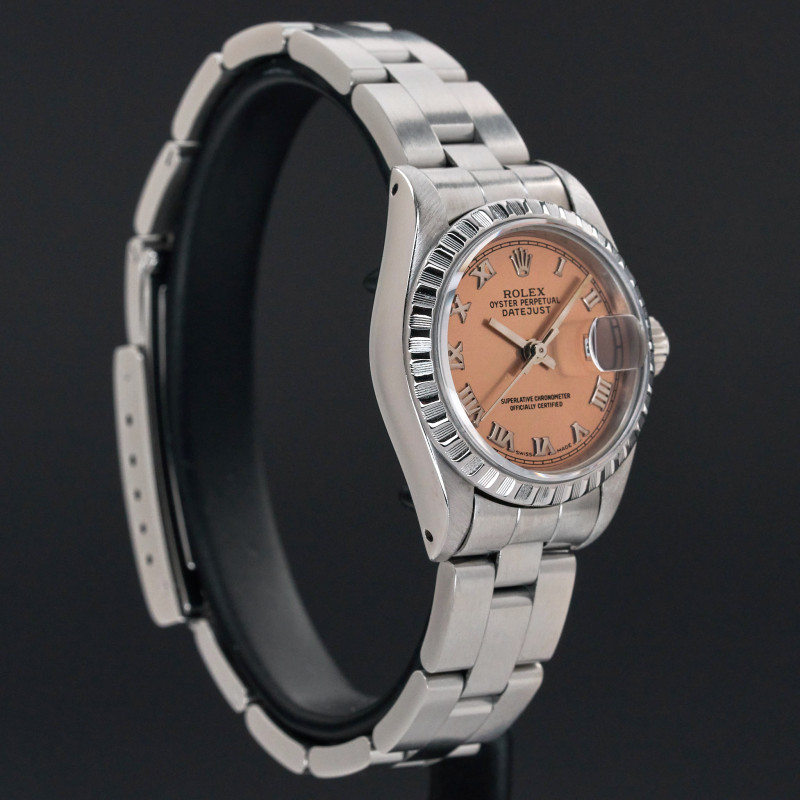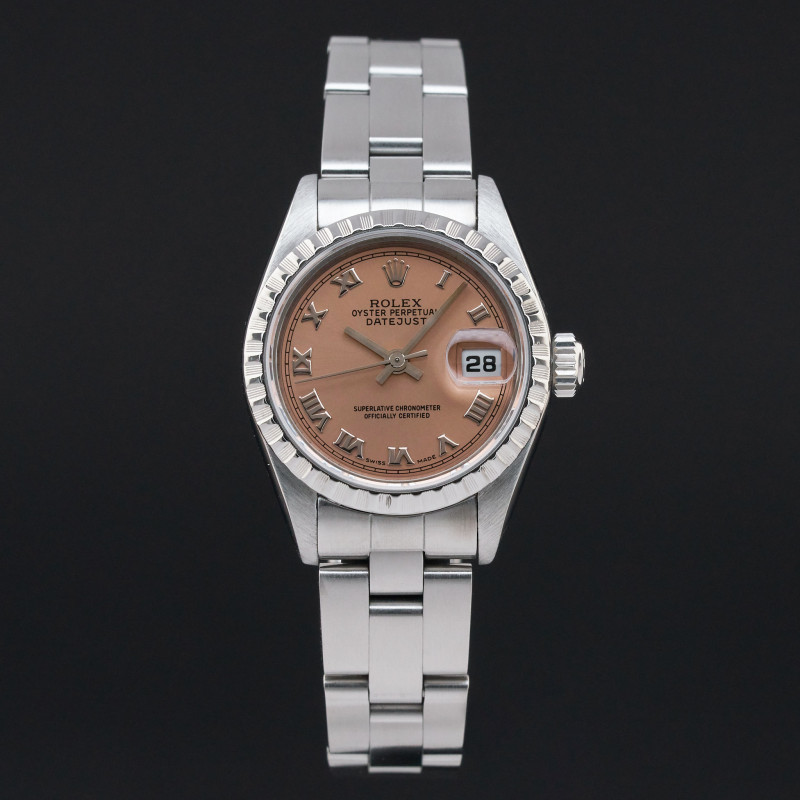 This Rolex Oyster Perpetual Date Lady 69240 features a Salmon Roman dial and is crafted from stainless steel, with a production year of 1991.