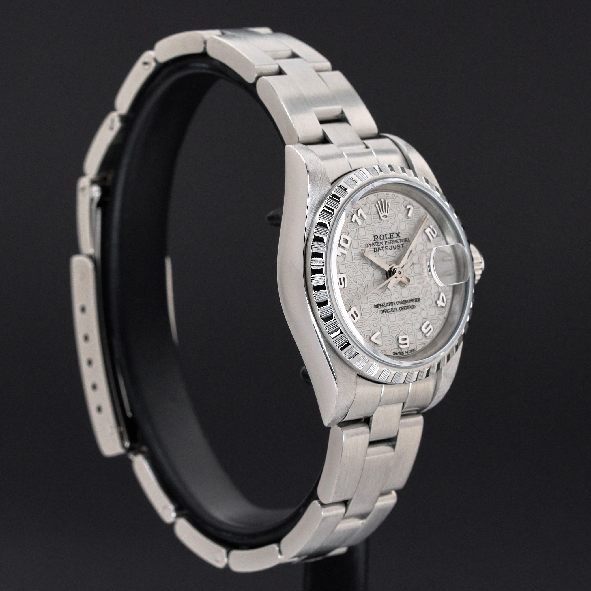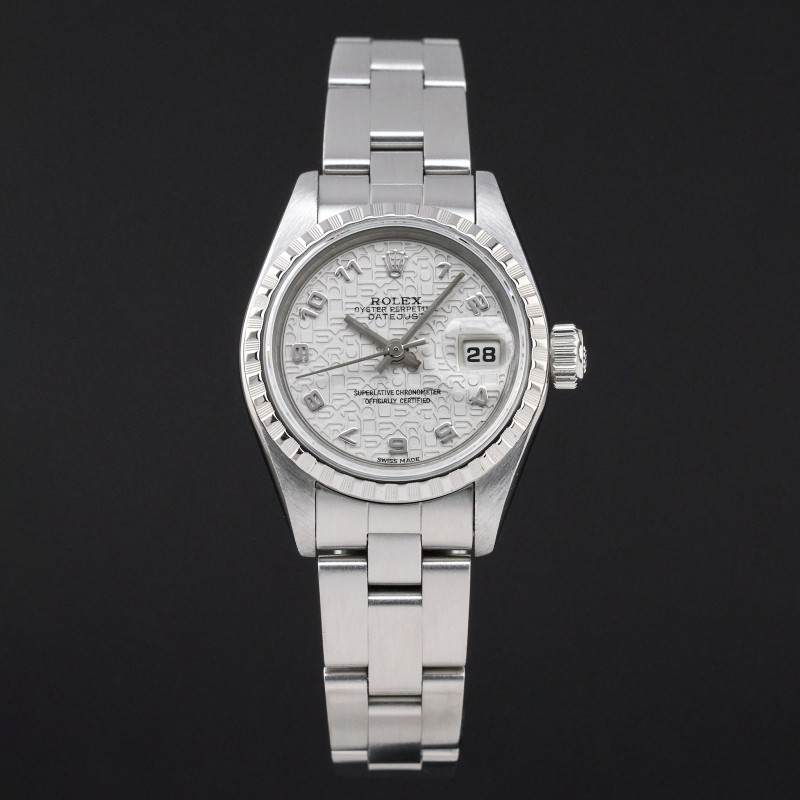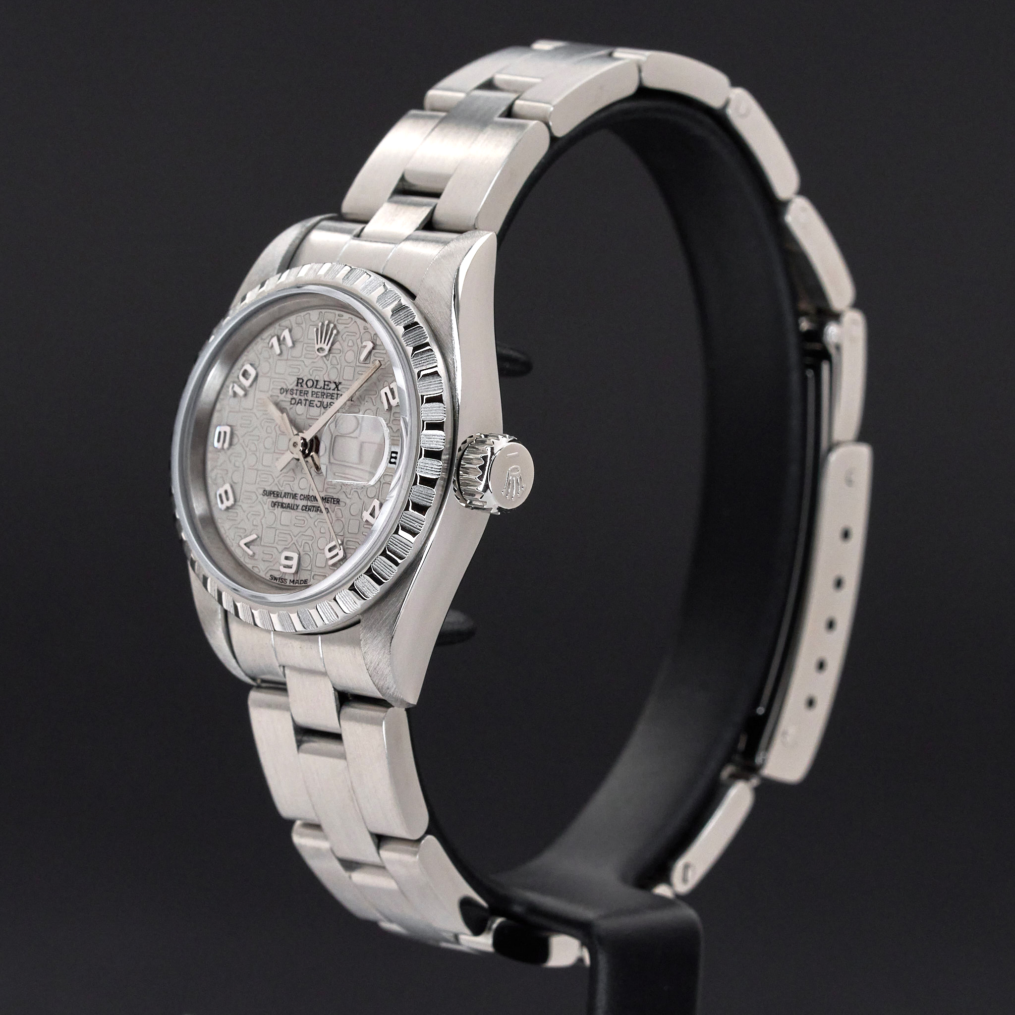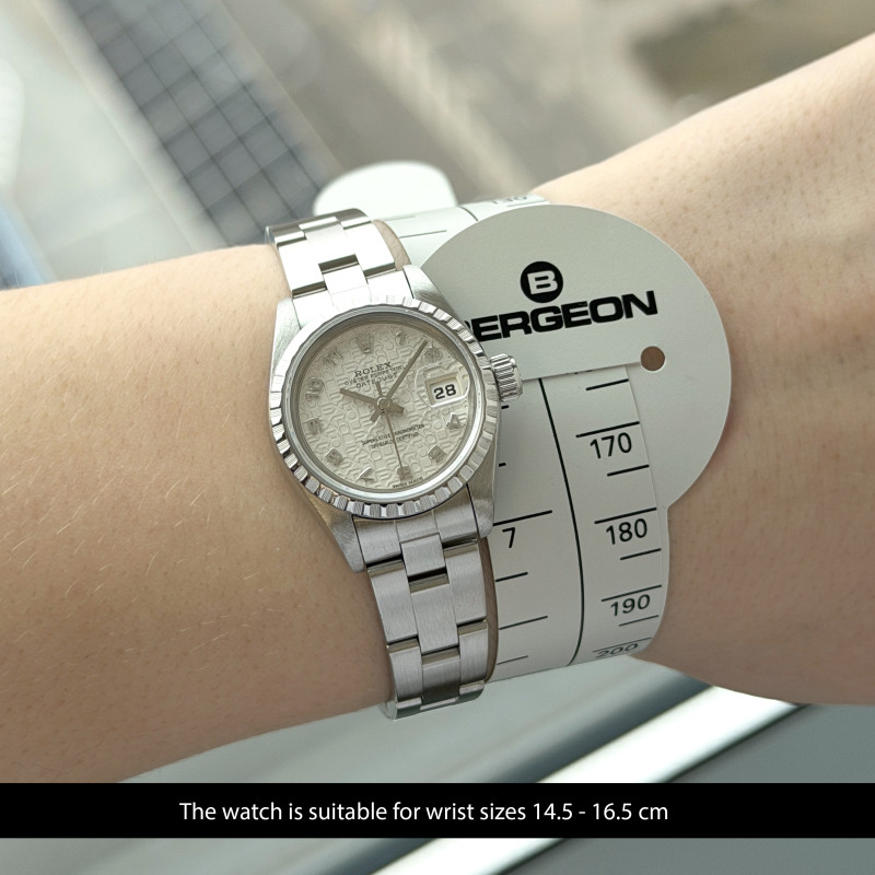 This Rolex Oyster Perpetual Date Lady 69240 features an Ivory jubilee Arabic dial and is crafted from stainless steel, with a production year of 1996.