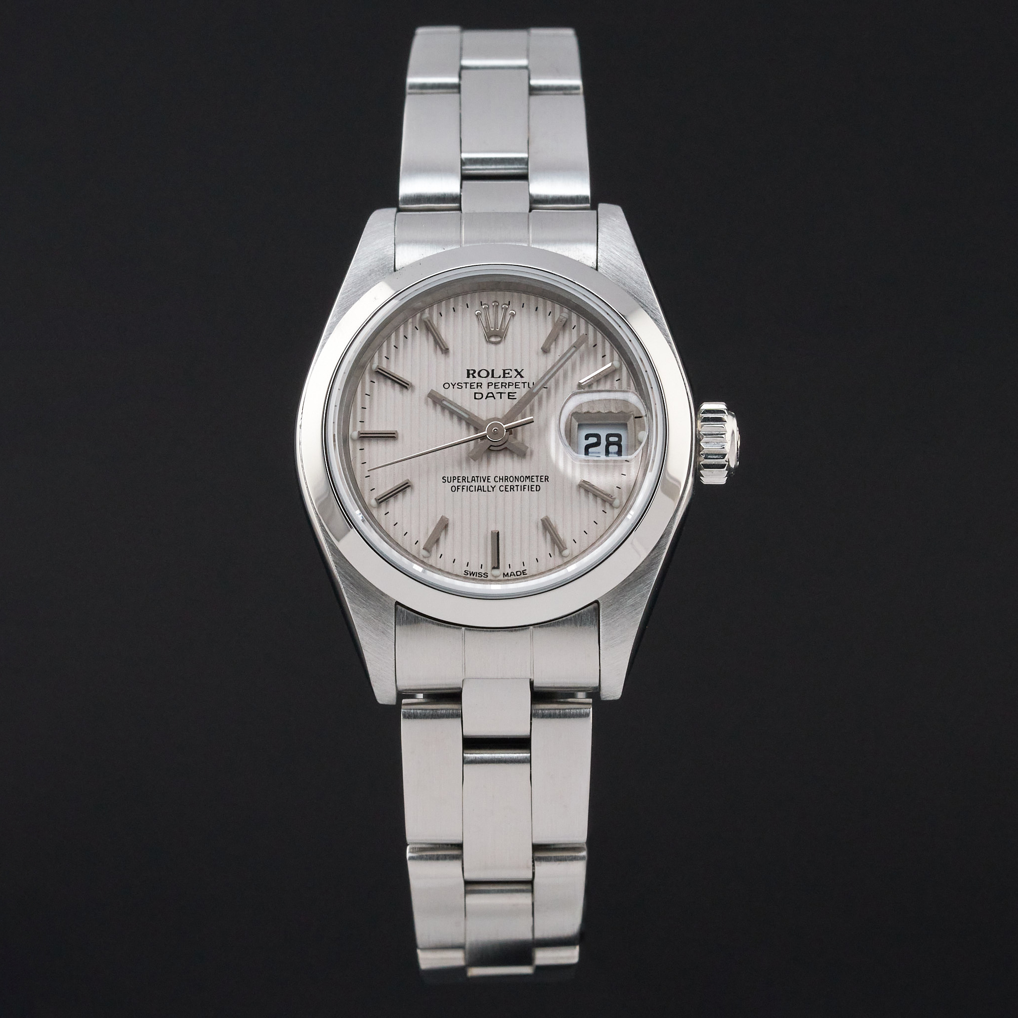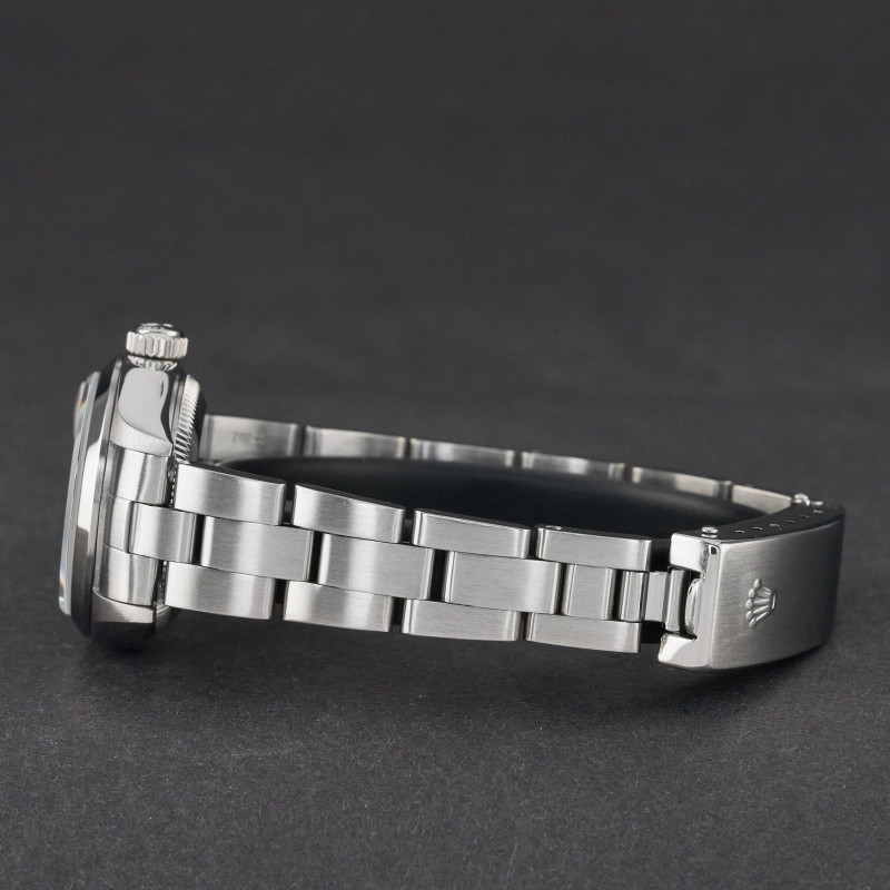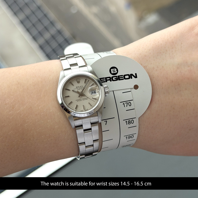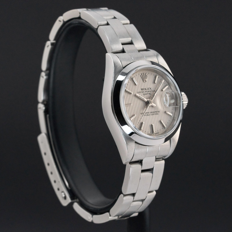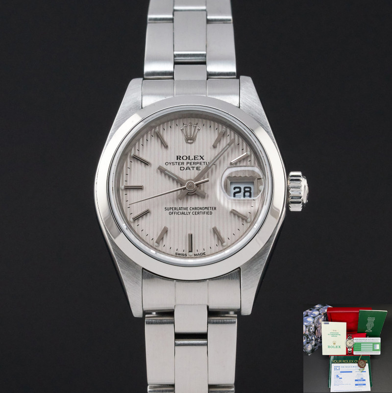 This Rolex Oyster Perpetual Lady Date 79160 features a Silver tapestry dial and is crafted from stainless steel, with a production year of 2000.