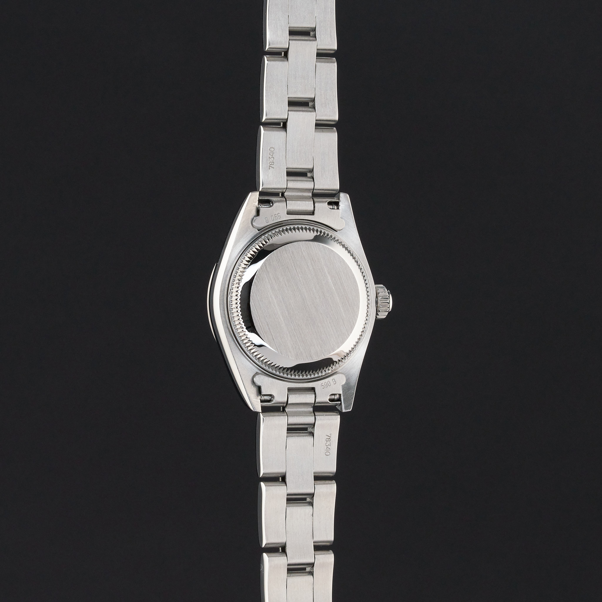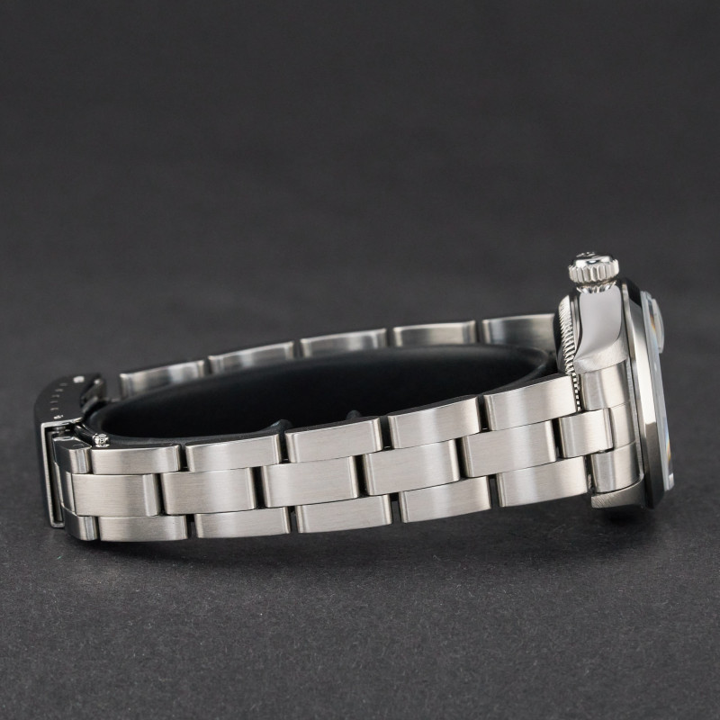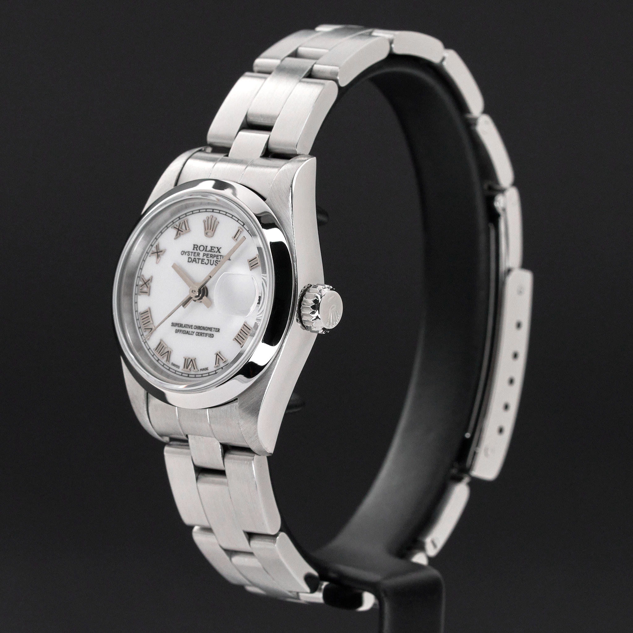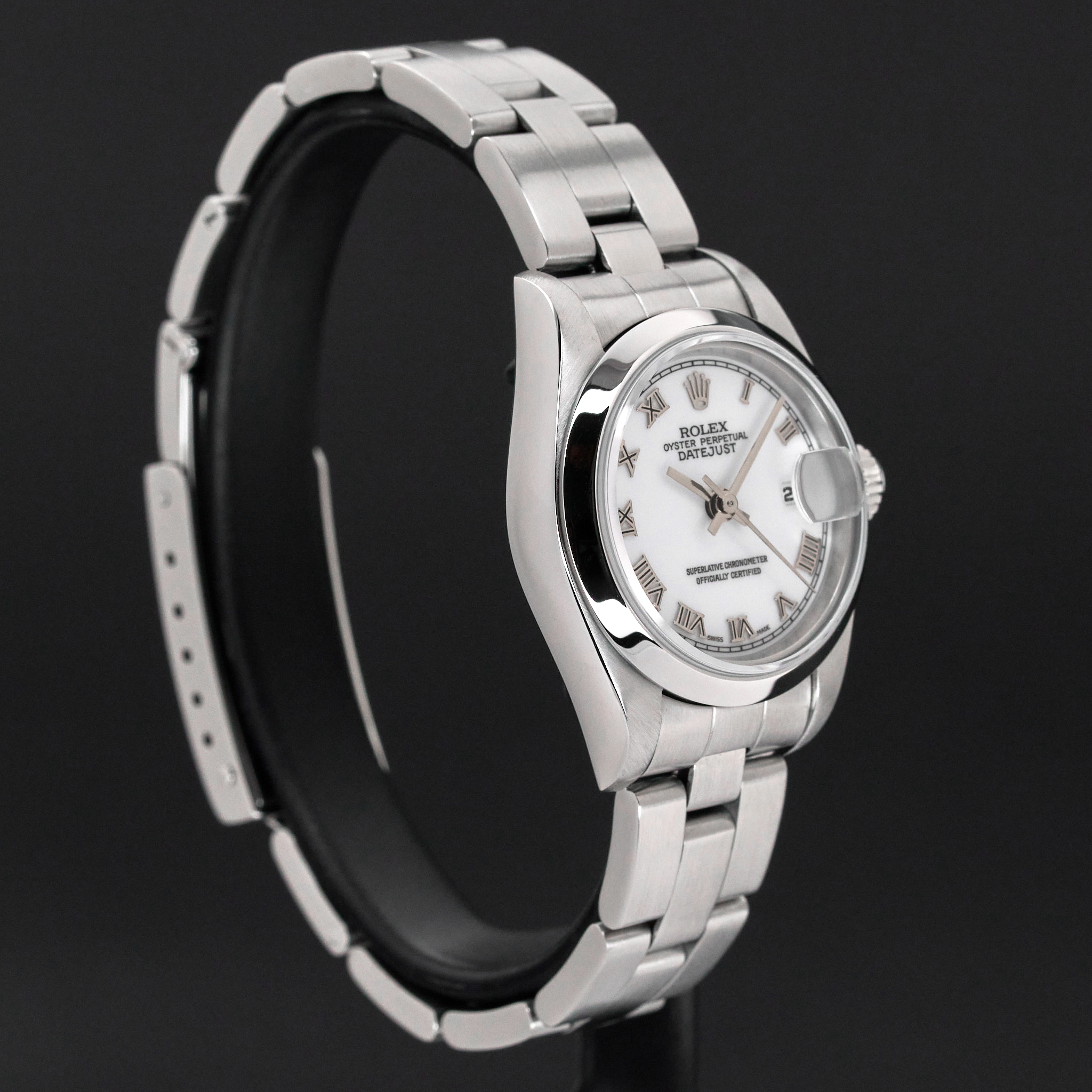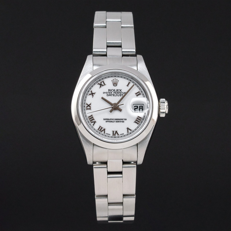 This Rolex Oyster Perpetual Lady Date 79160 features a White Roman dial and is crafted from stainless steel, with a production year of 2000.