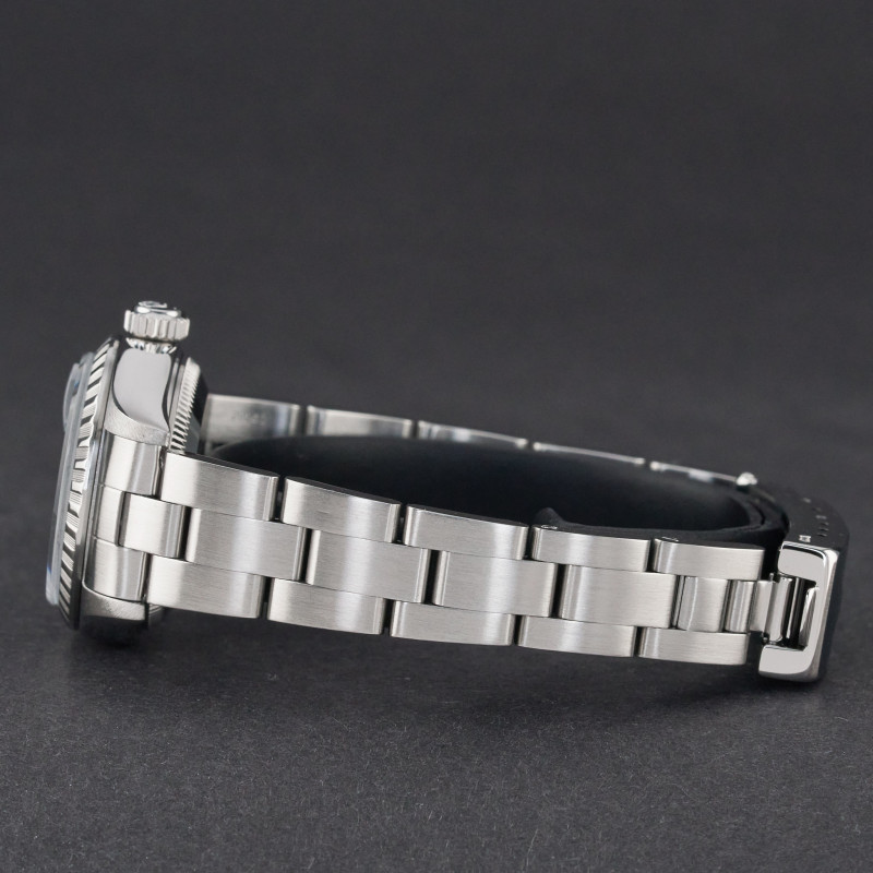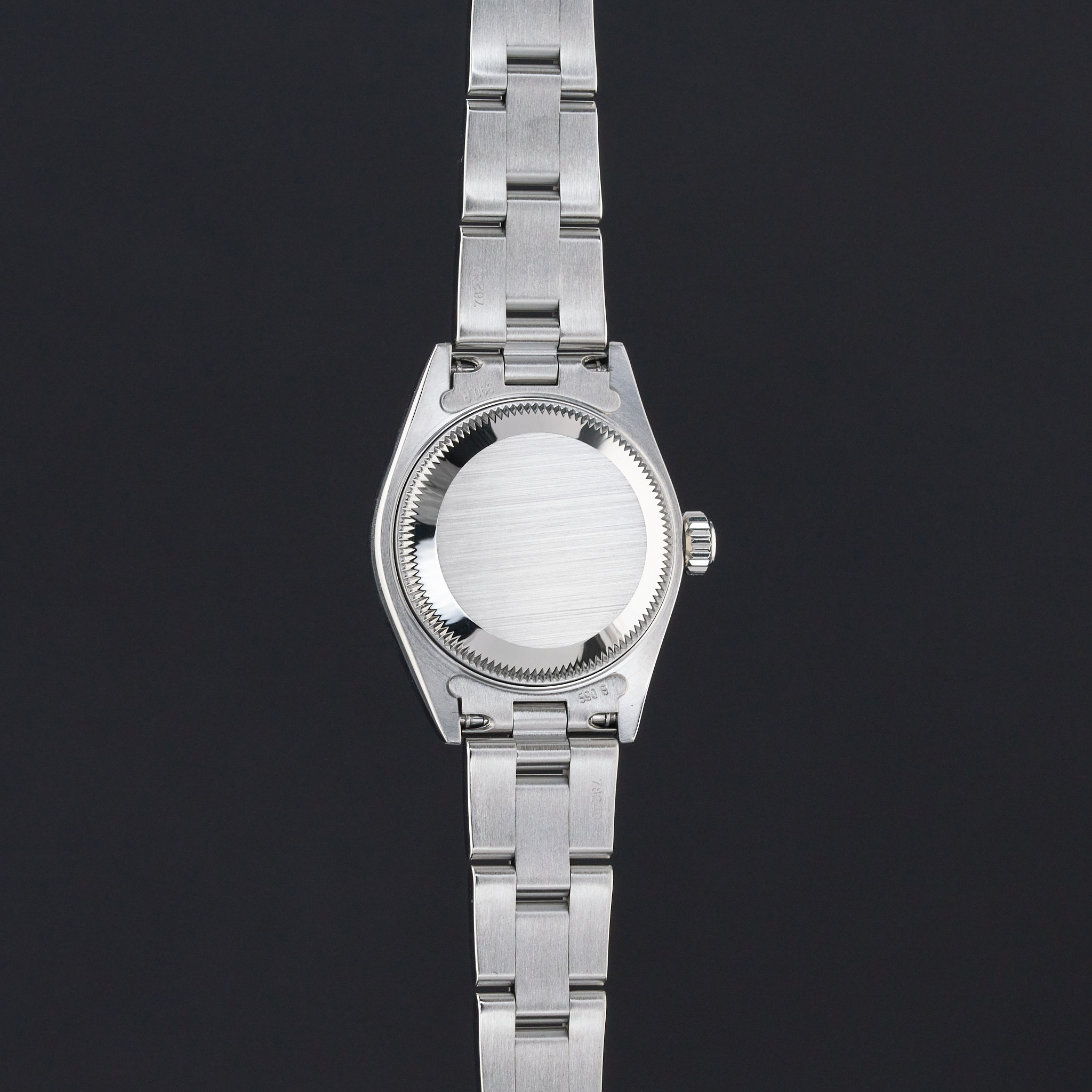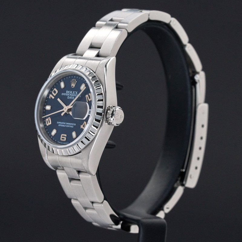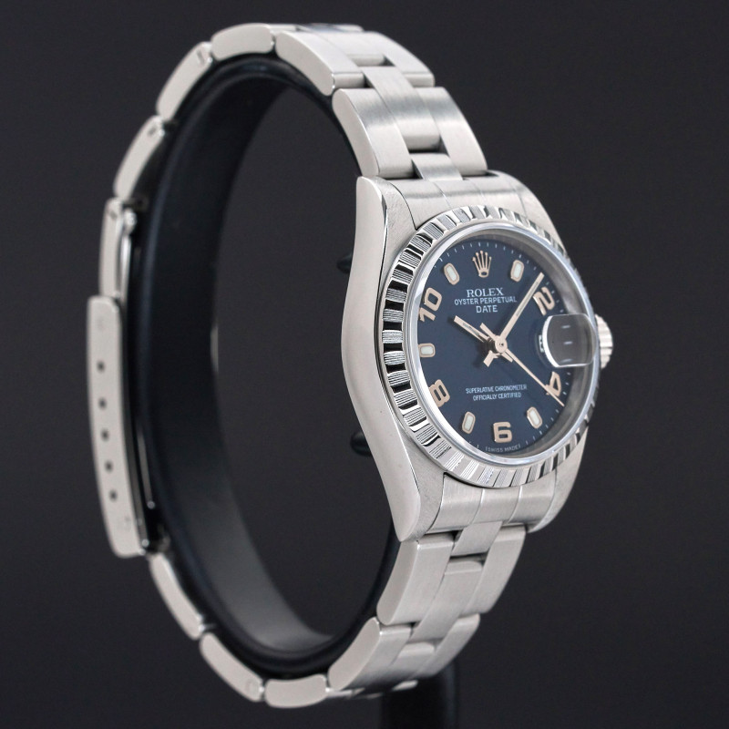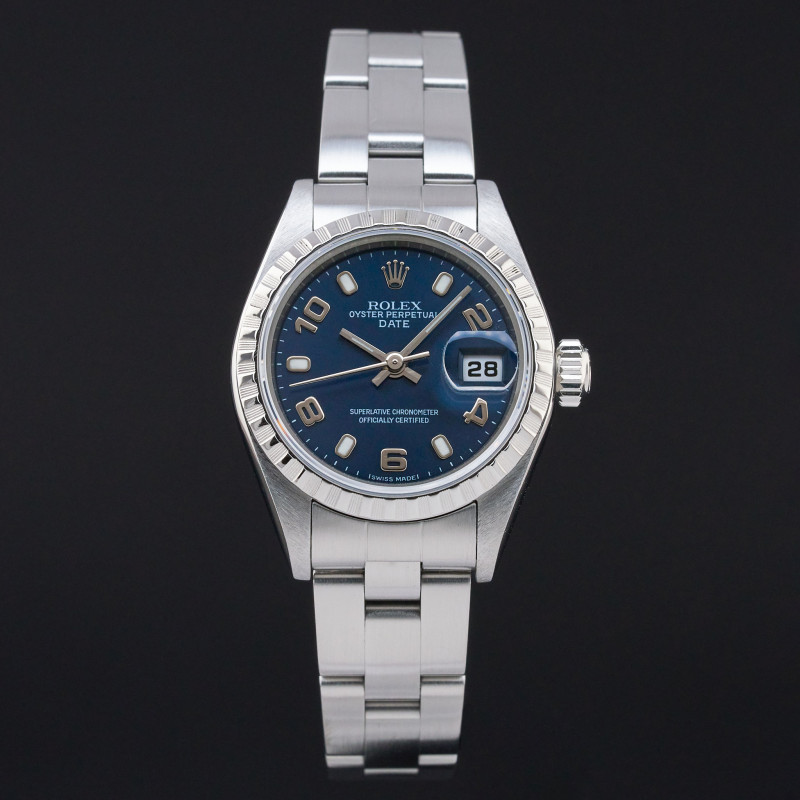 This Rolex Oyster Perpetual Lady Date 79240 features a Blue Arabic dial and is crafted from stainless steel, with a production year of 2000.