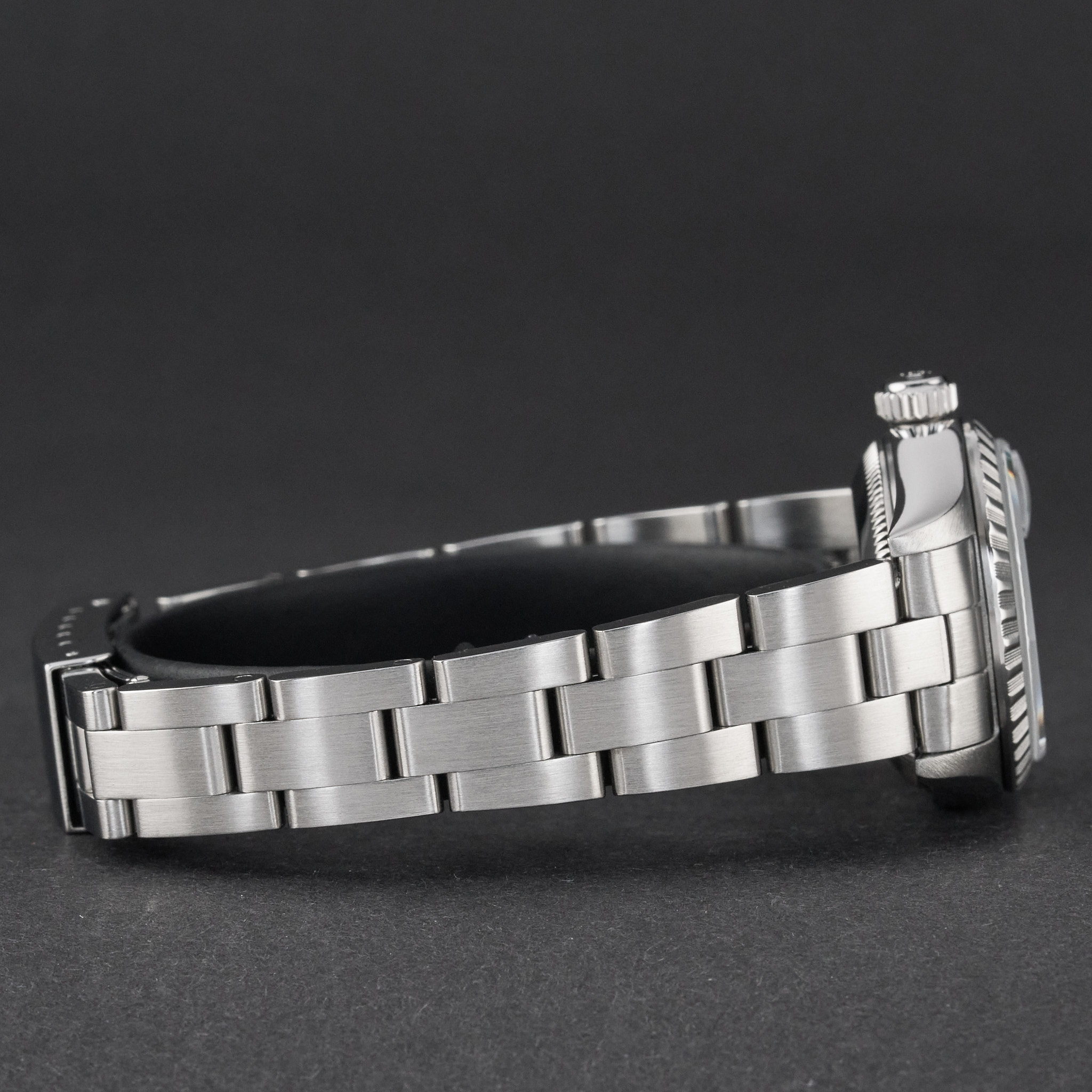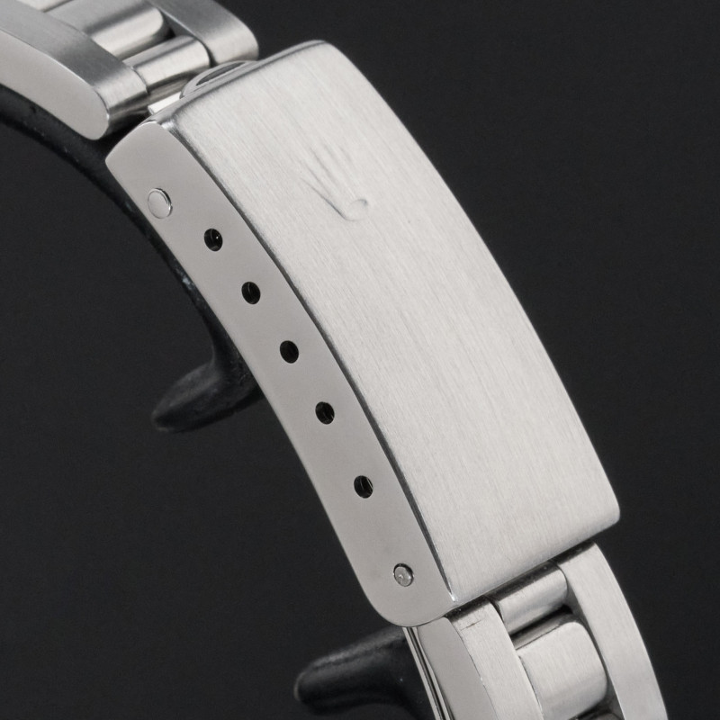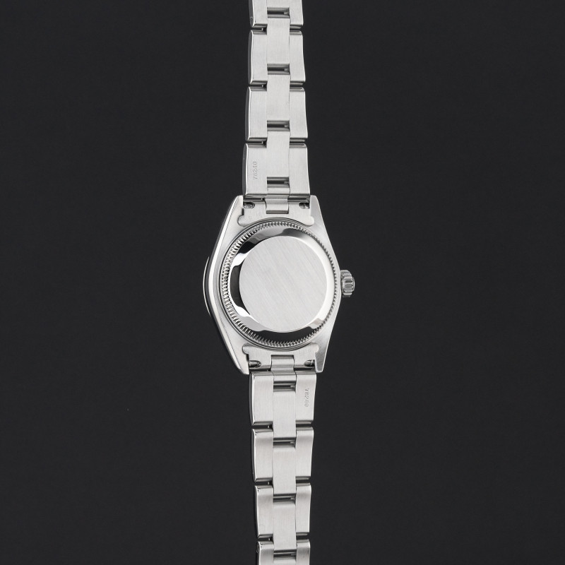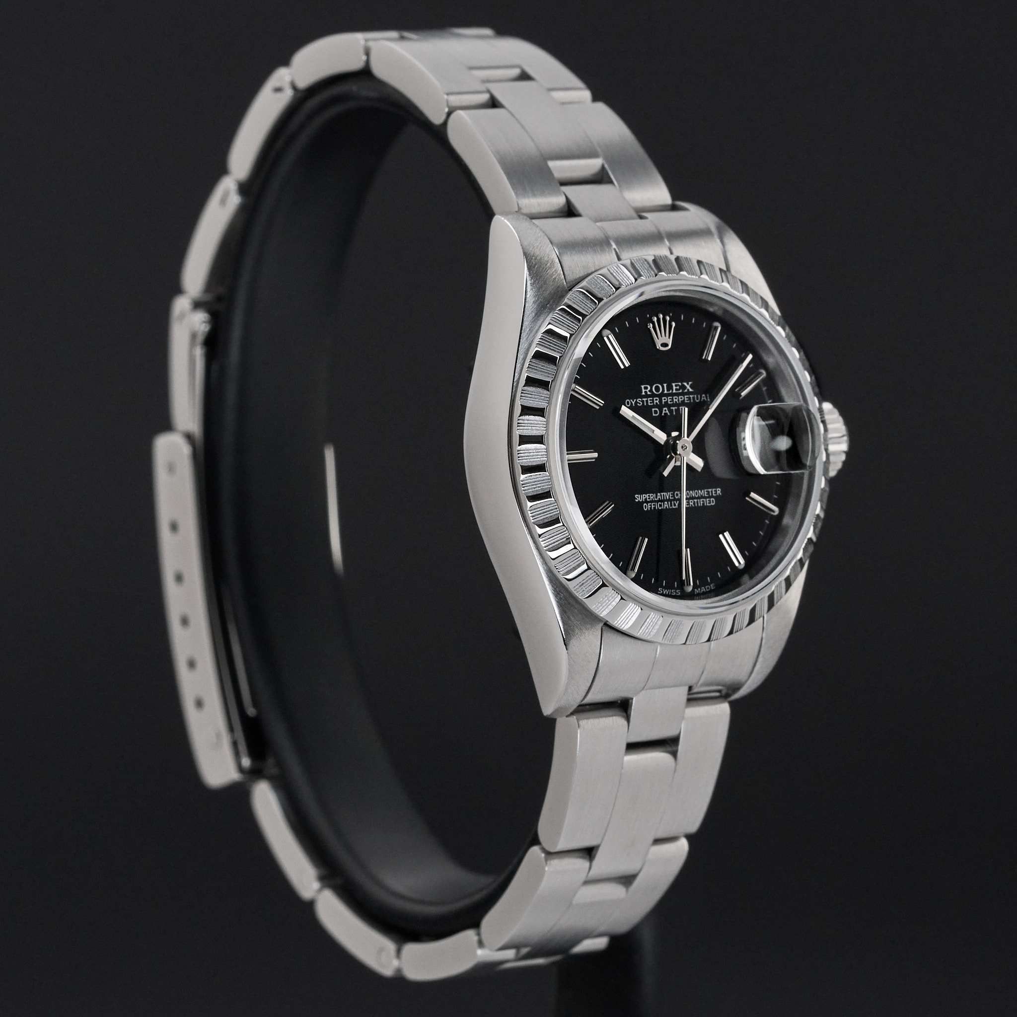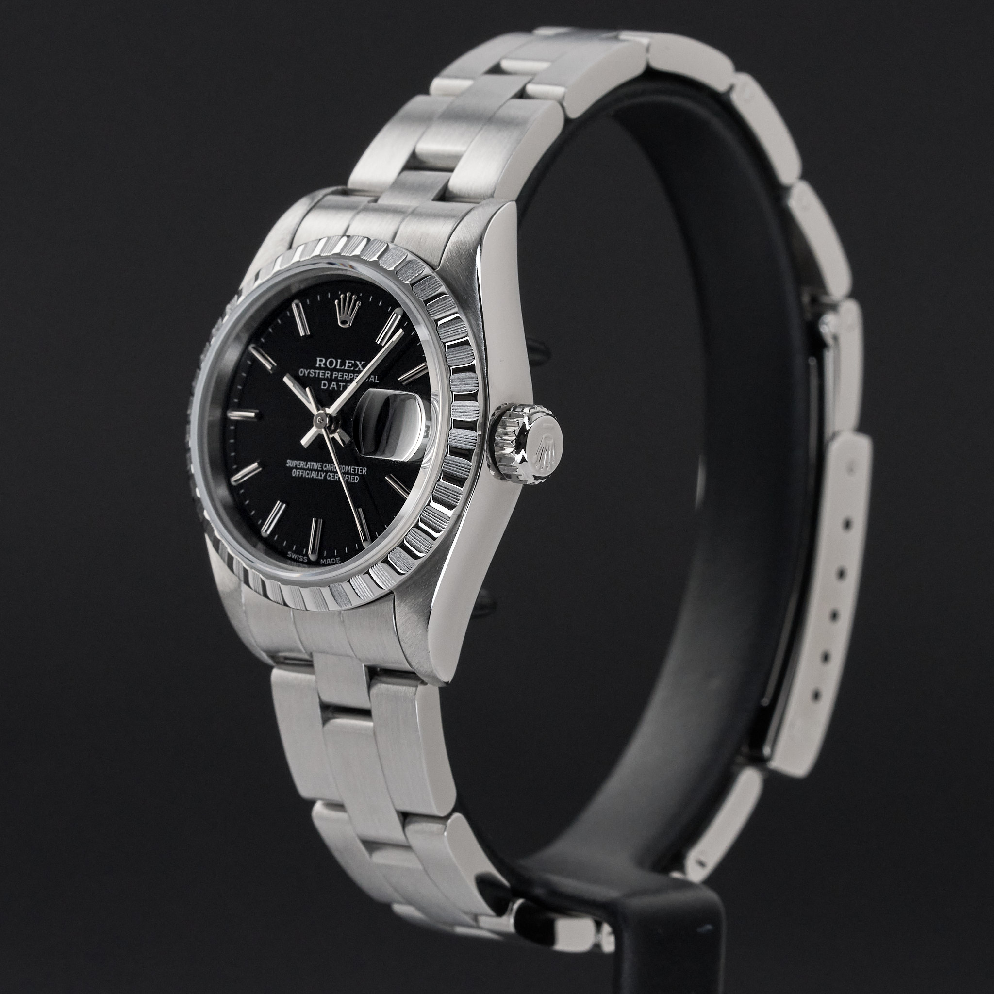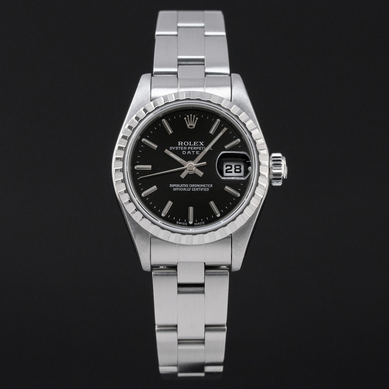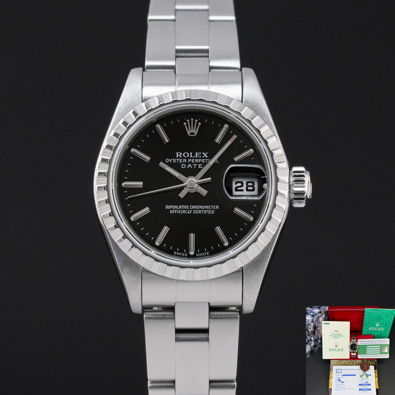 This Rolex Oyster Perpetual Lady Date 79240 features a Black dial and is crafted from stainless steel, with a production year of 2001.