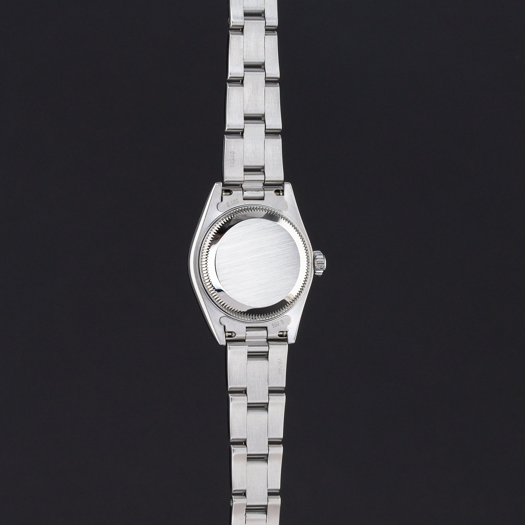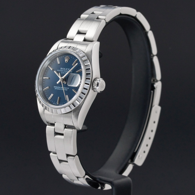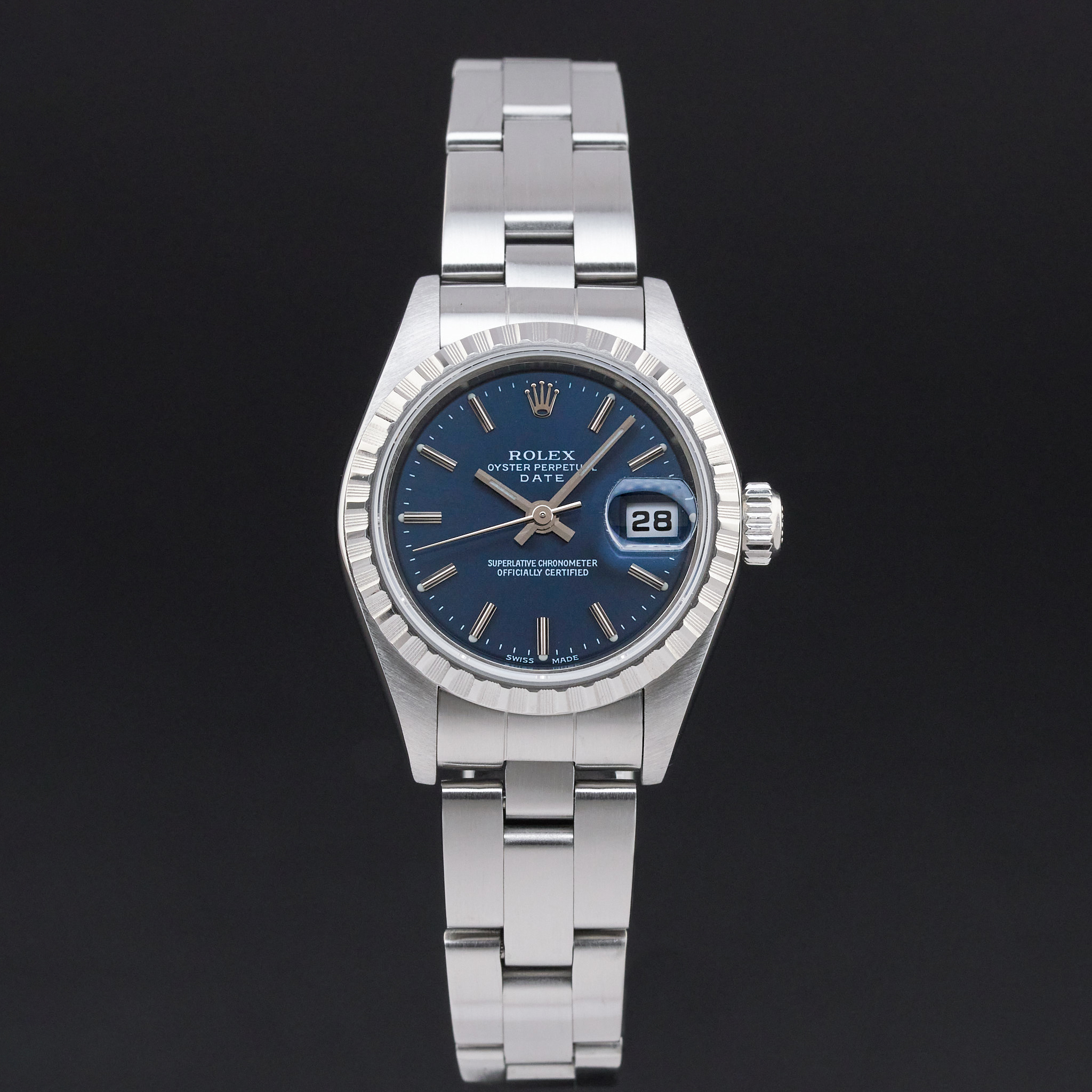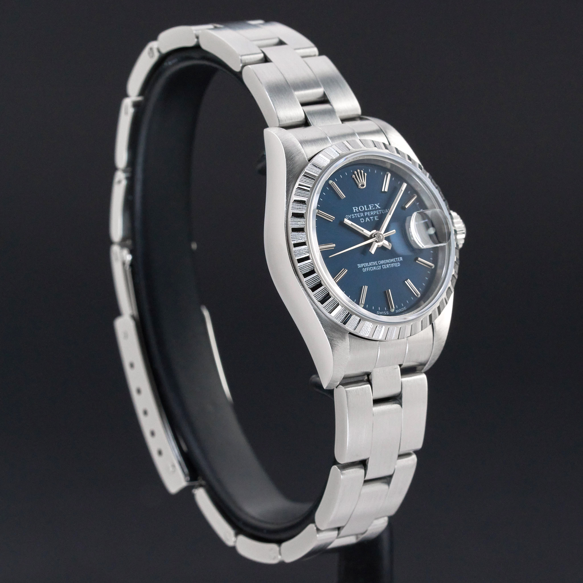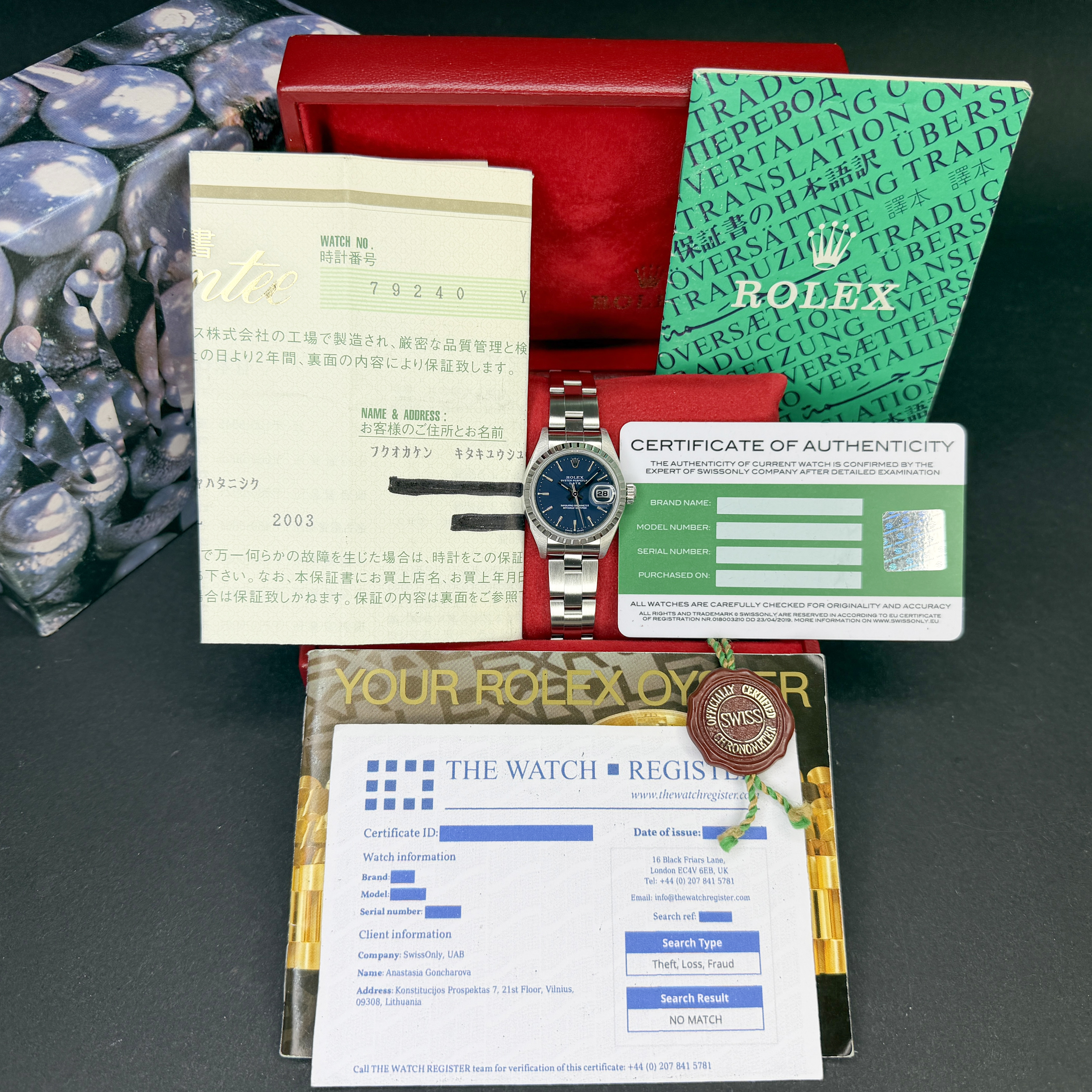 This Rolex Oyster Perpetual Lady Date 79240 features a Blue dial and is crafted from stainless steel, with a production year of 2002.
