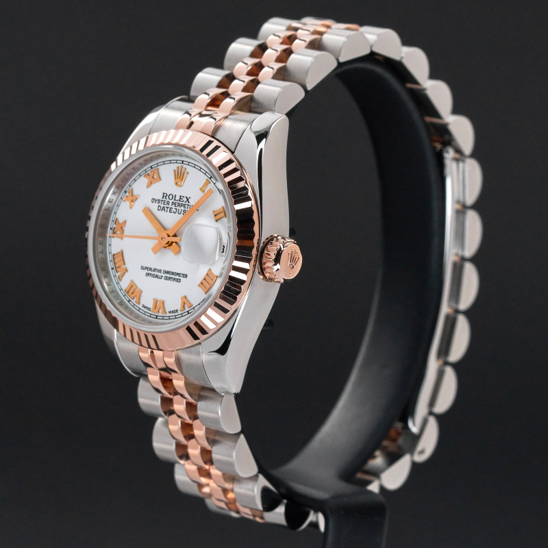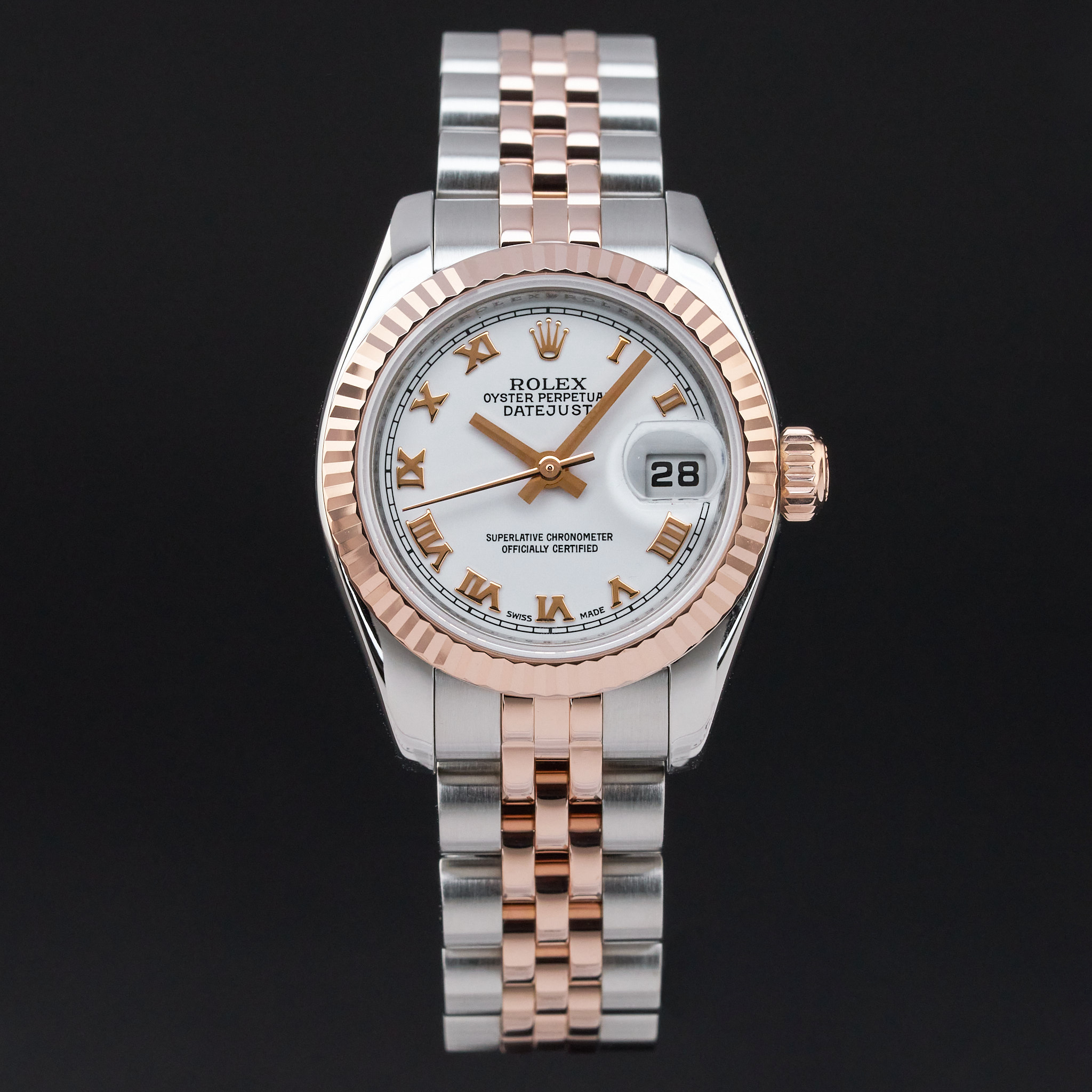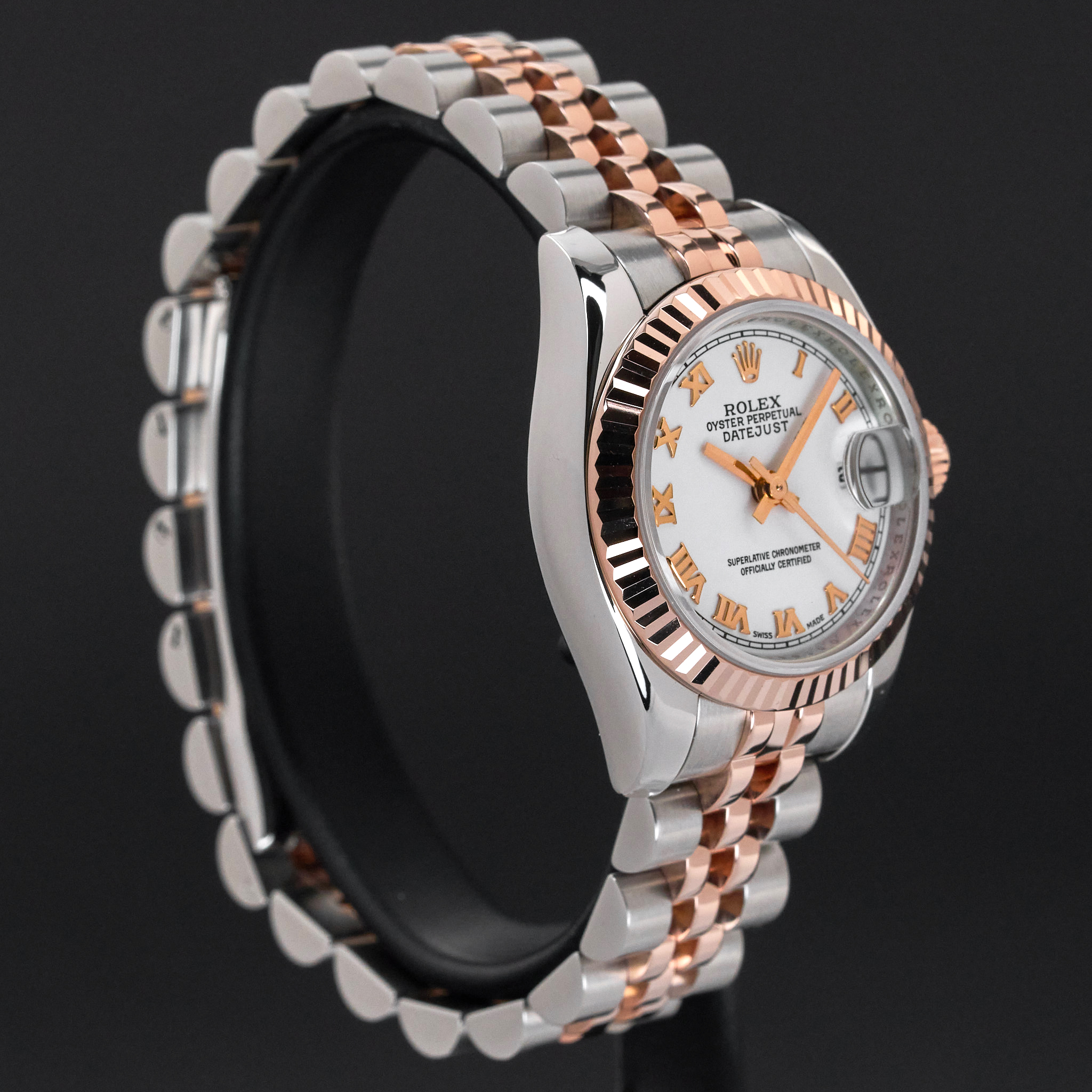This Rolex Lady-Datejust 179171 features a White Roman dial and is crafted from 18K rose gold and stainless steel, with a production year of 2006.