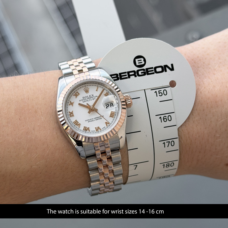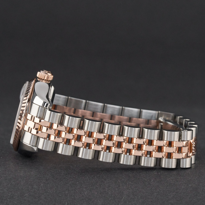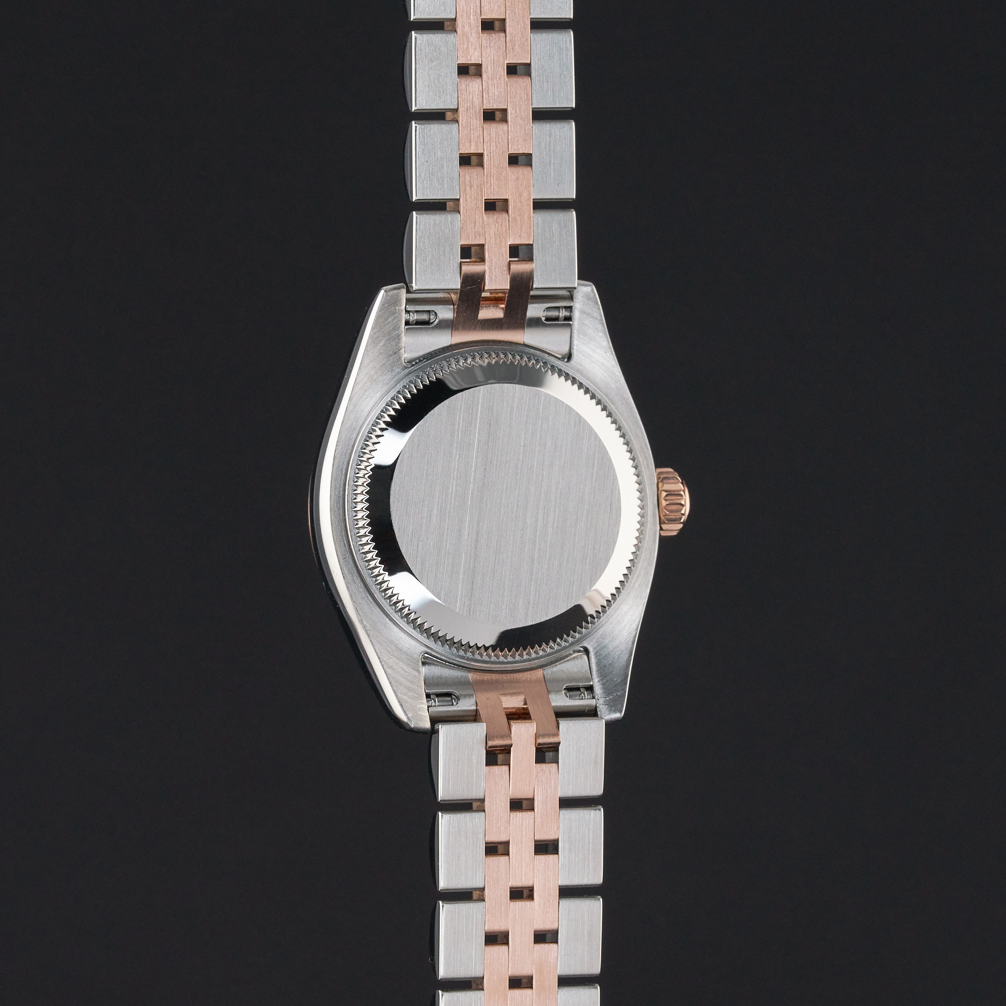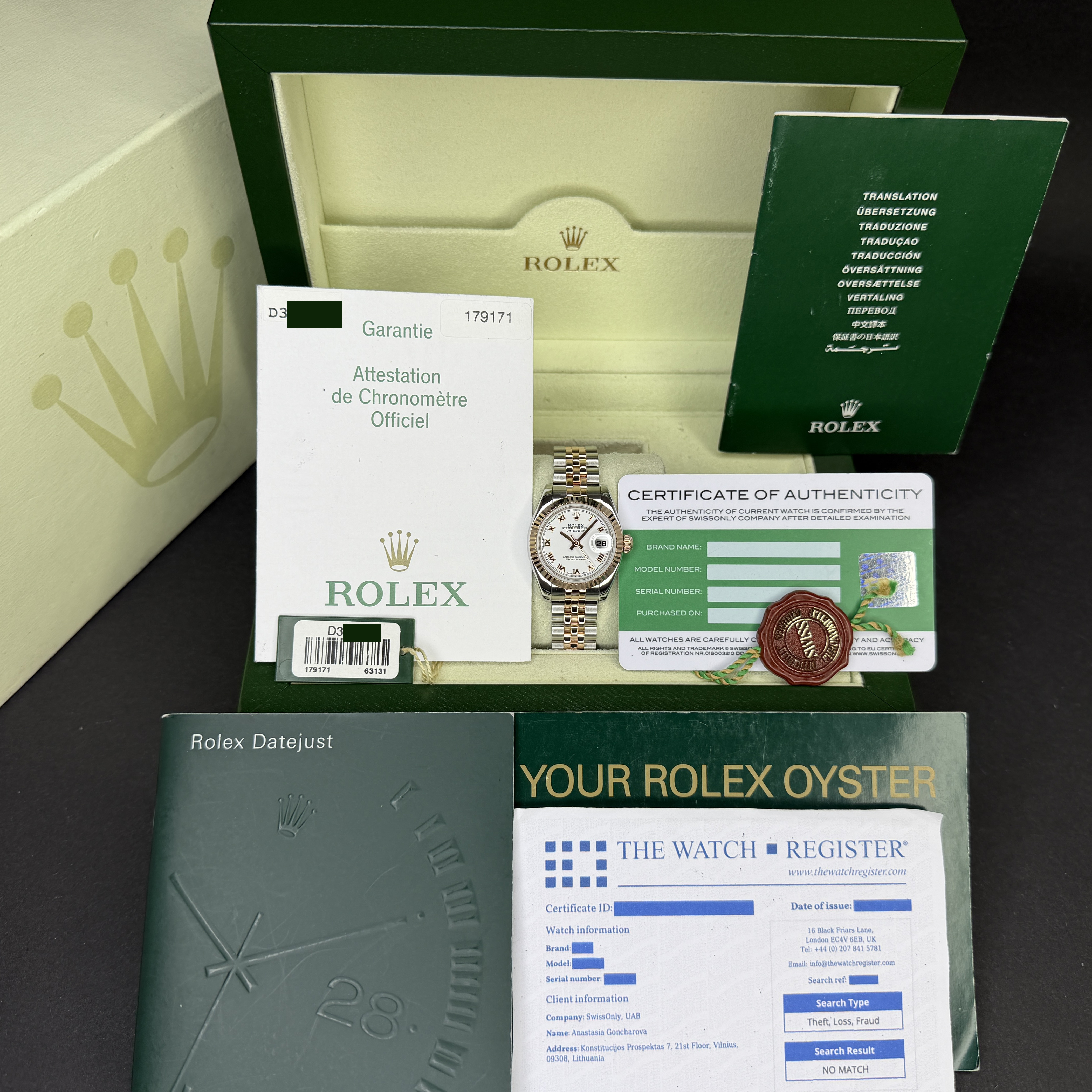 This Rolex Lady-Datejust 179171 features a White Roman dial and is crafted from 18K rose gold and stainless steel, with a production year of 2006.