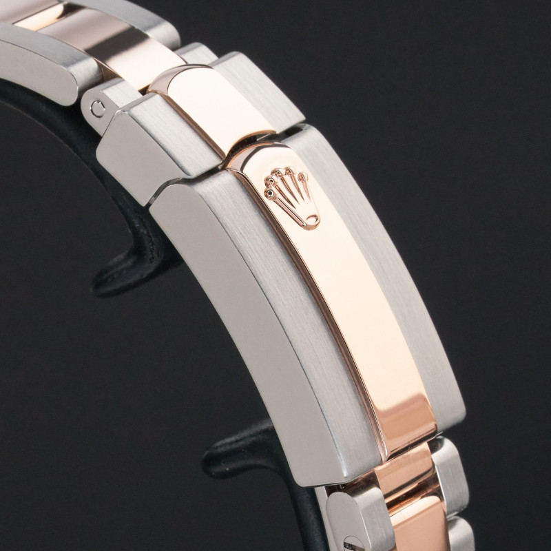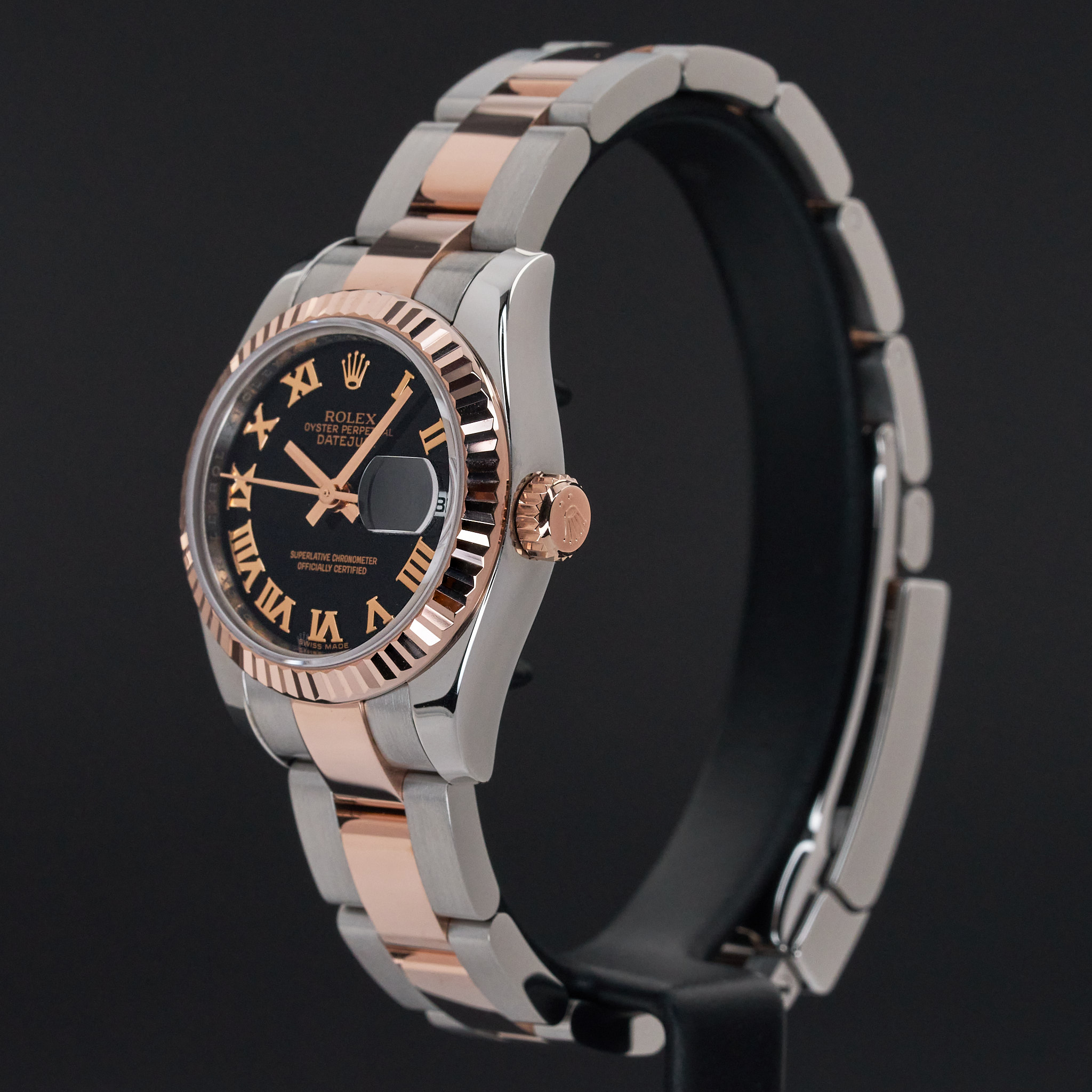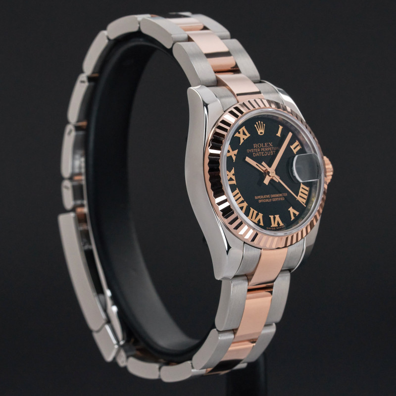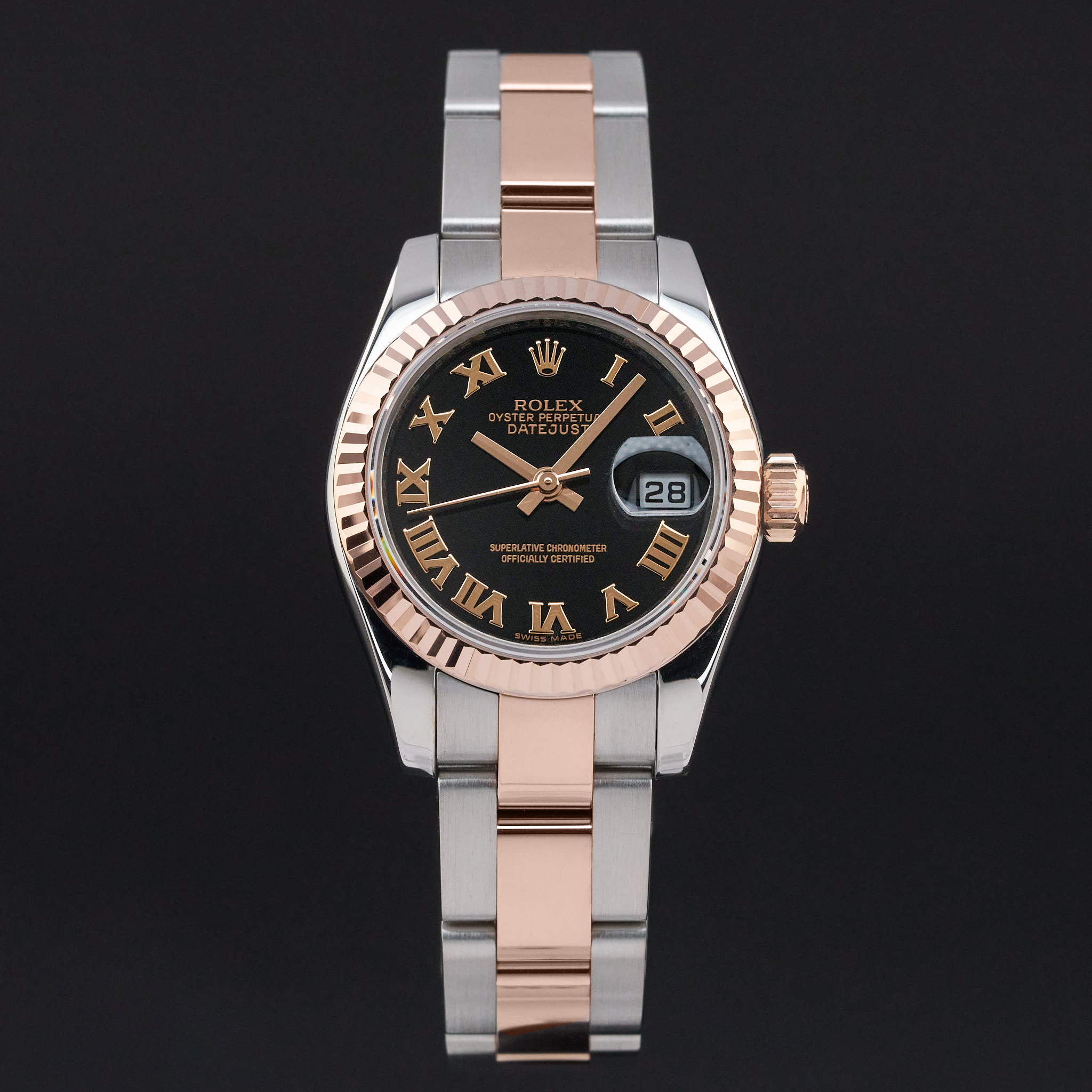 This Rolex Lady-Datejust 179171 features a Black Roman dial and is crafted from 18K rose gold and stainless steel, with a production year of 2012.