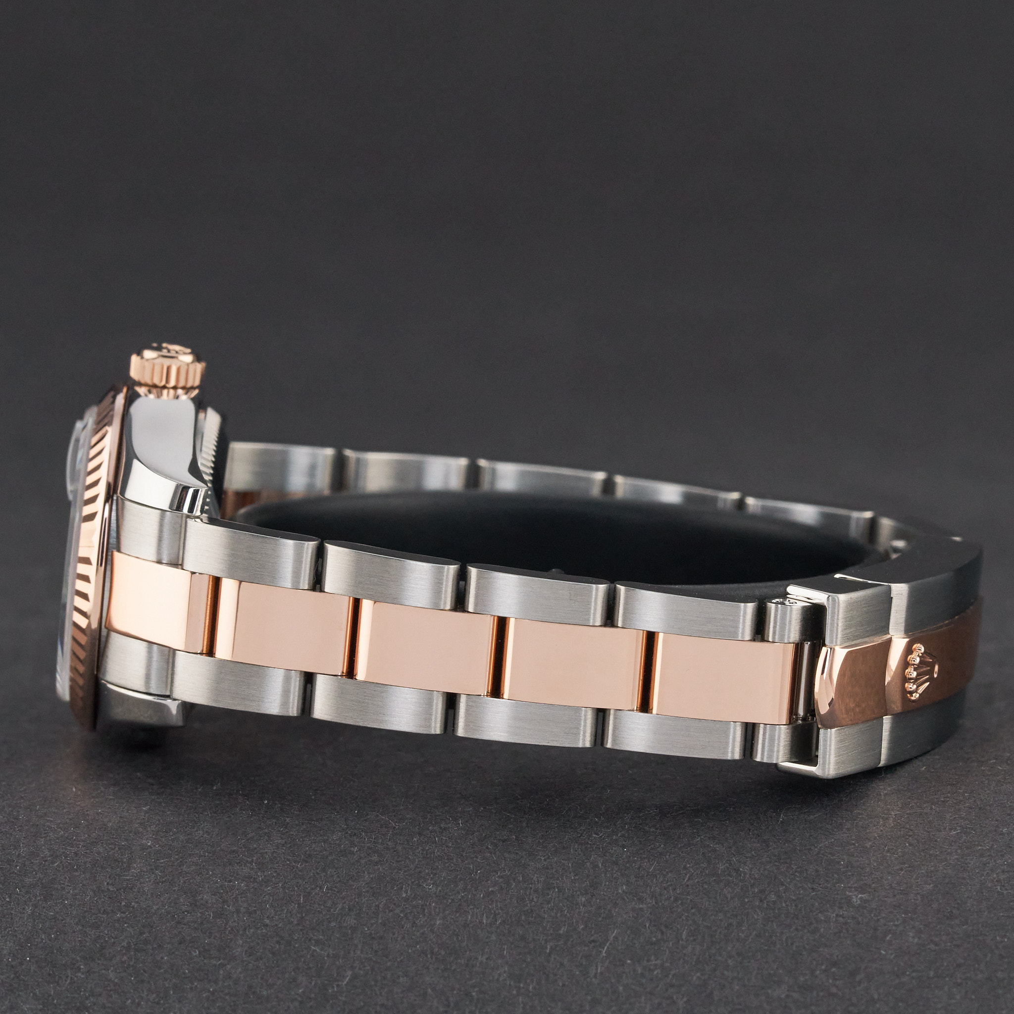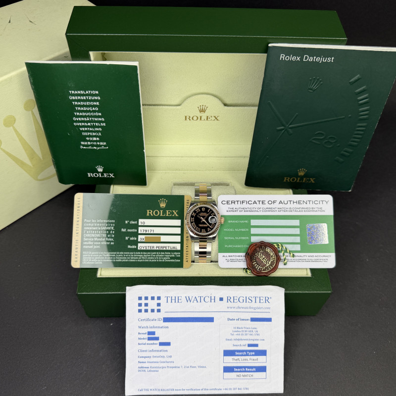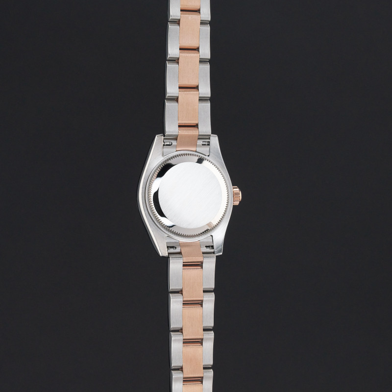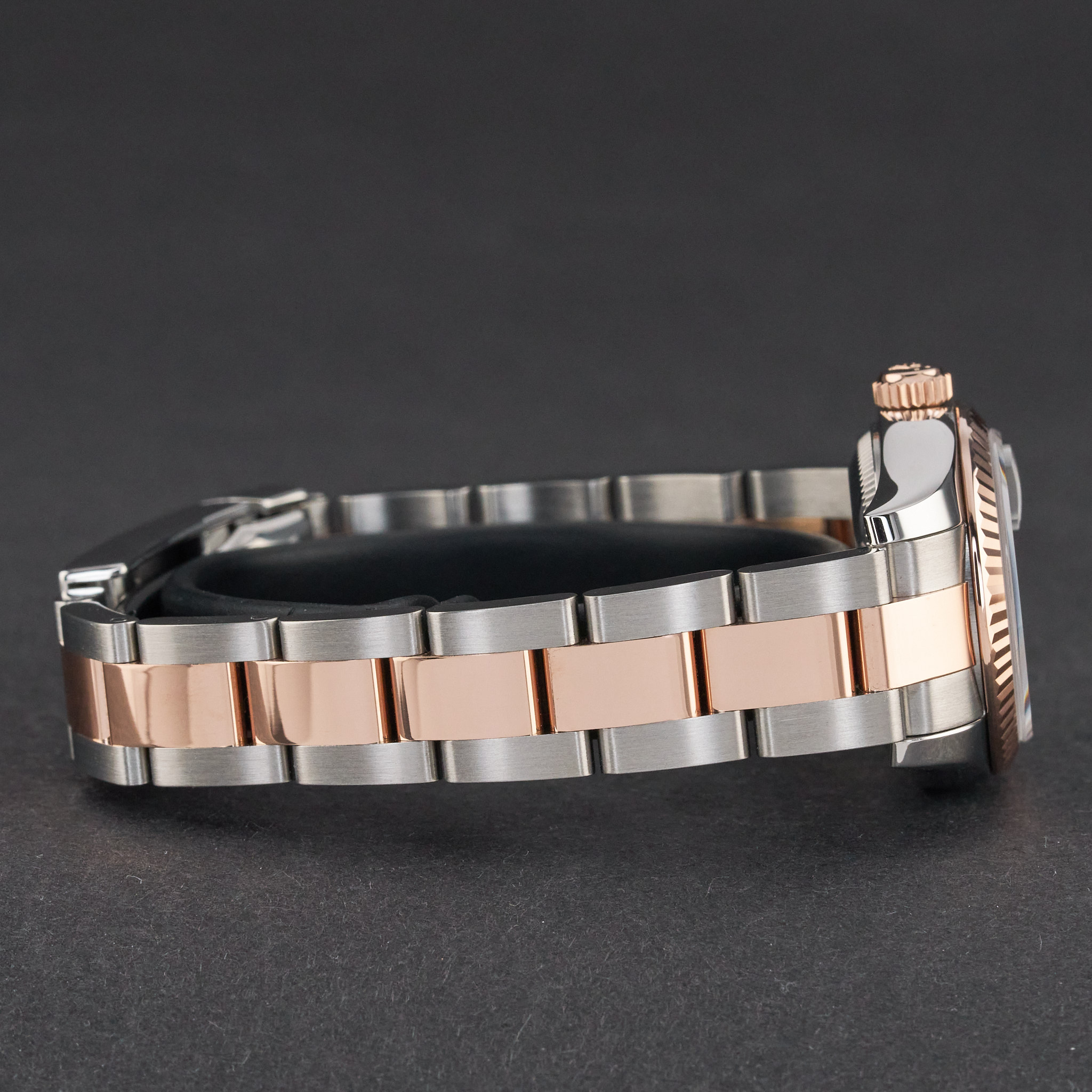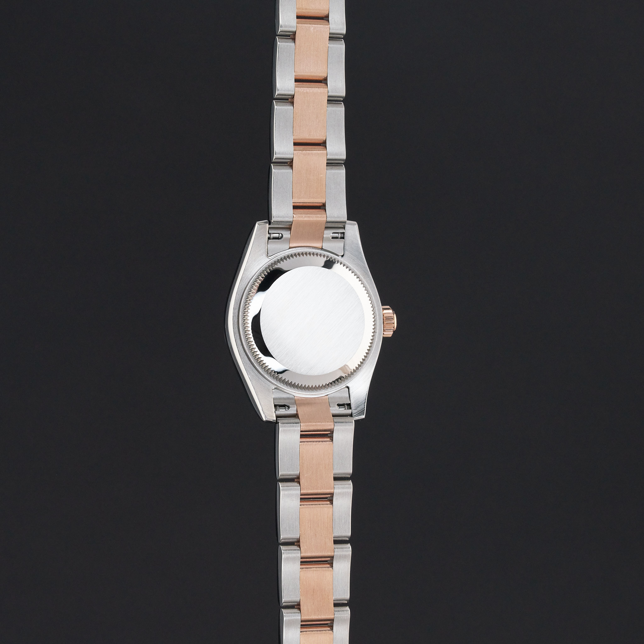 This Rolex Lady-Datejust 179171 features a Black Roman dial and is crafted from 18K rose gold and stainless steel, with a production year of 2012.