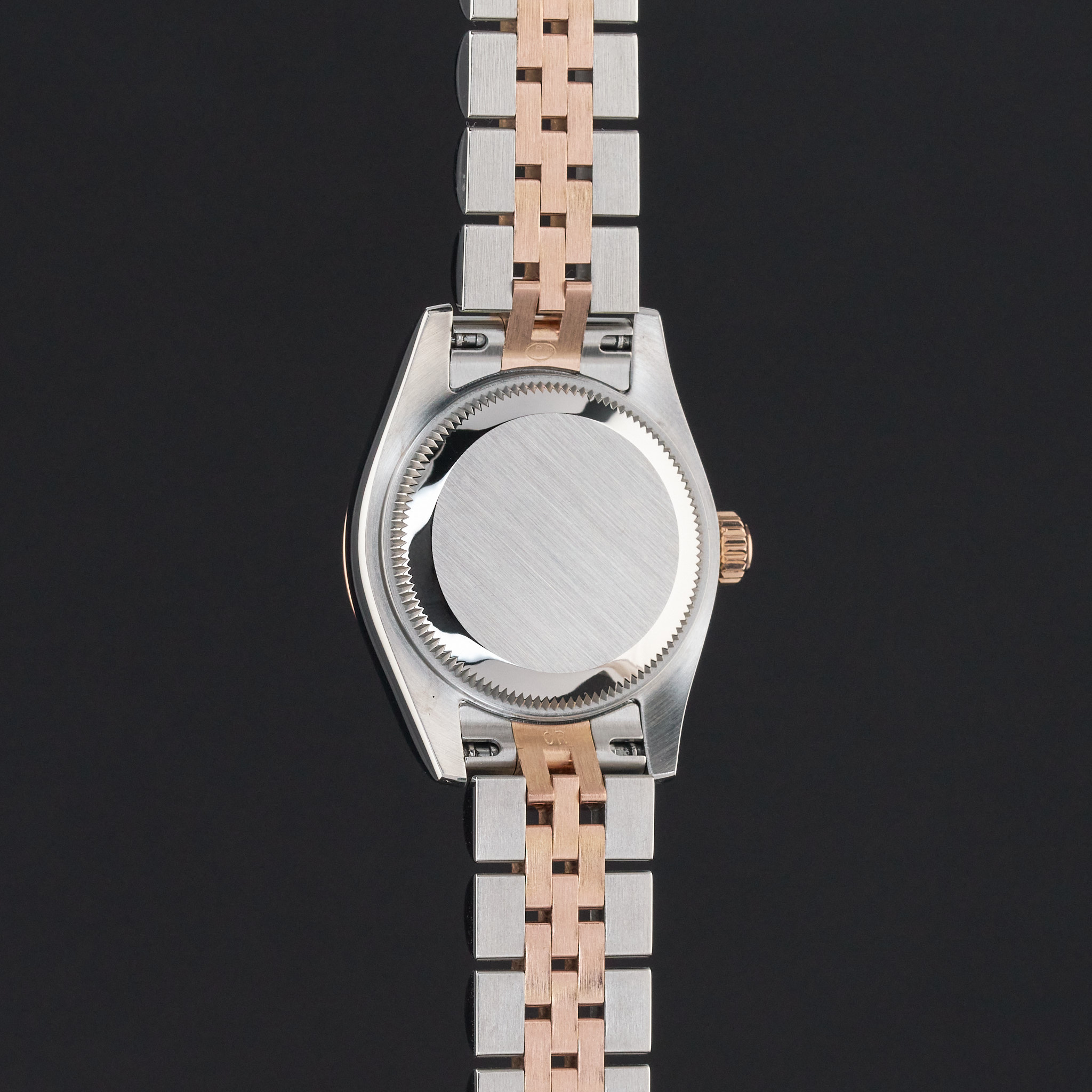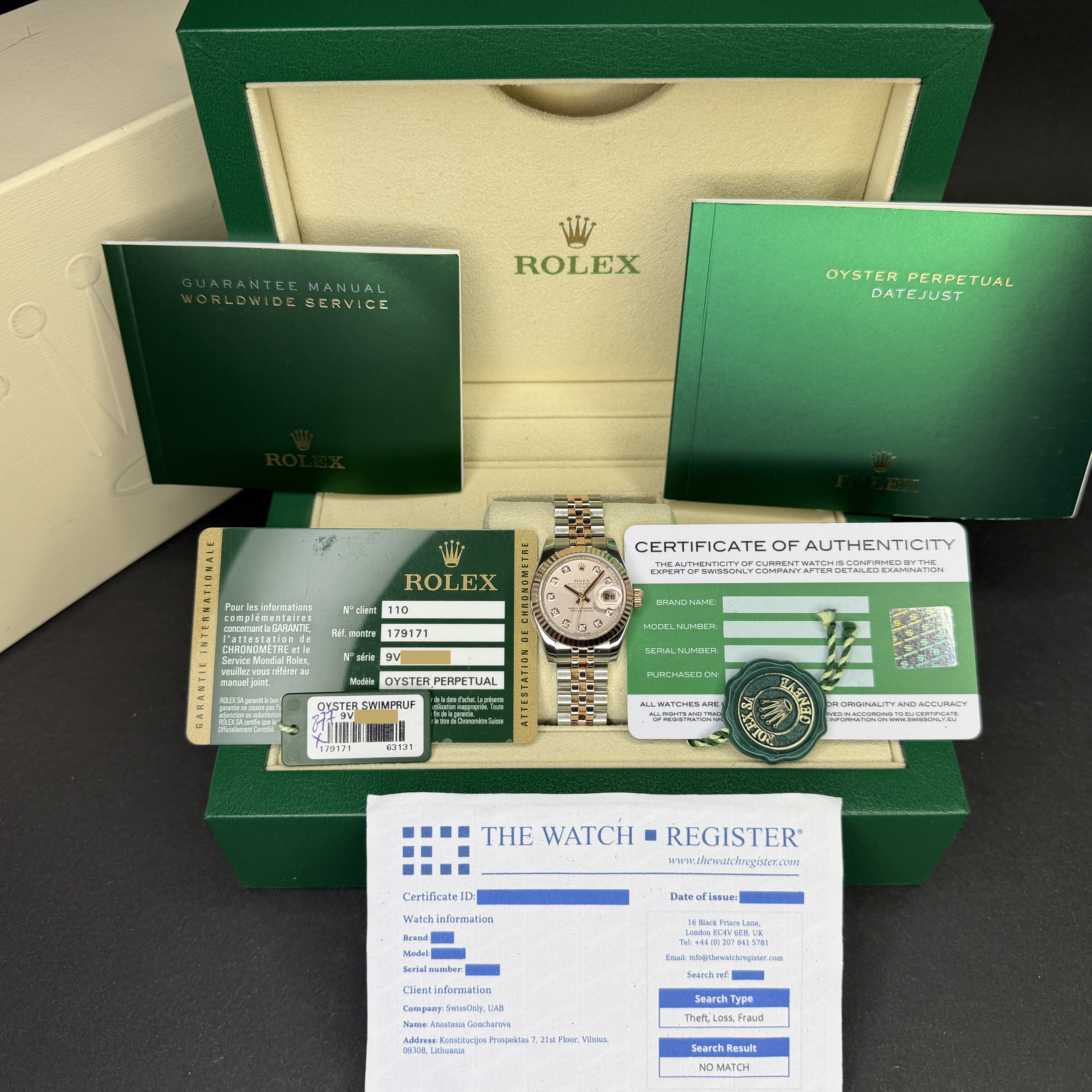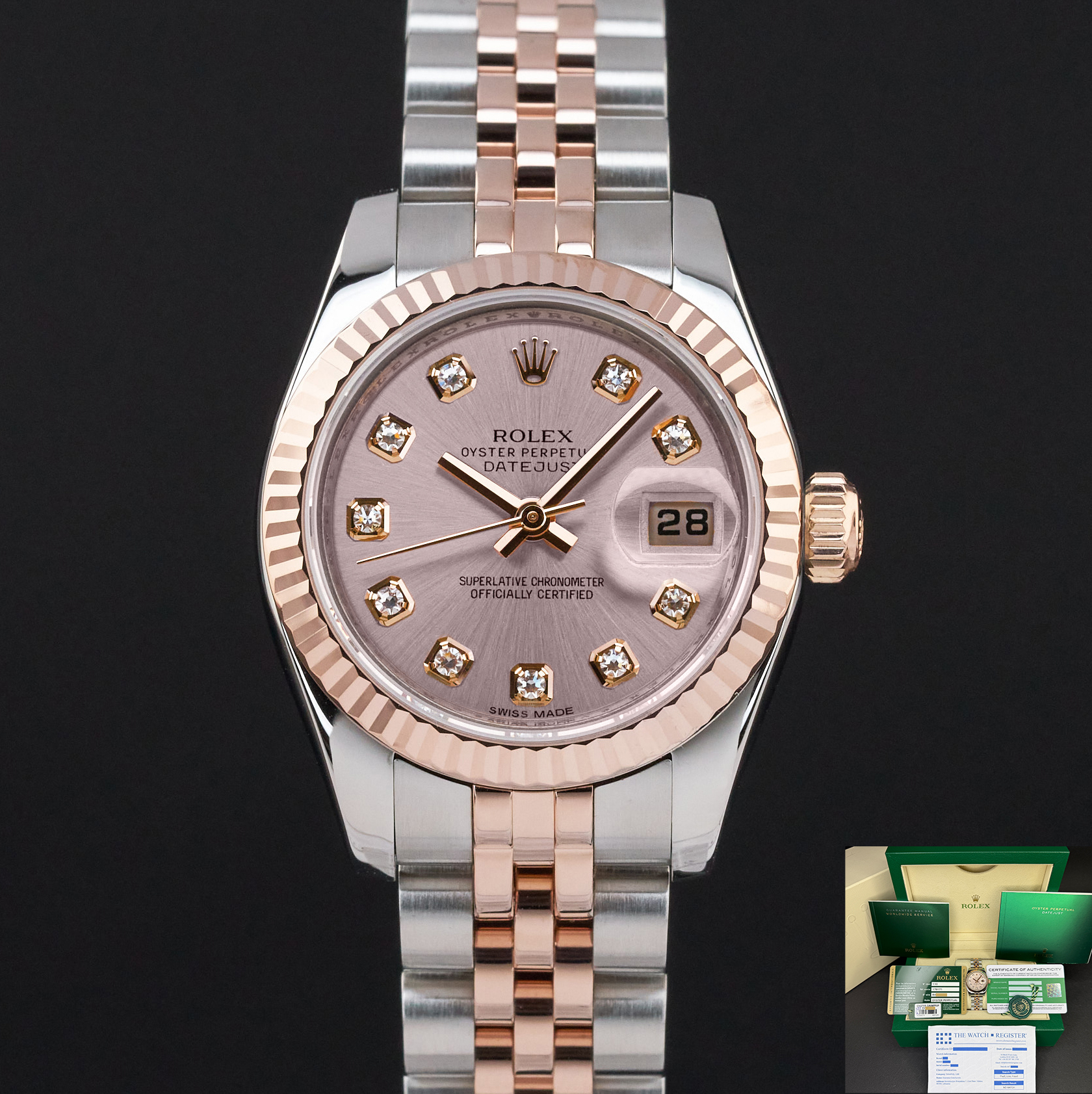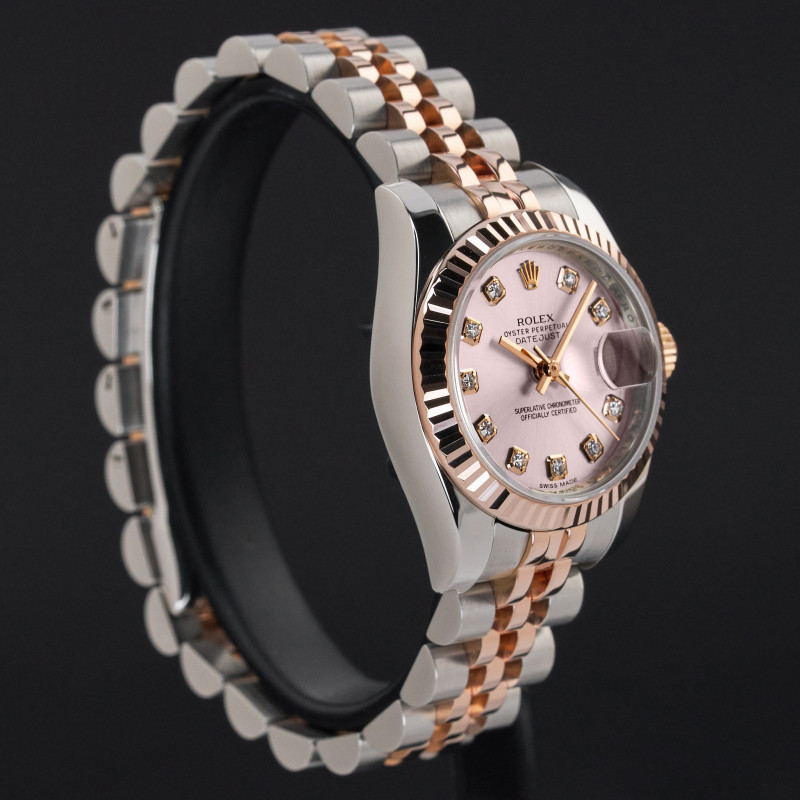 This Rolex Lady-Datejust 179171 features a Pink Diamond dial and is crafted from 18K rose gold and stainless steel, with a production year of 2013.