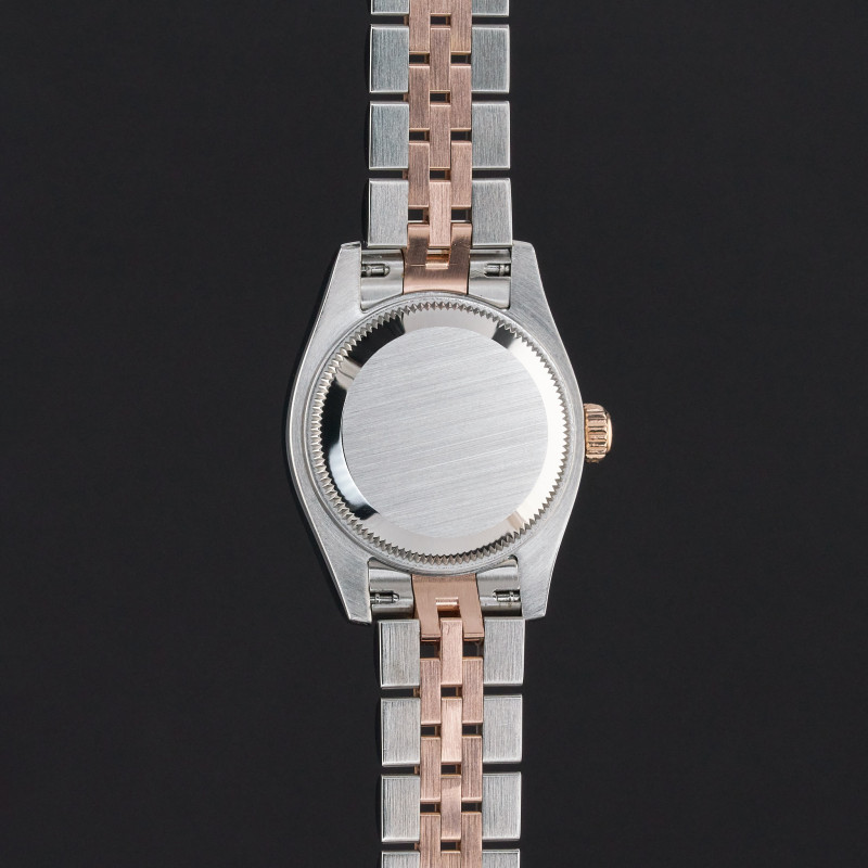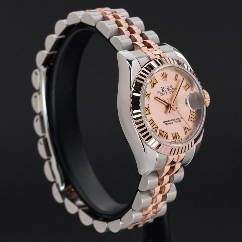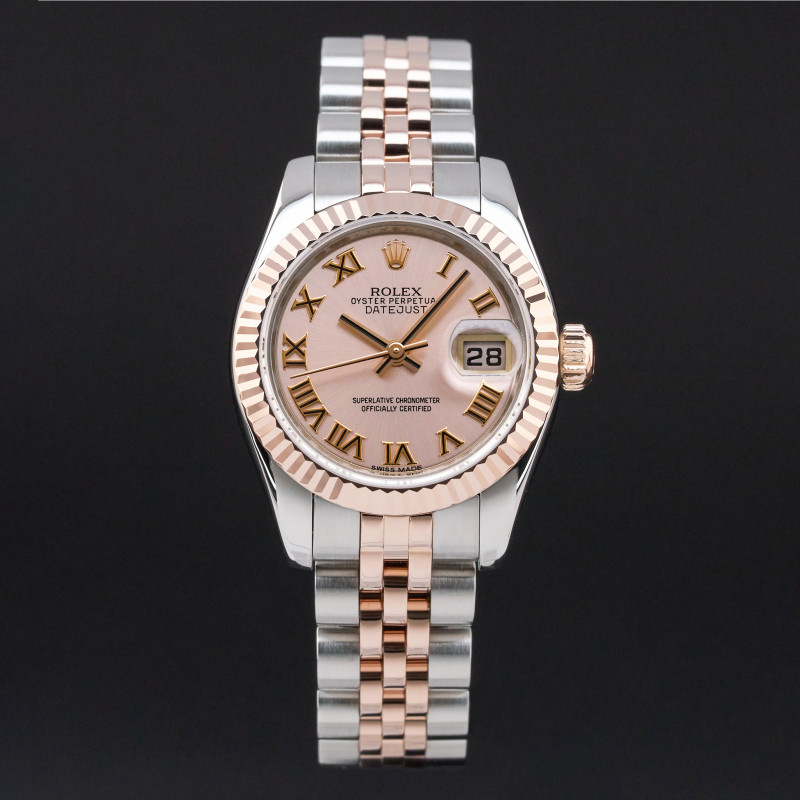 This Rolex Lady-Datejust 179171 features a Pink Roman dial and is crafted from 18K rose gold and stainless steel, with a production year of 2014.