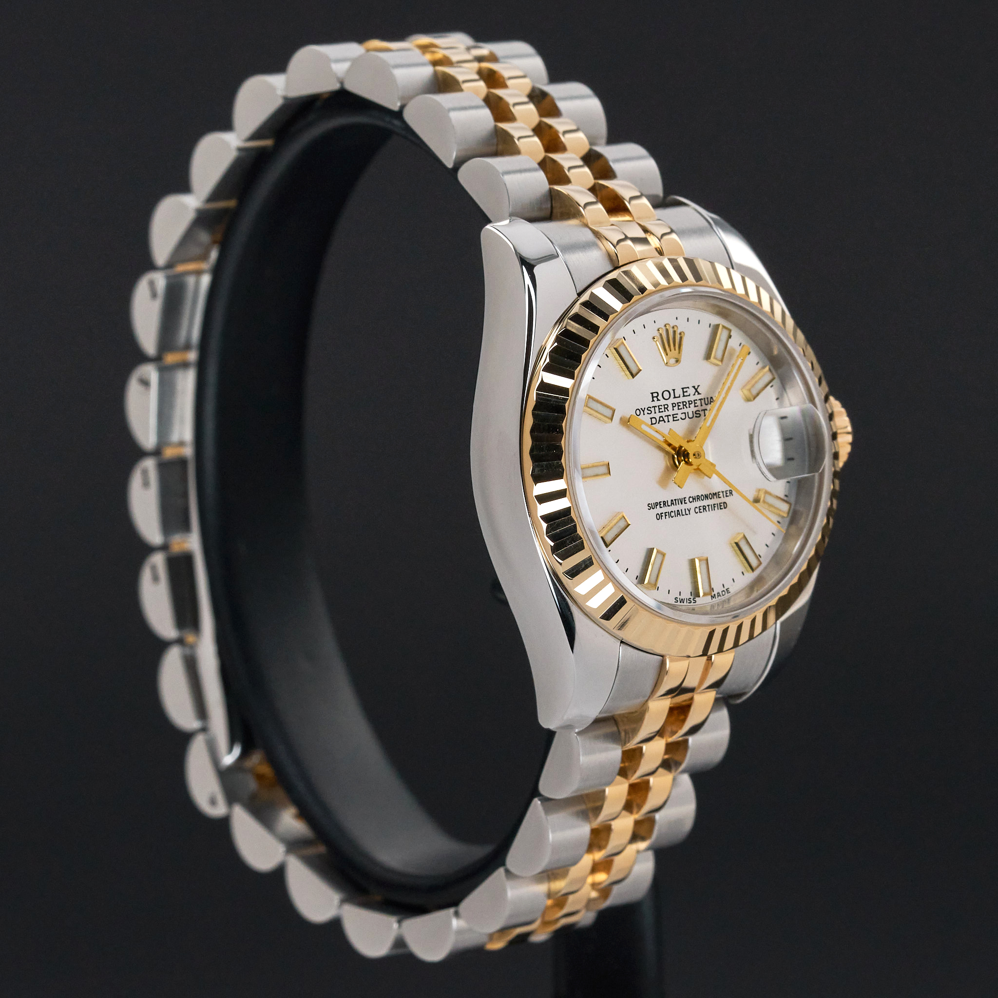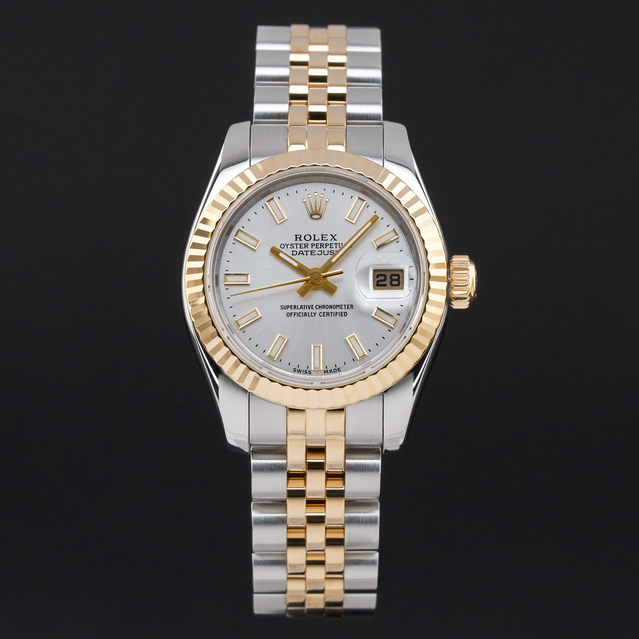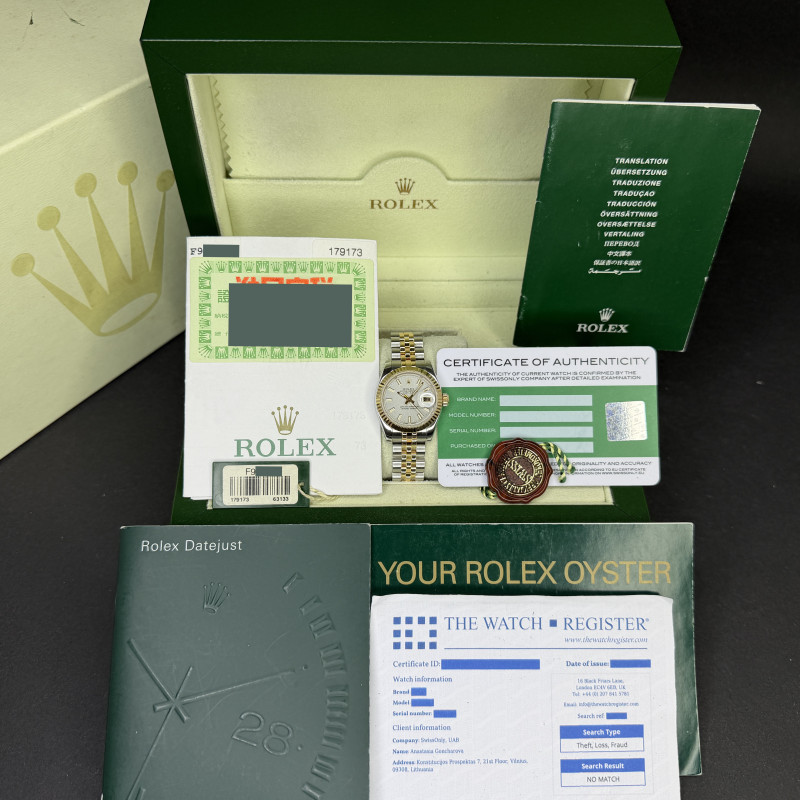 This Rolex Lady-Datejust 179173 features a Silver dial and is crafted from 18K yellow gold and stainless steel, with a production year of 2005.
