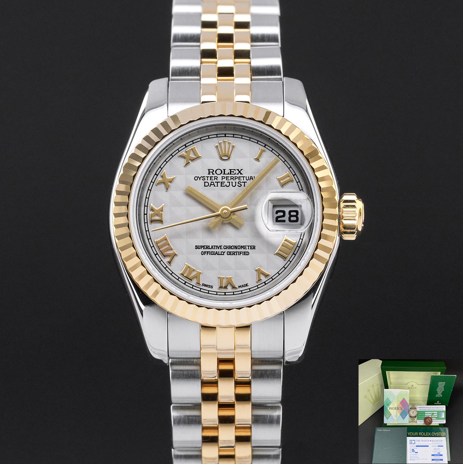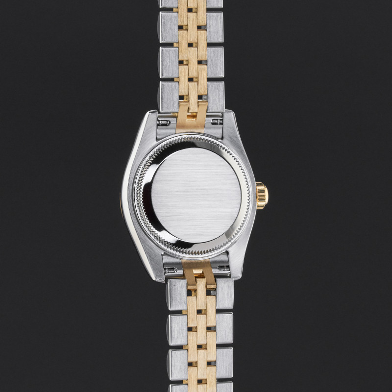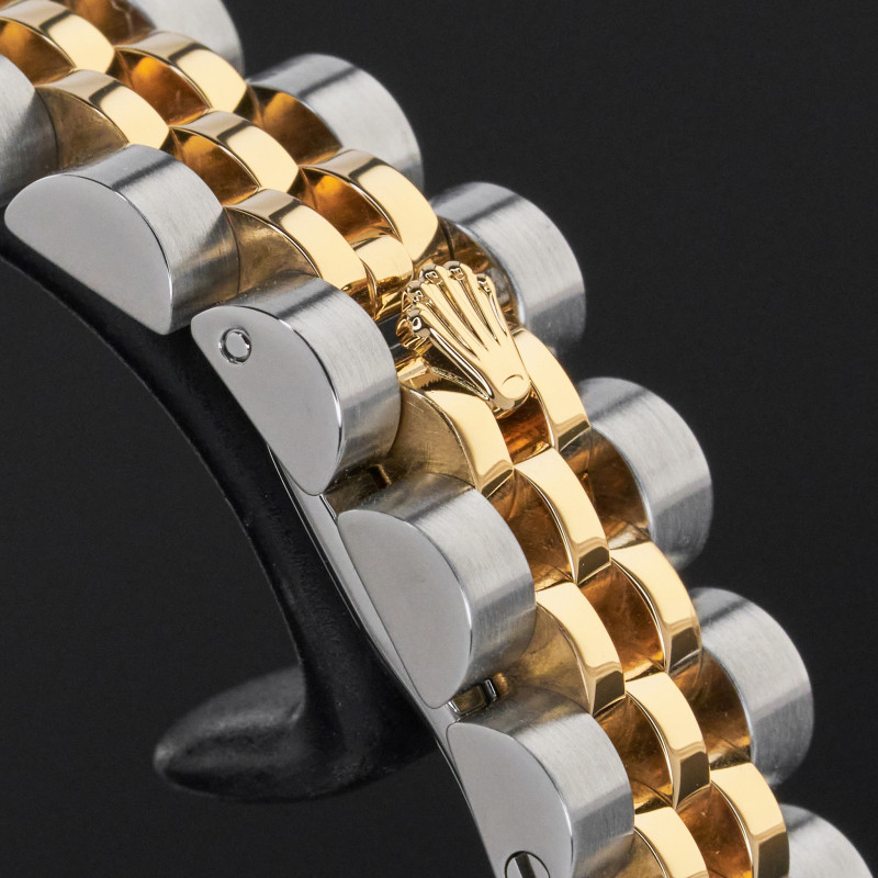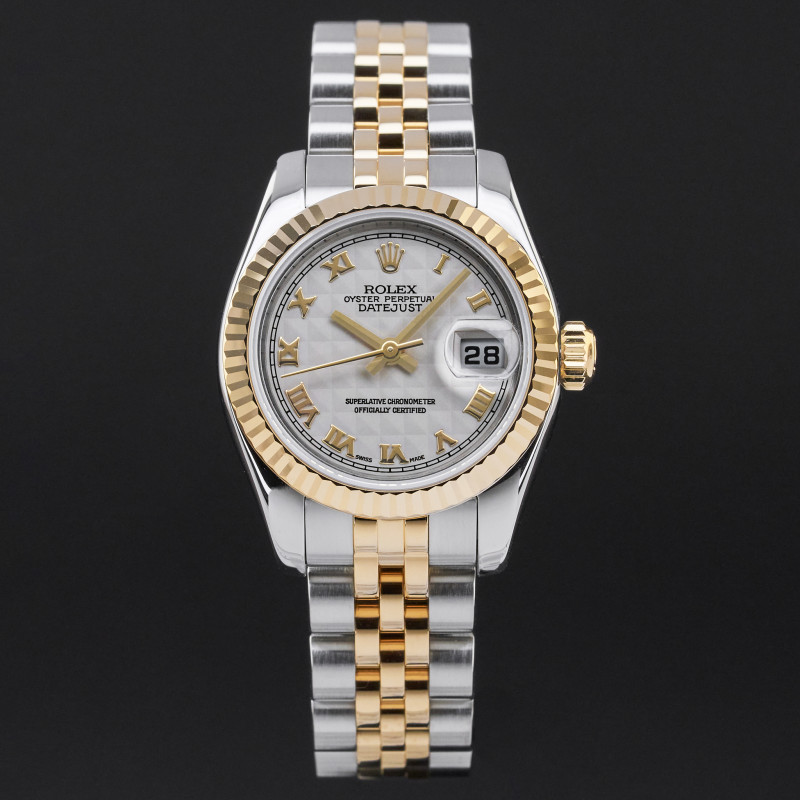 This Rolex Lady-Datejust 179173 features an Ivory pyramid Roman dial and is crafted from 18K yellow gold and stainless steel, with a production year of 2006.