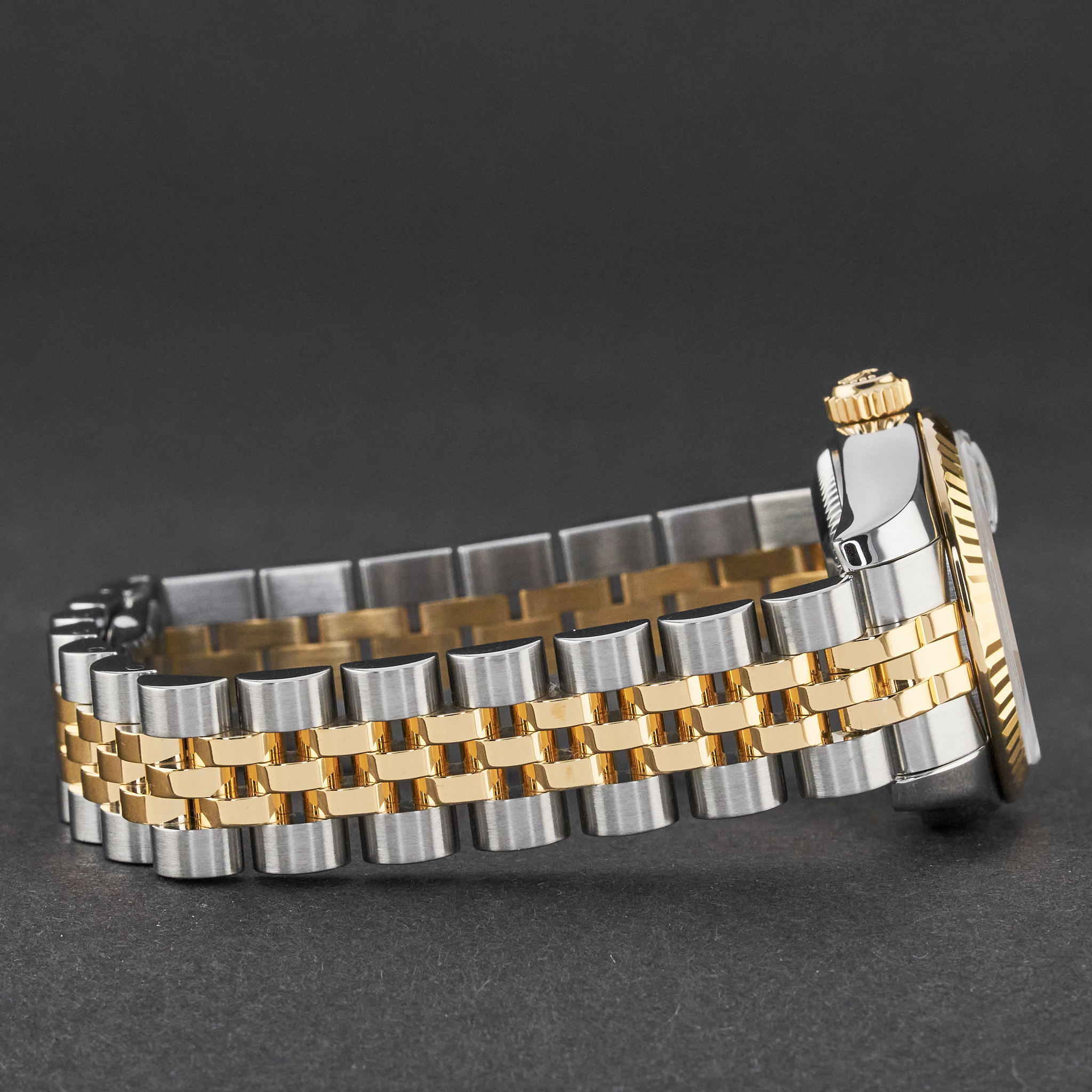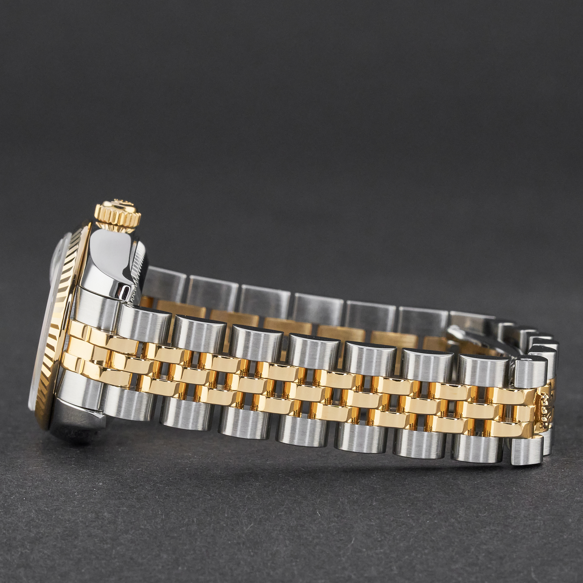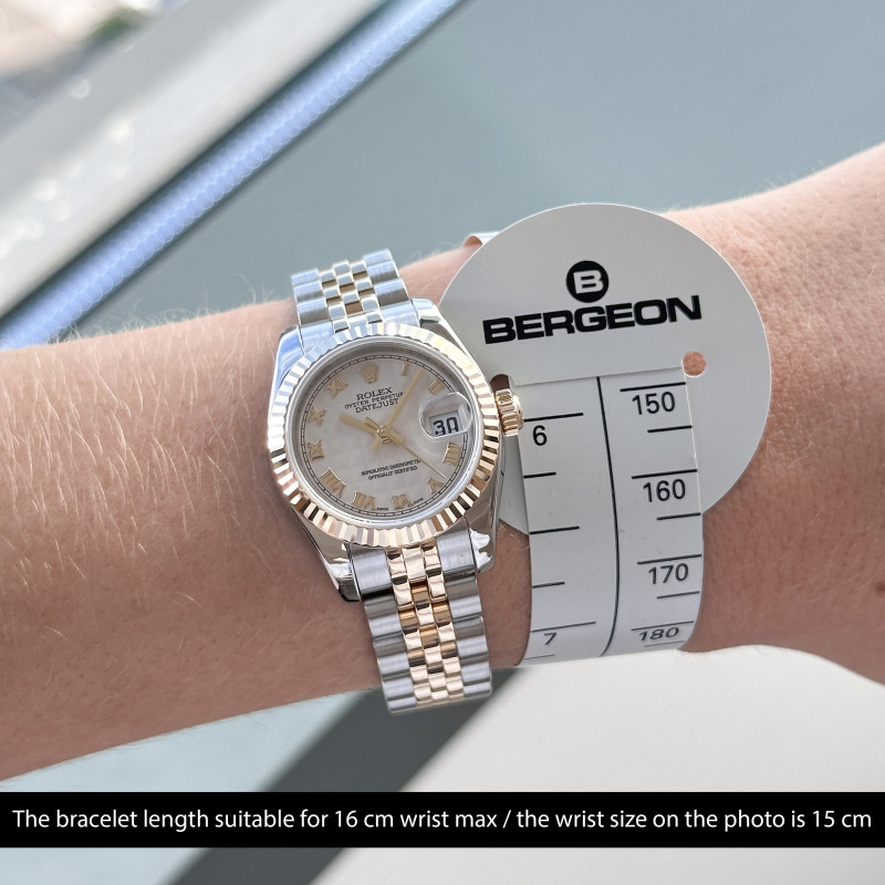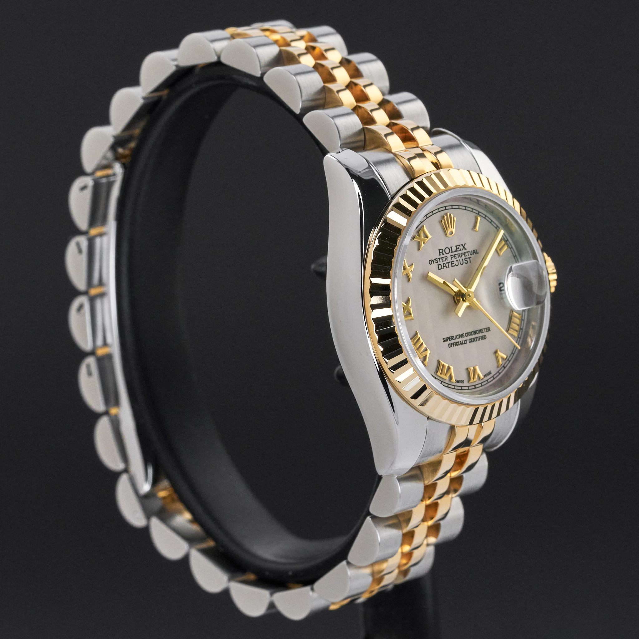 This Rolex Lady-Datejust 179173 features an Ivory pyramid Roman dial and is crafted from 18K yellow gold and stainless steel, with a production year of 2006.