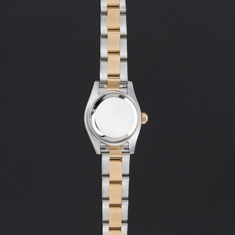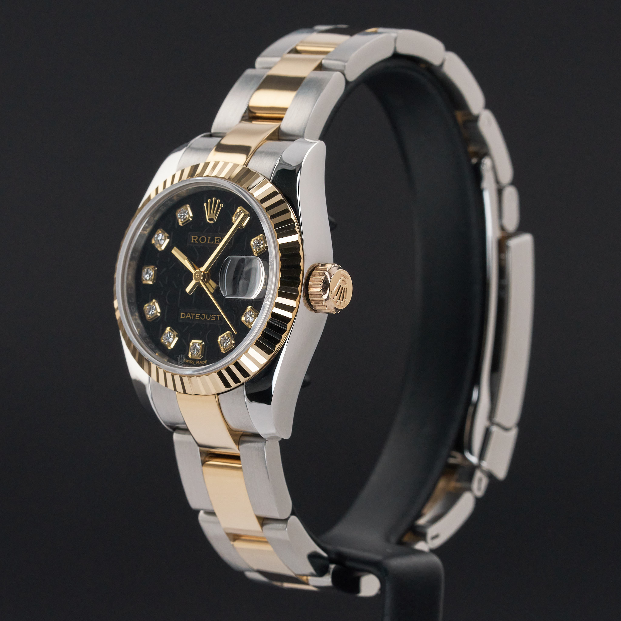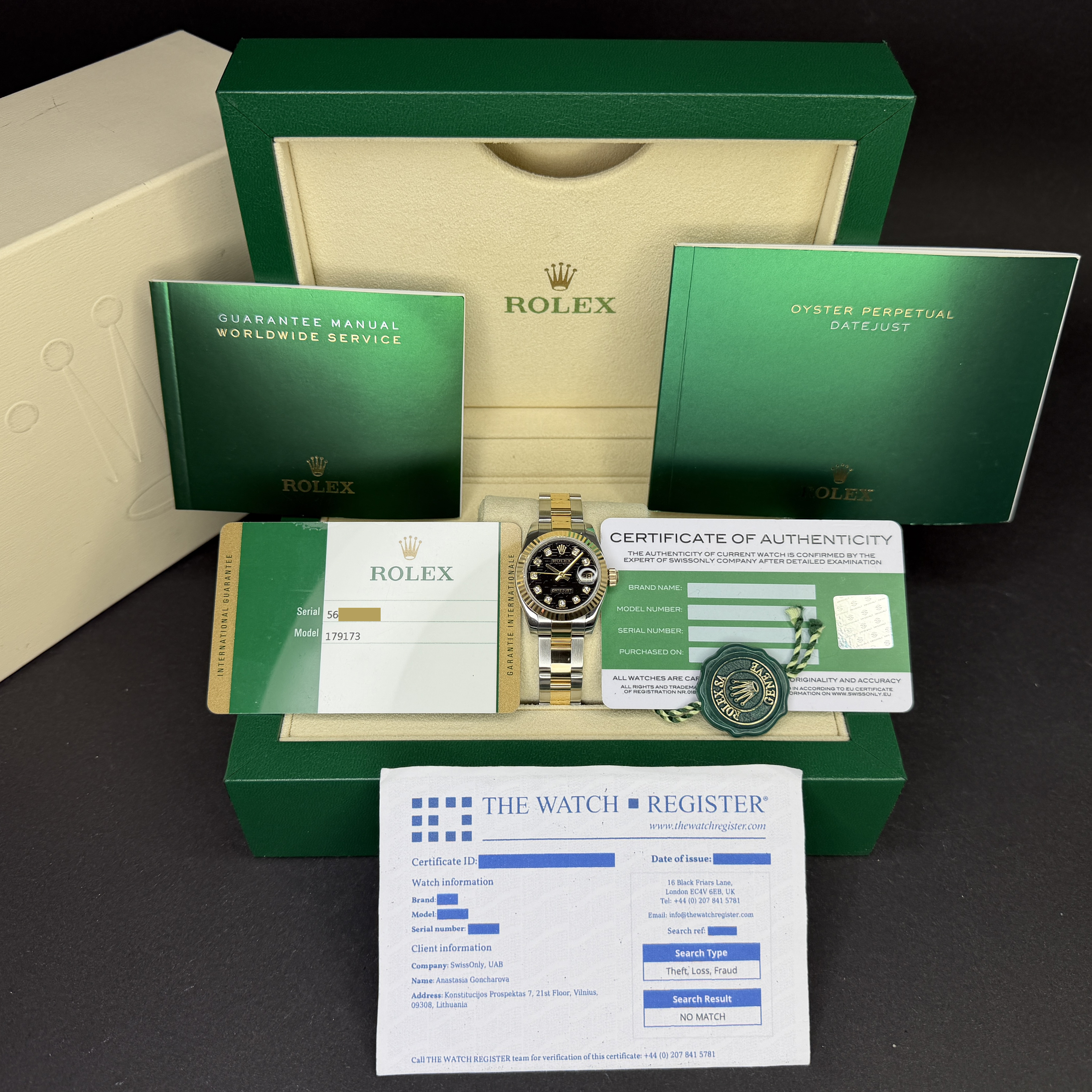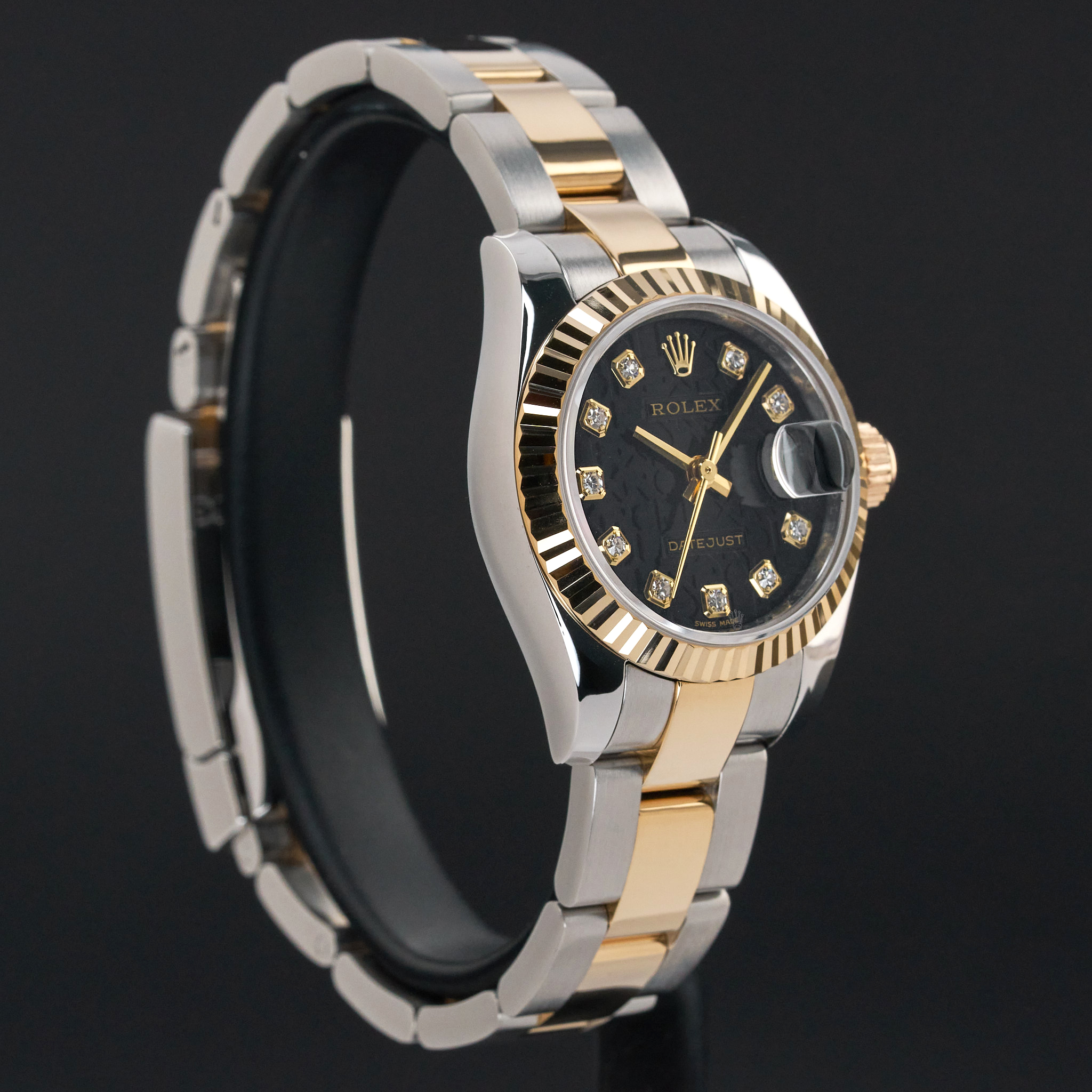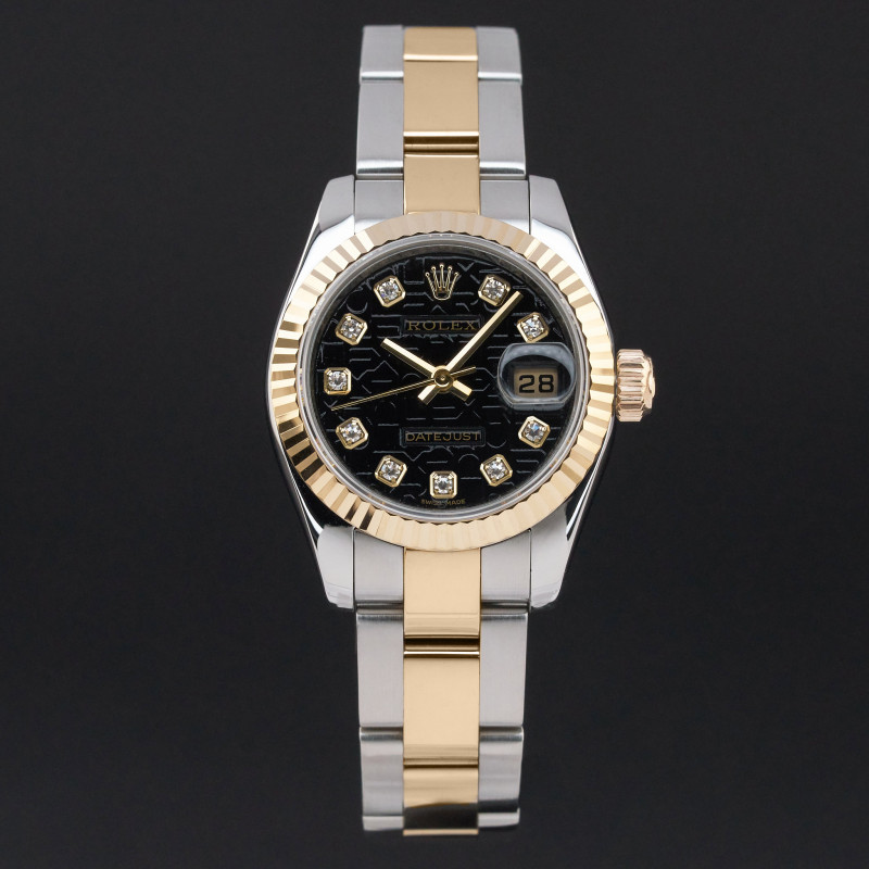 This Rolex Lady-Datejust 179173 features a Black jubilee diamond dial and is crafted from 18K yellow gold and stainless steel, with a production year of 2015.