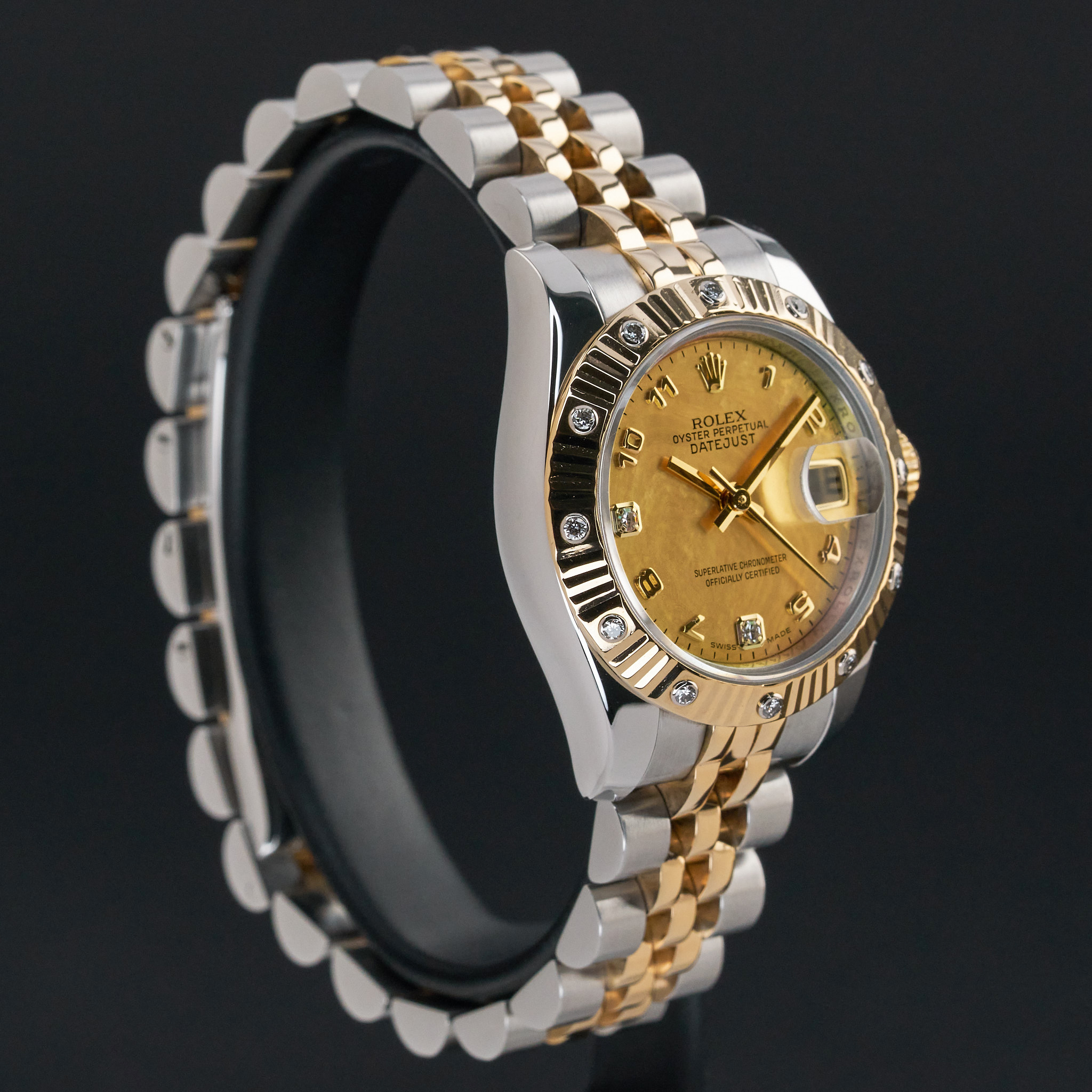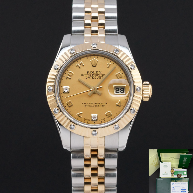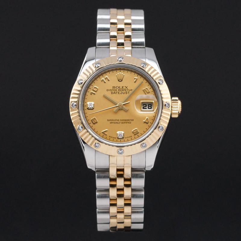 This Rolex Lady-Datejust 179313 features a Gold dust Arabic diamond dial and is crafted from 18K yellow gold and stainless steel, with a production year of 2006.