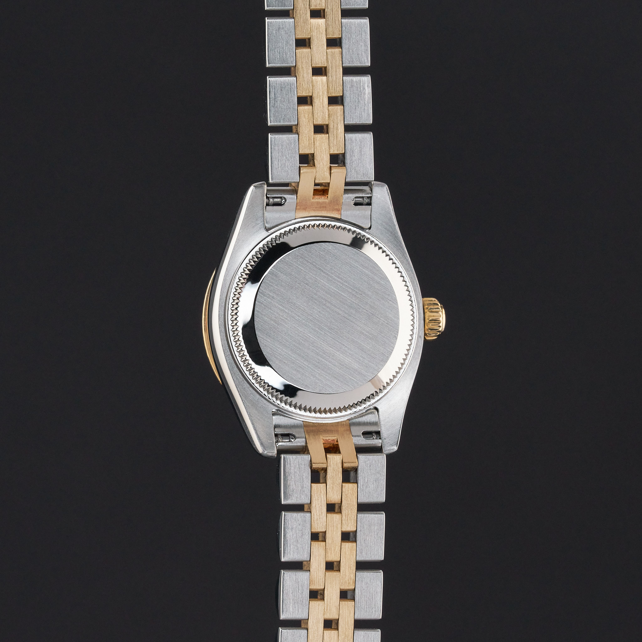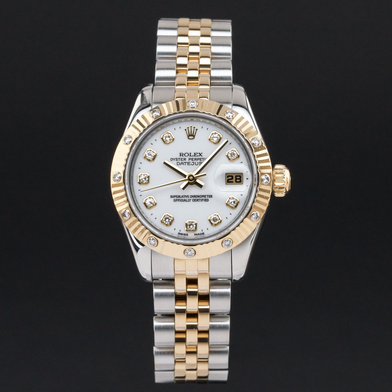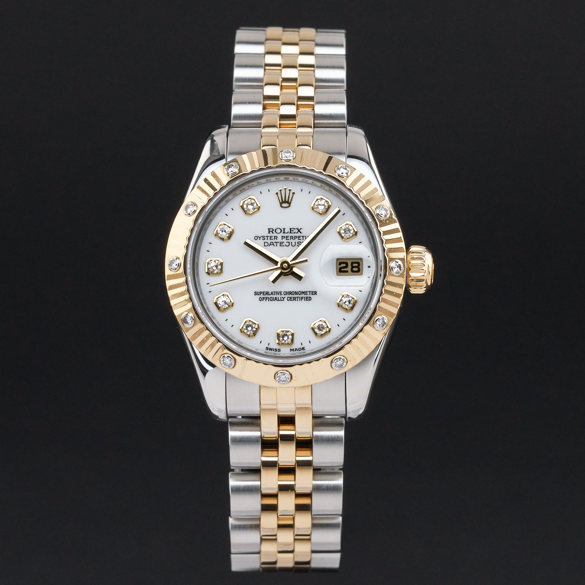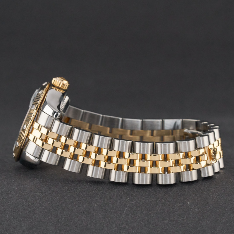 This Rolex Lady-Datejust 179313 features a White diamond dial and is crafted from 18K yellow gold and stainless steel, with a production year of 2006.