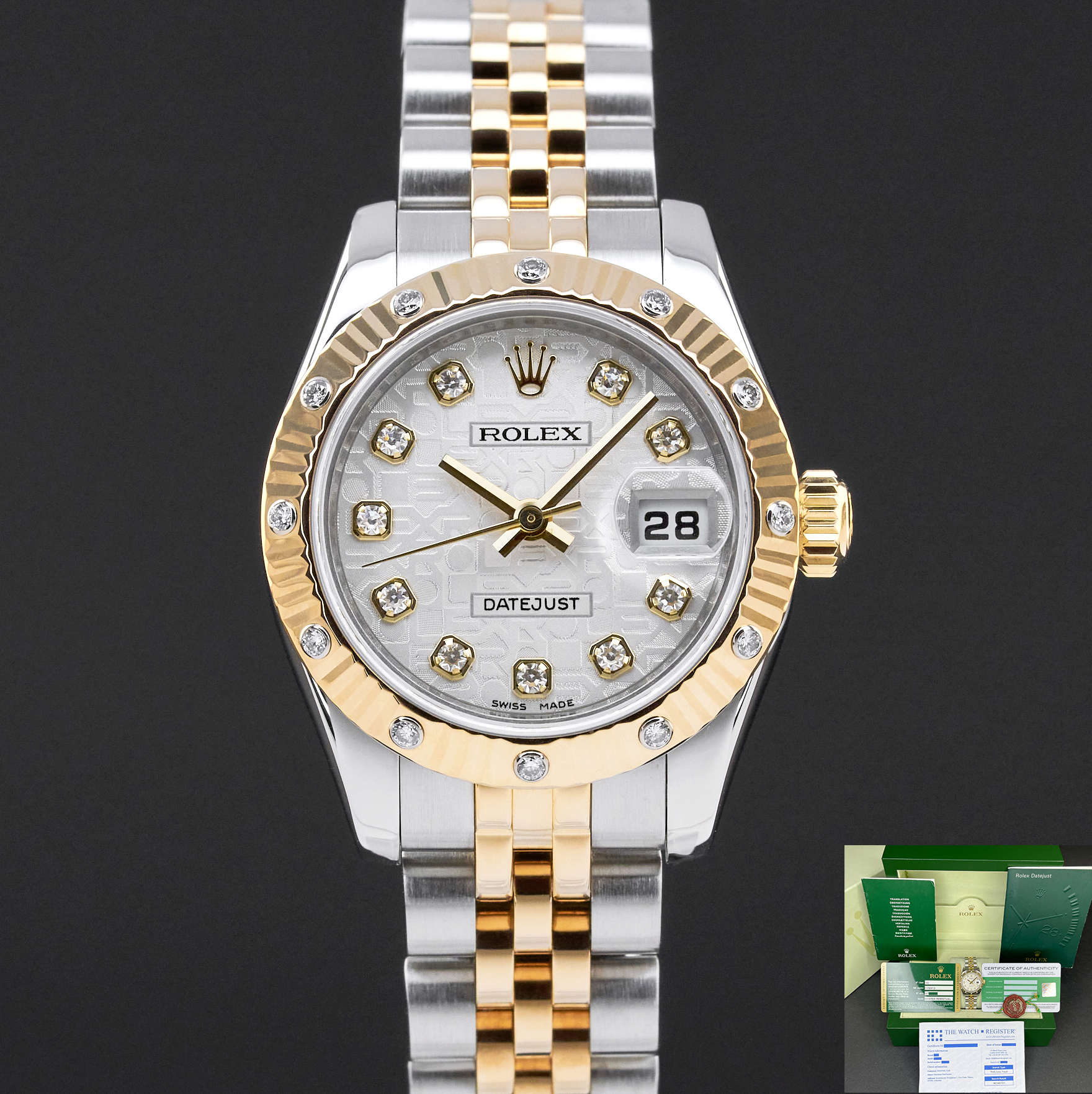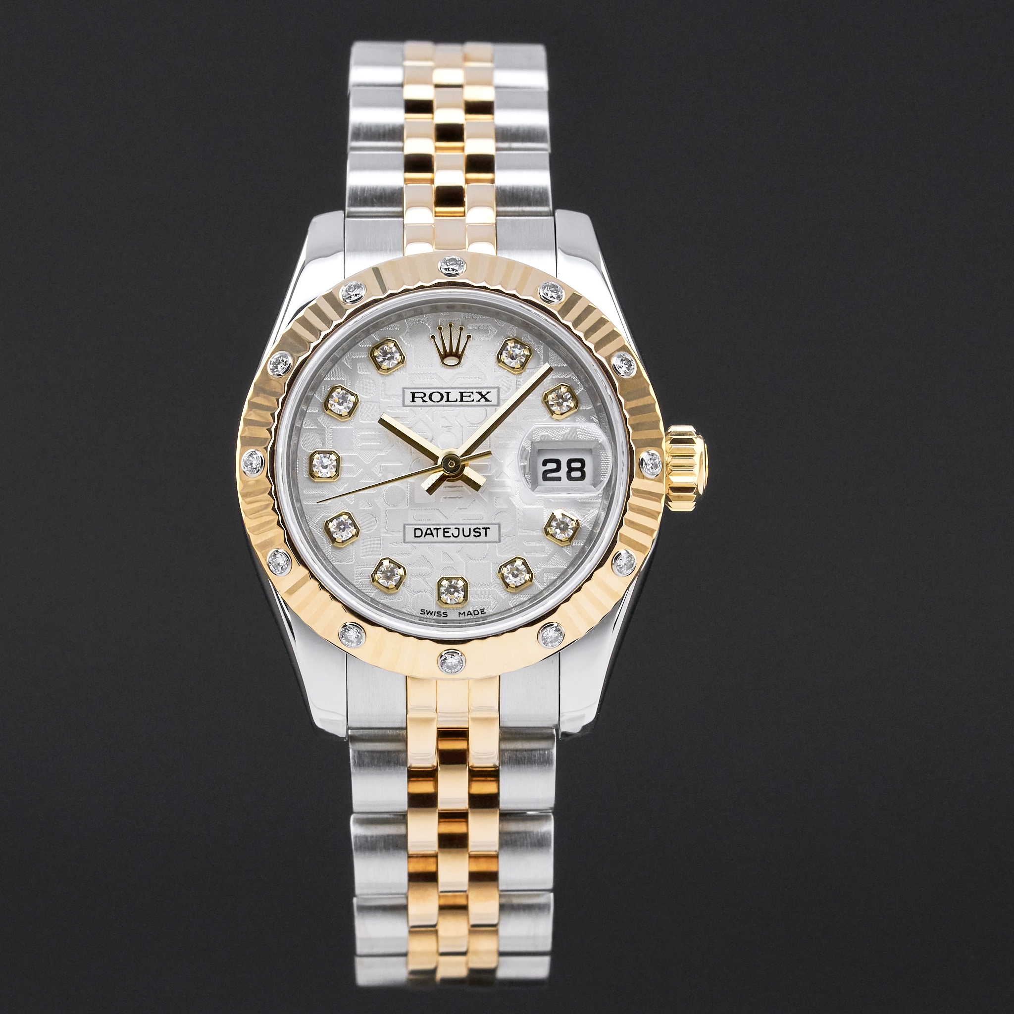 This particular Rolex Lady-Datejust introduced in 2009, reflects timeless elegance in a refined and feminine form. It’s silver Jubilee dial, highlighted with diamond hour markers, radiates sophistication and subtle luxury. The combination of classic design elements and delicate details makes this watch a graceful statement of enduring style.