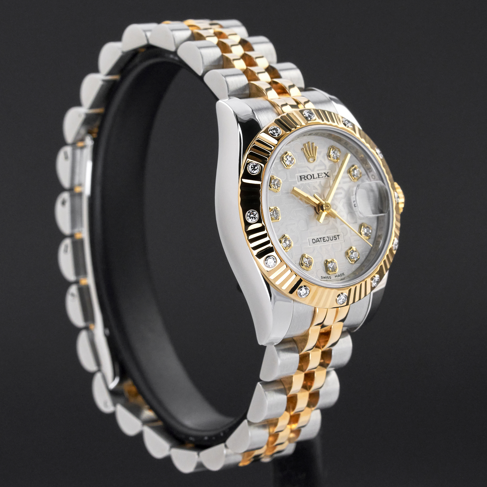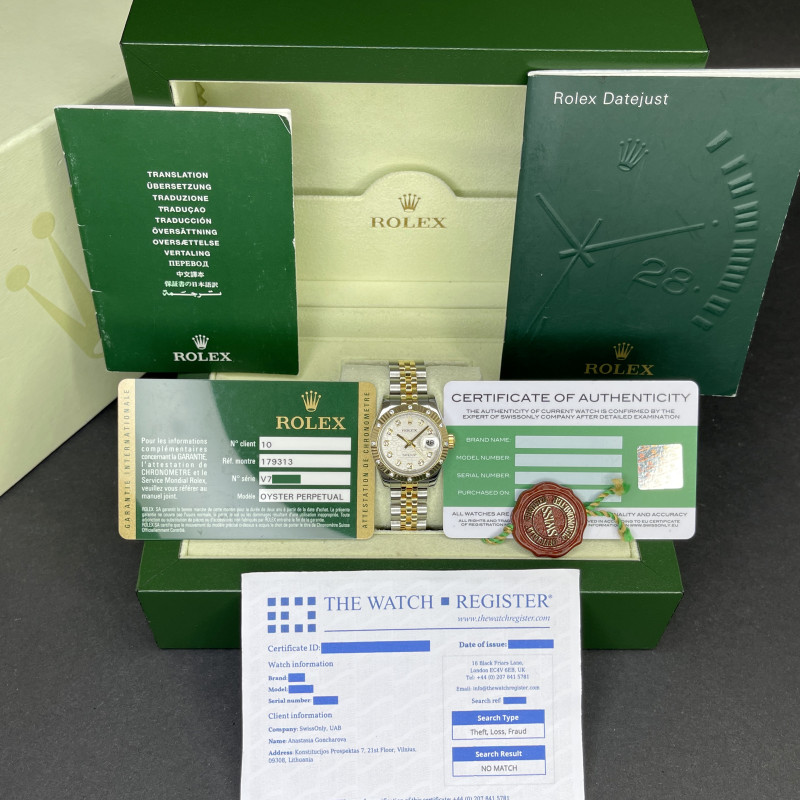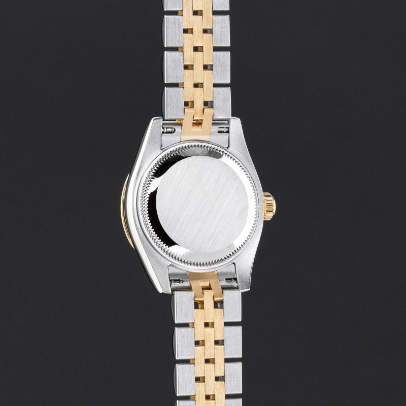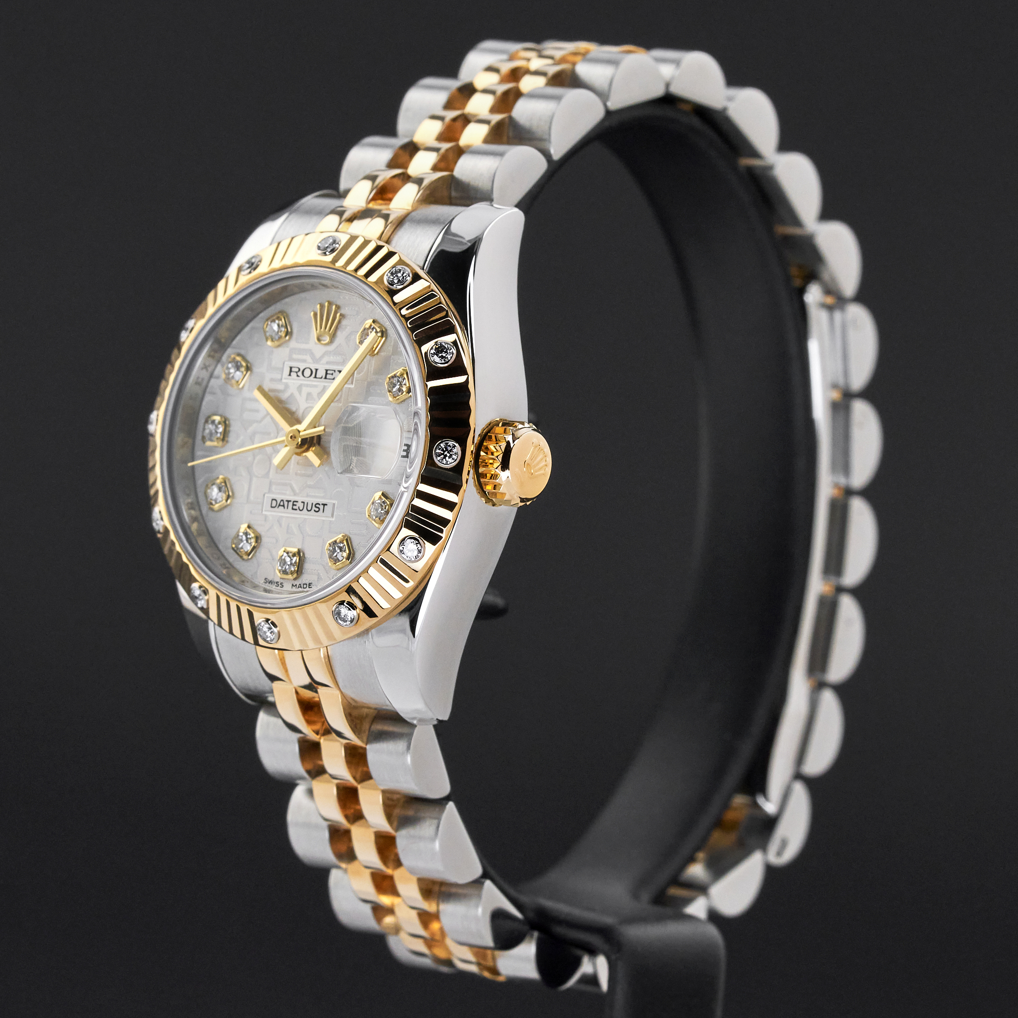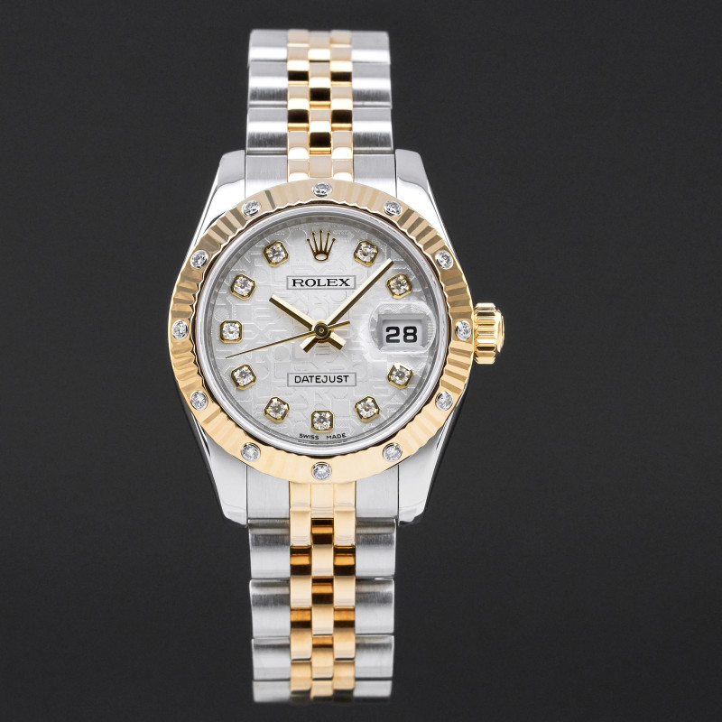 This Rolex Lady-Datejust 179313 features a Silver jubilee diamond dial and is crafted from 18K yellow gold and stainless steel, with a production year of 2009.