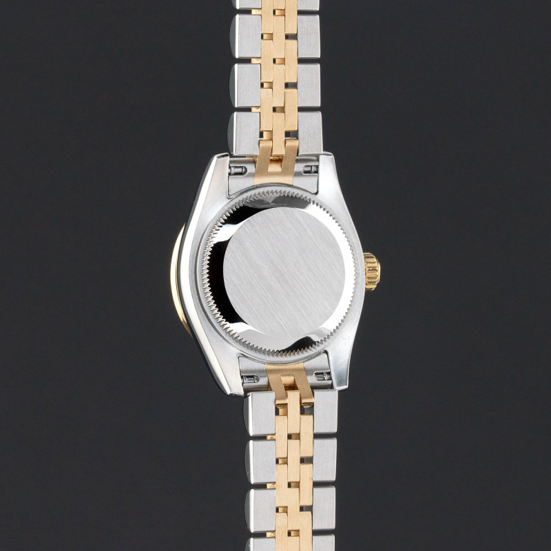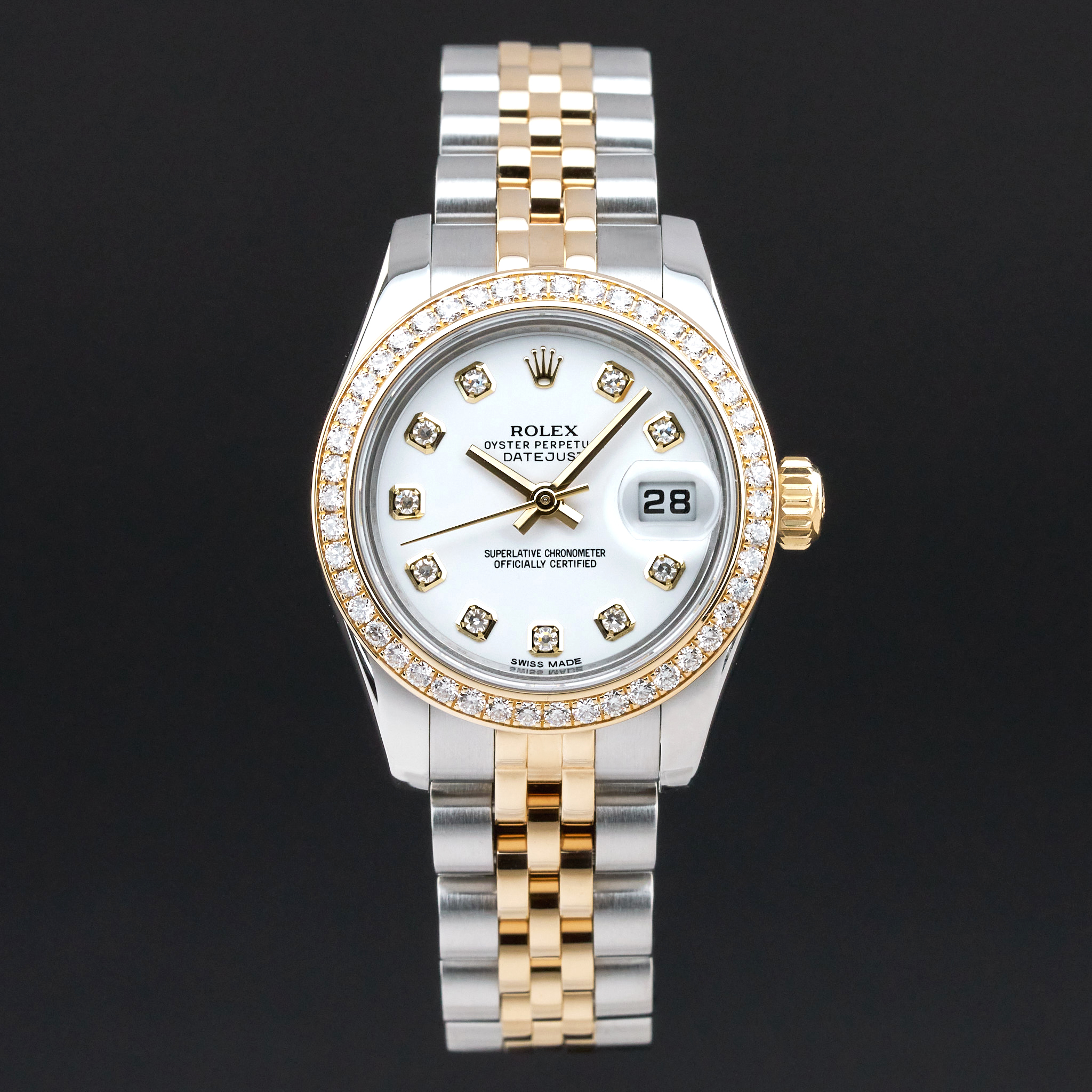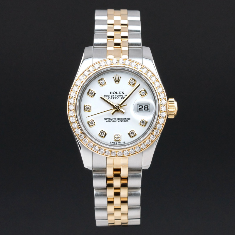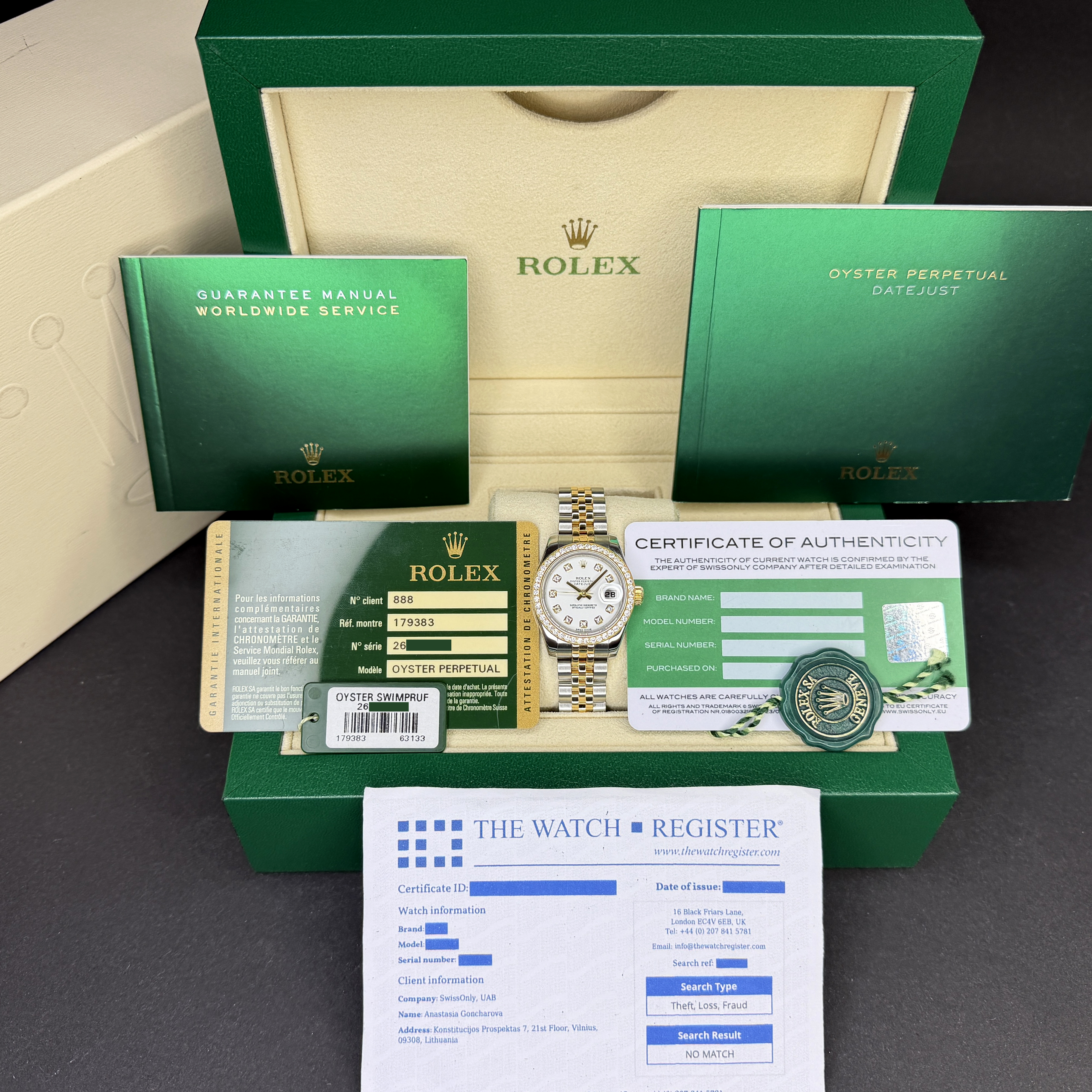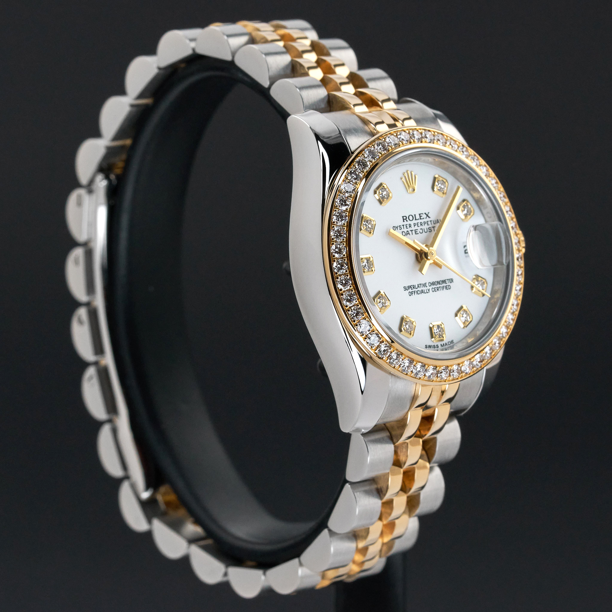 This Rolex Lady-Datejust 179383 features a White diamond dial and is crafted from 18K yellow gold and stainless steel, with a production year of 2014.