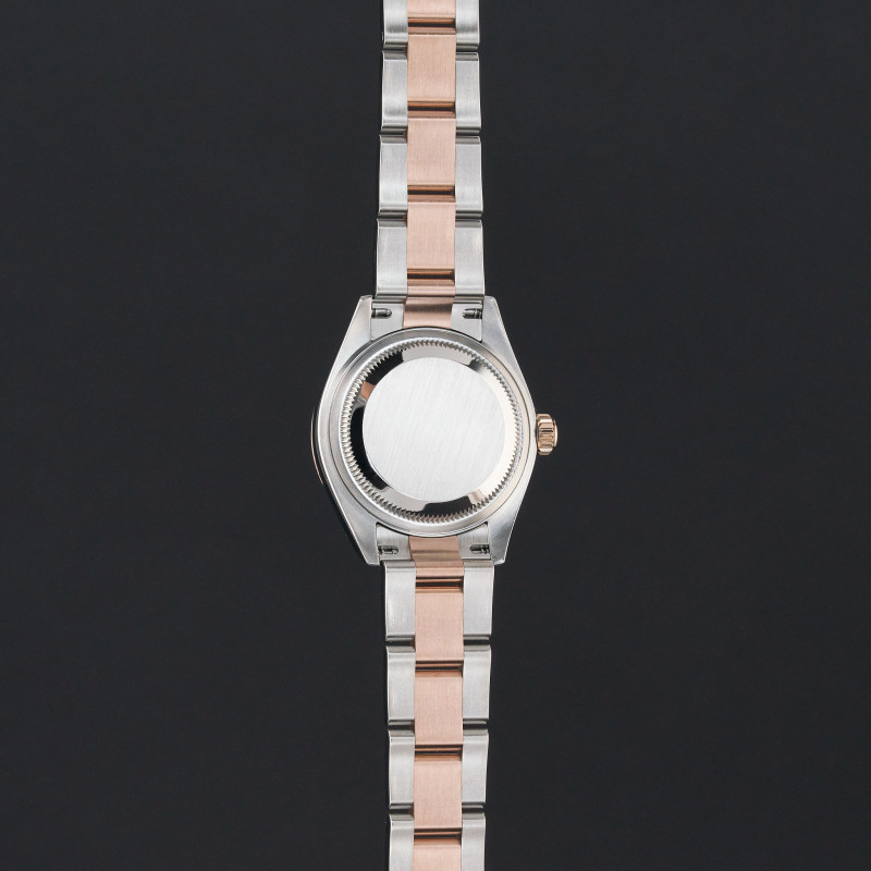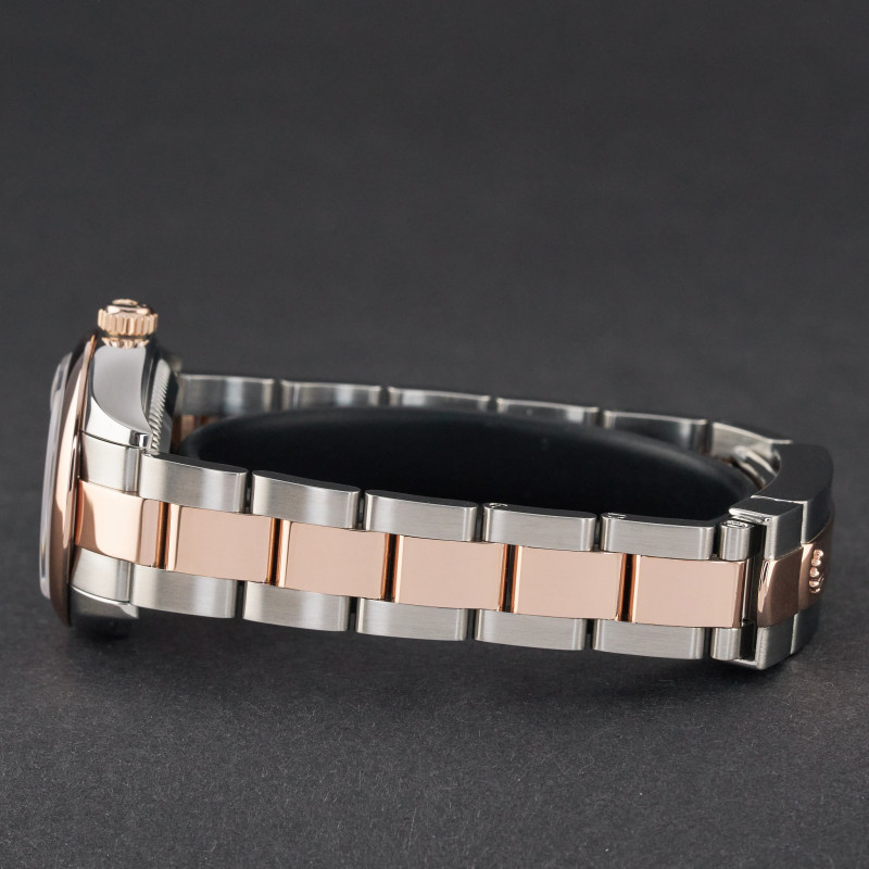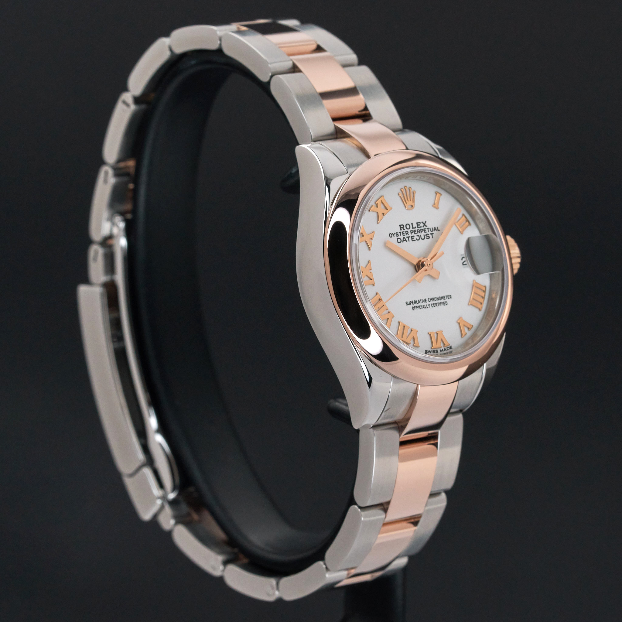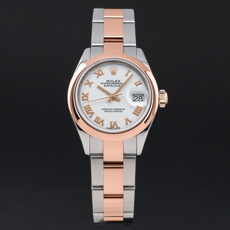 This Rolex Lady-Datejust 279161 features a White Roman dial and is crafted from 18K rose gold and stainless steel, with a production year of 2018.