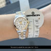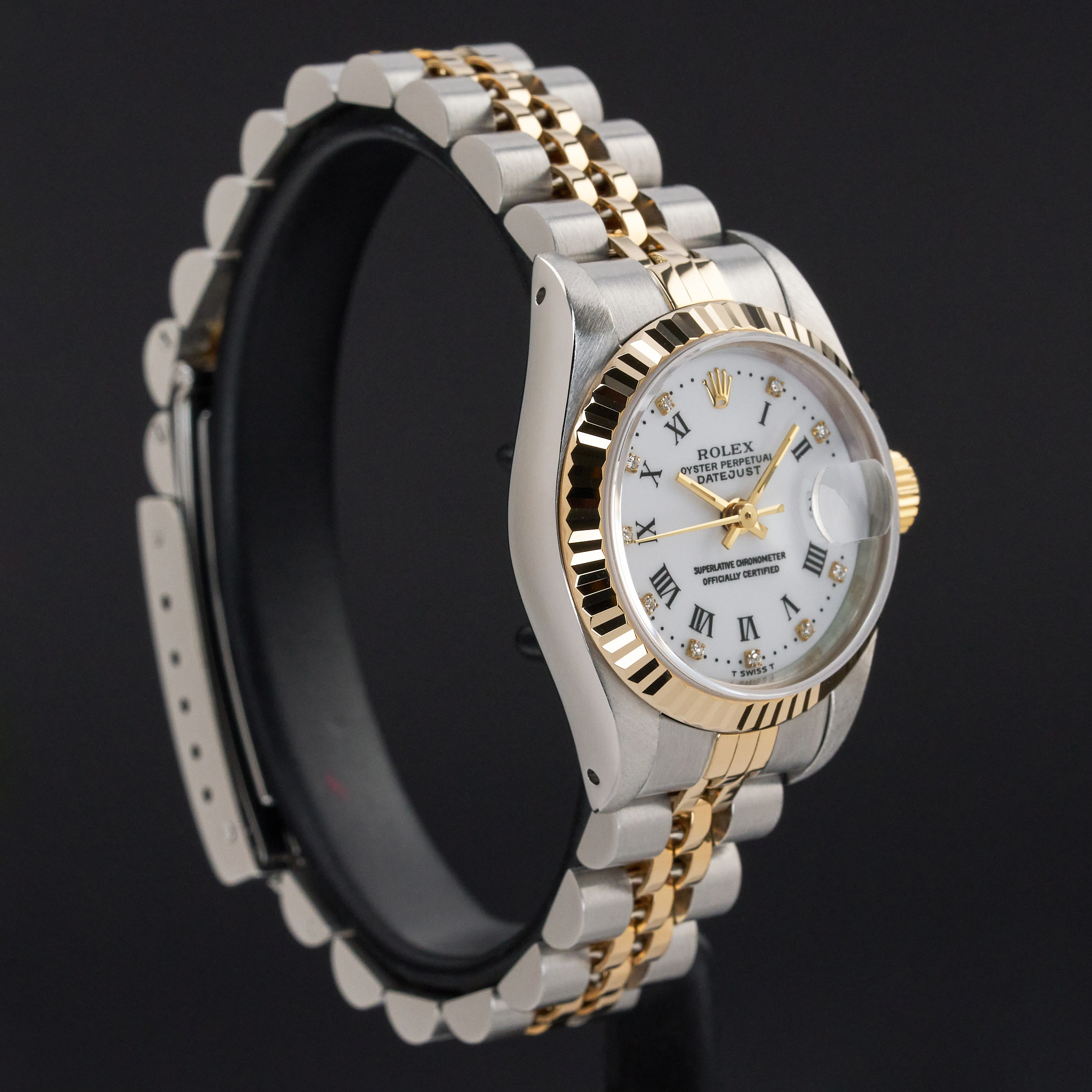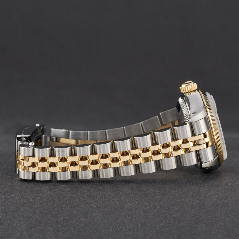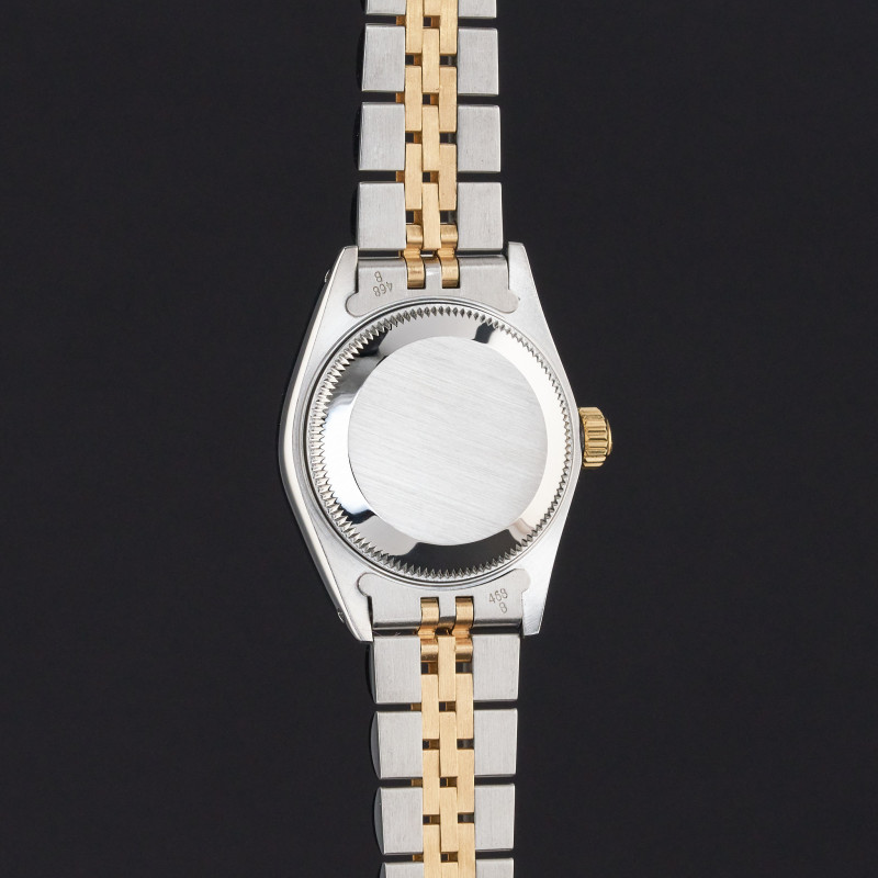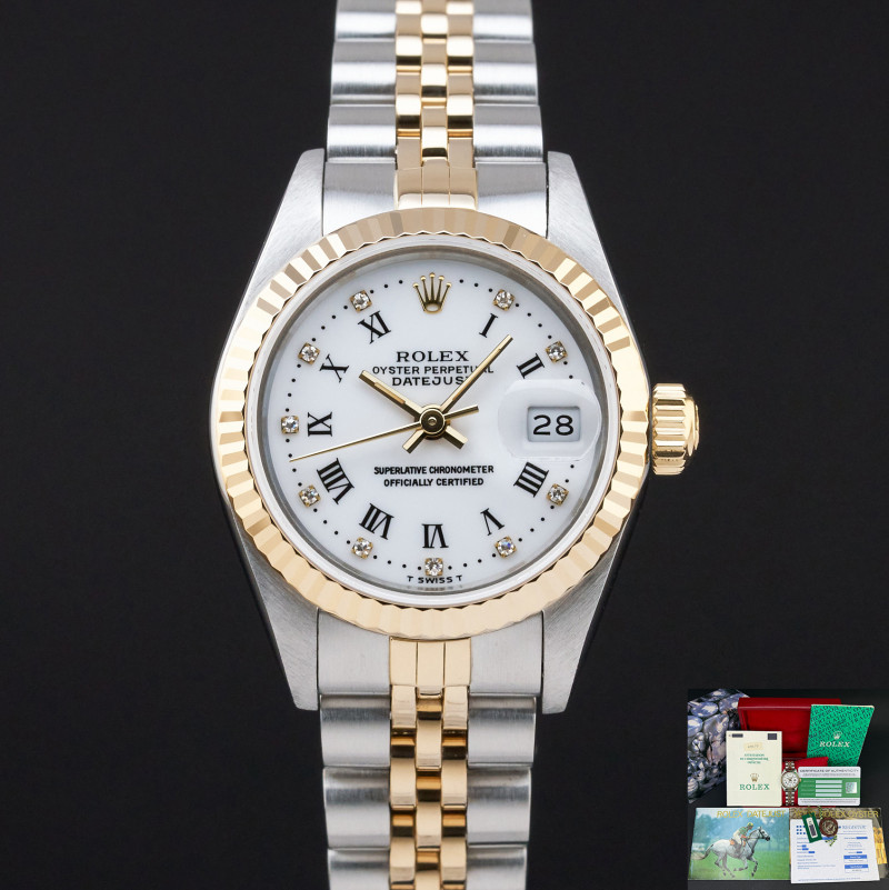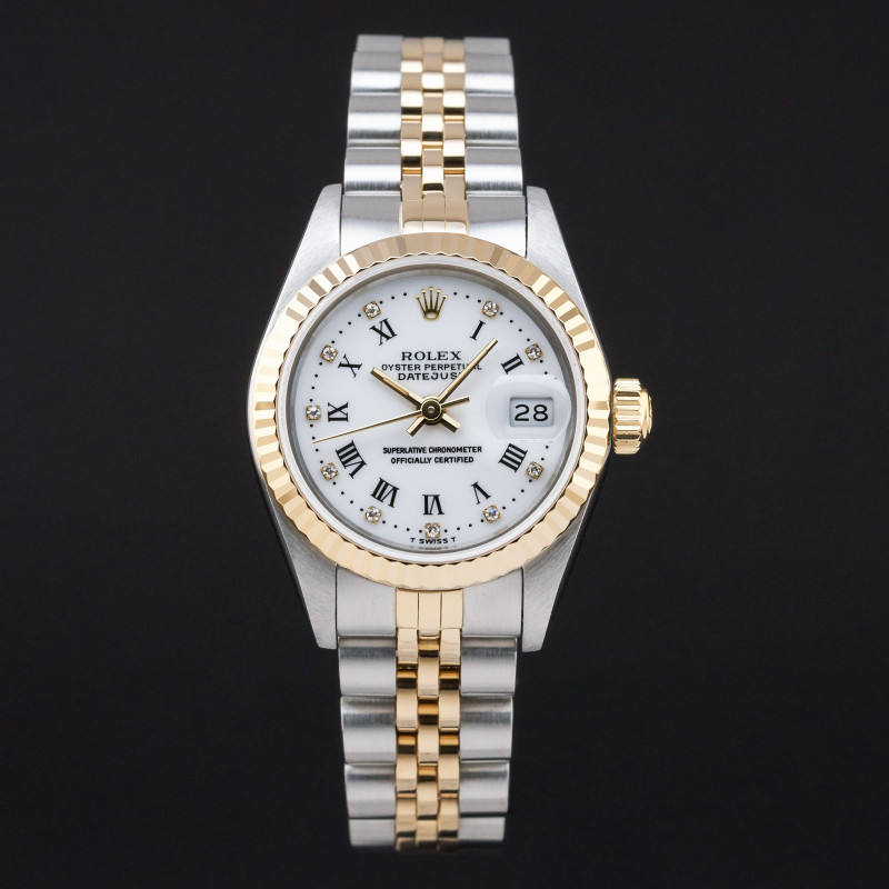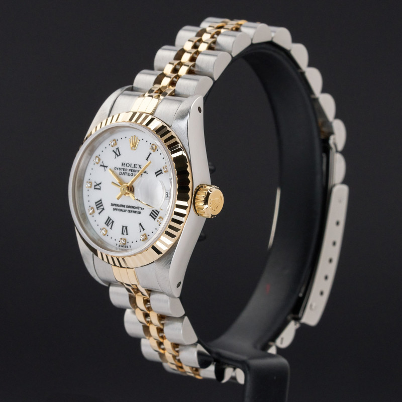This Rolex Lady-Datejust 69173 features a White Roman small diamond dial and is crafted from 18K yellow gold and stainless steel, with a production year of 1991.