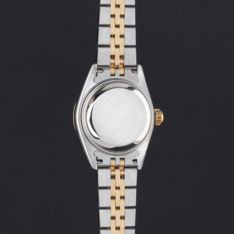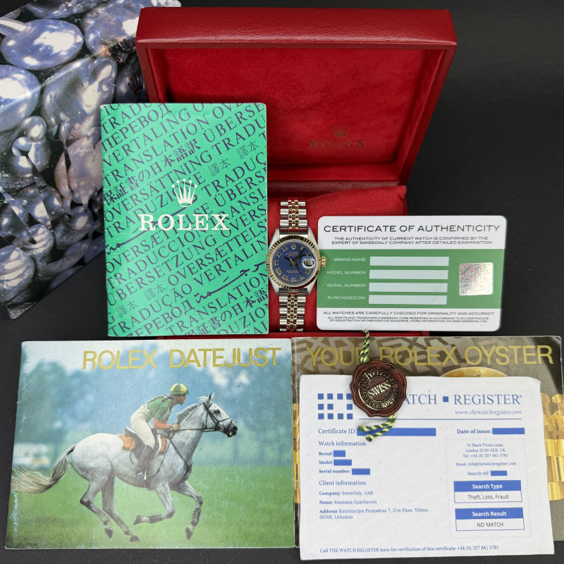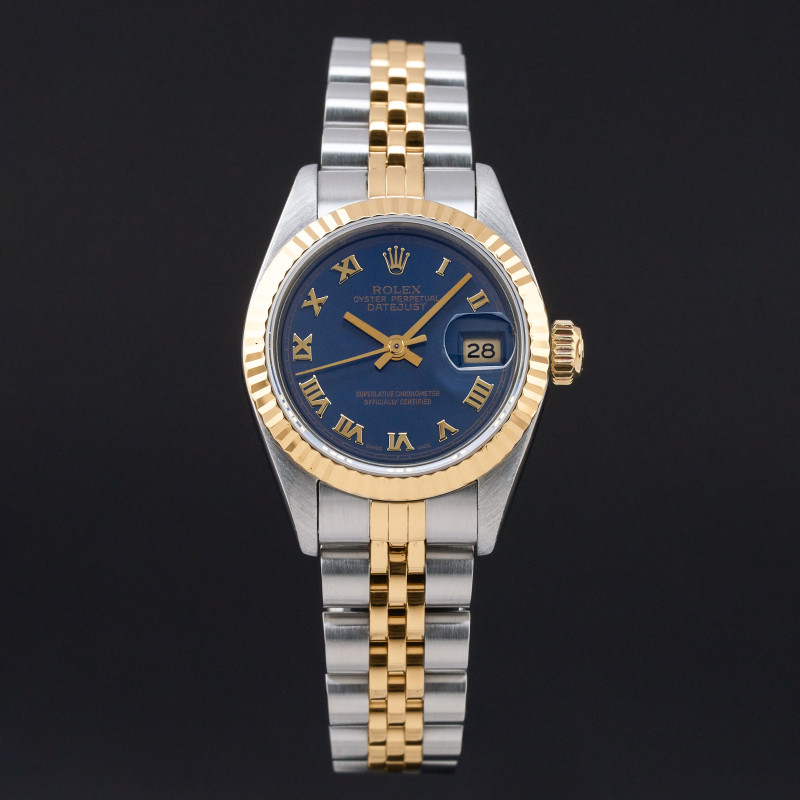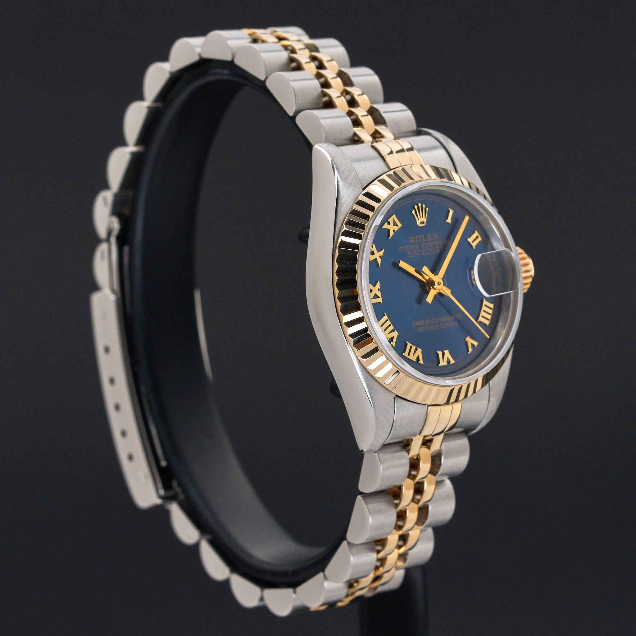 This Rolex Lady-Datejust 69173 features a Blue Roman dial and is crafted from 18K yellow gold and stainless steel, with a production year of 1995.