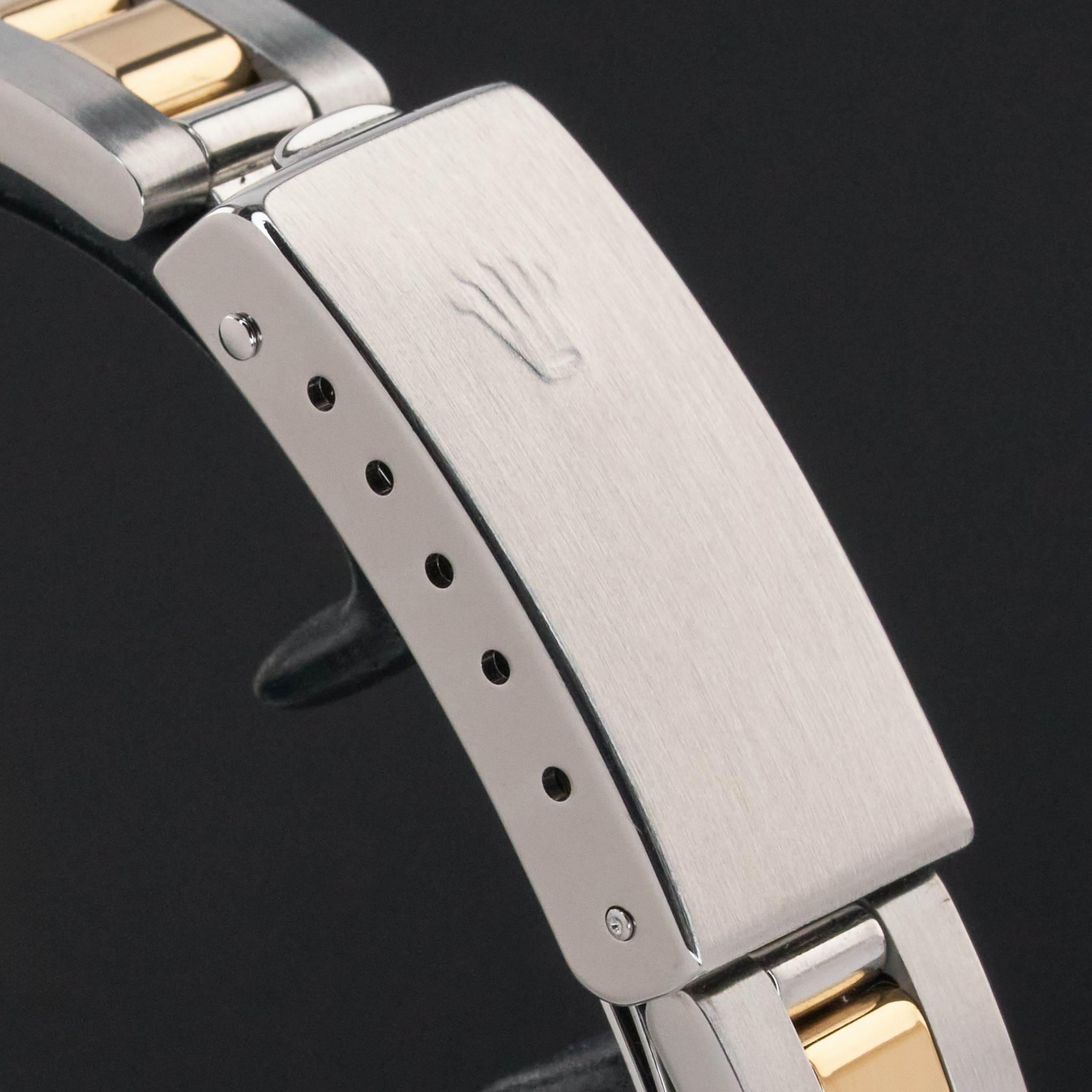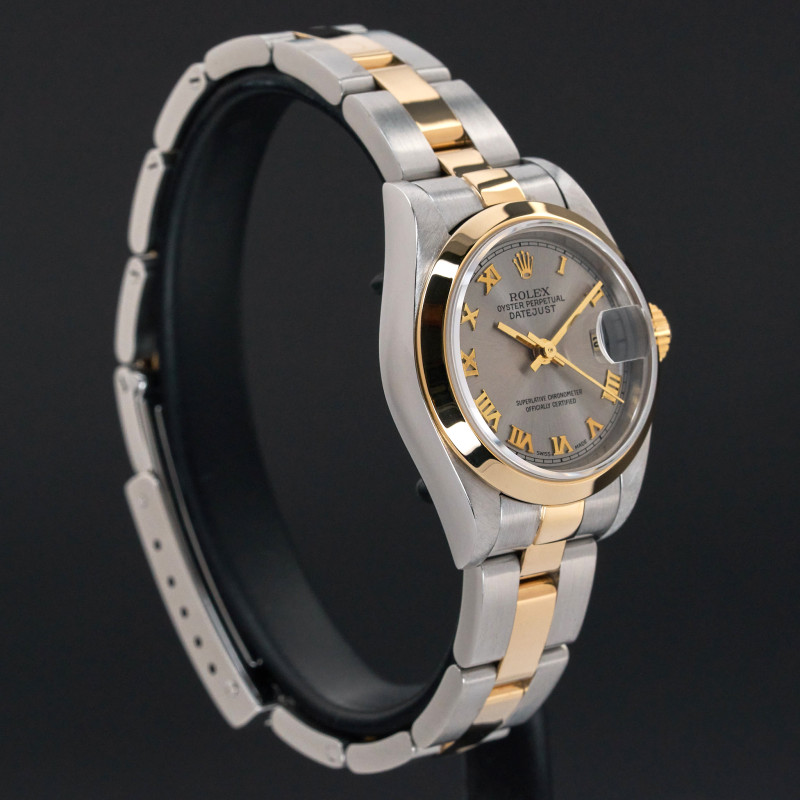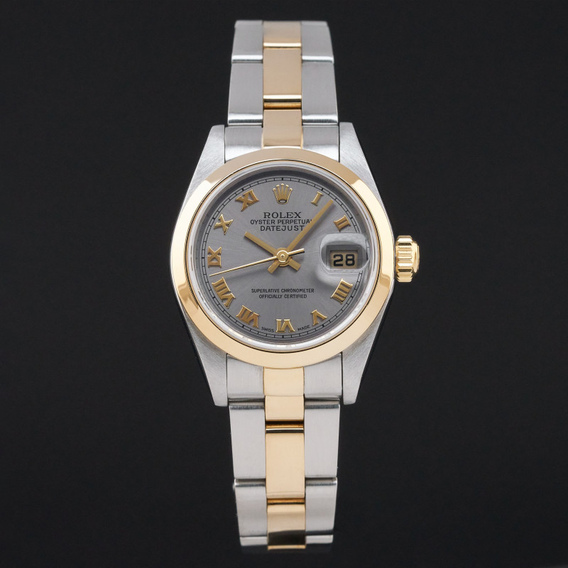 This Rolex Lady-Datejust 79163 features a Grey Roman dial and is crafted from 18K yellow gold and stainless steel, with a production year of 2000.