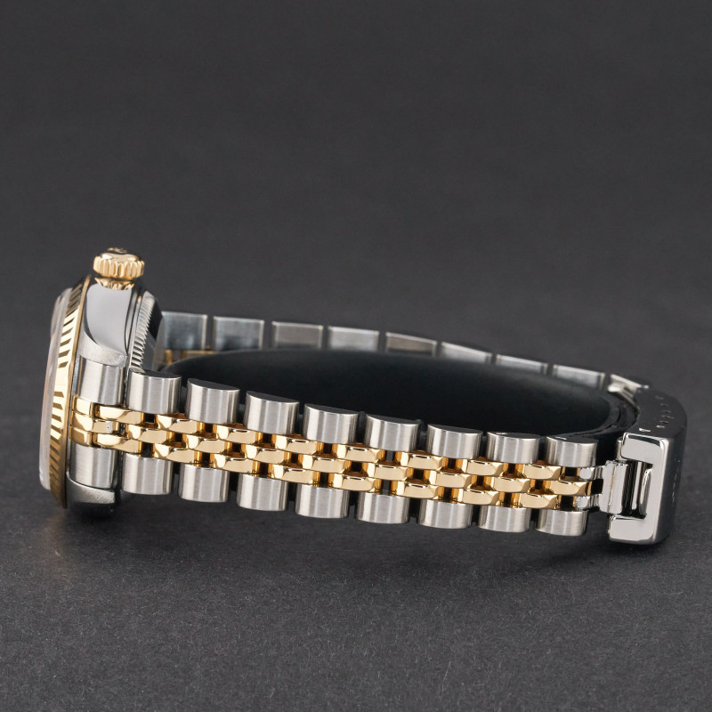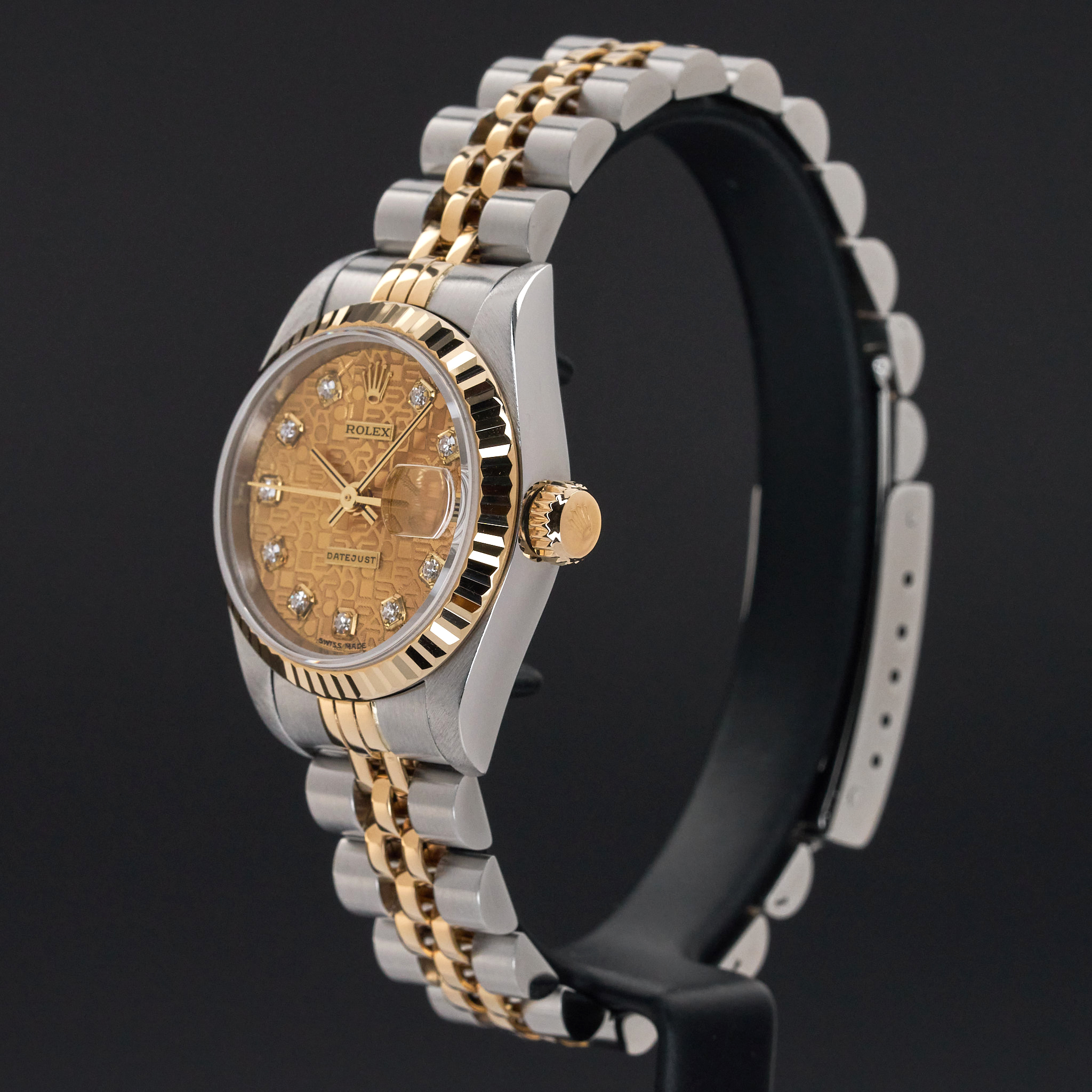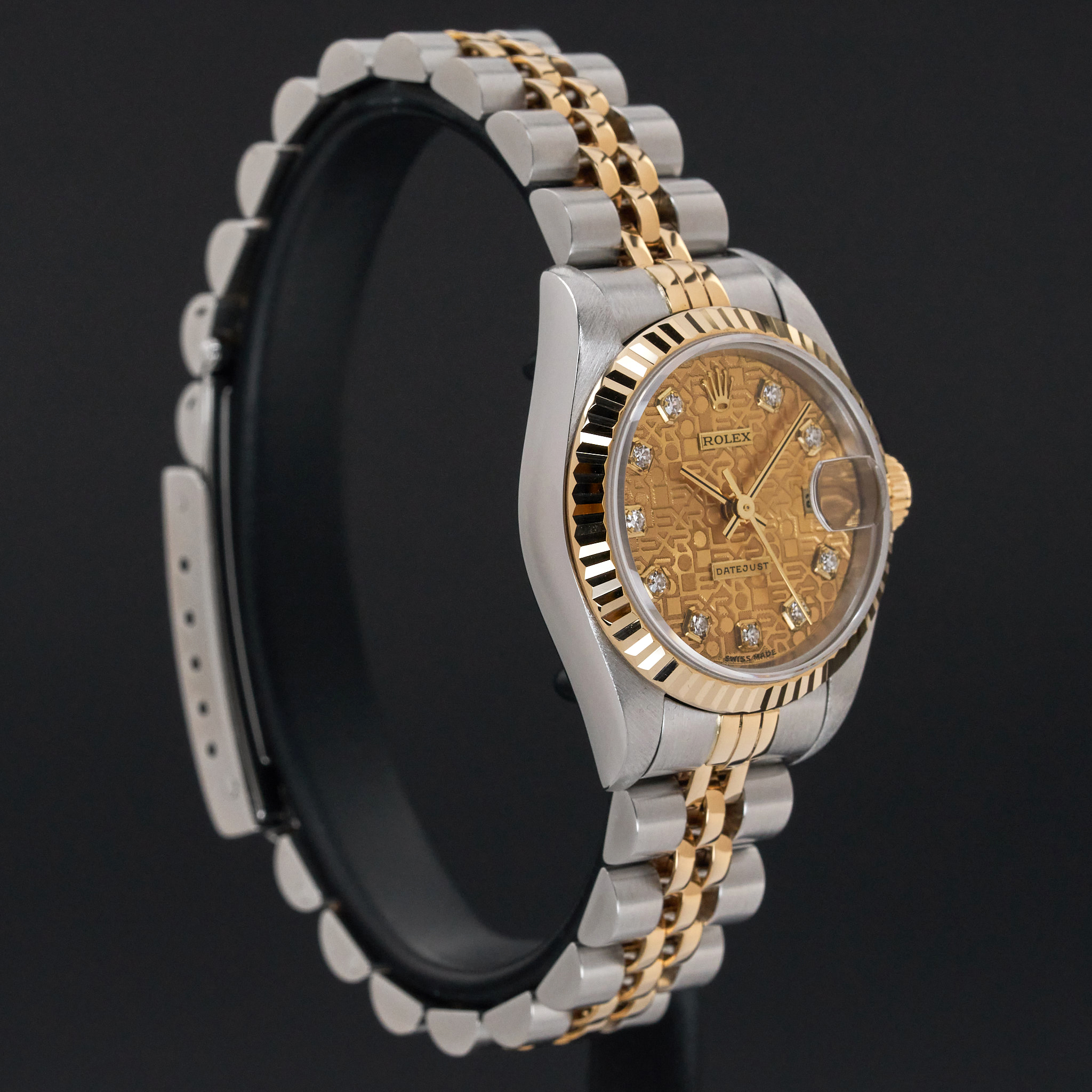 This Rolex Lady-Datejust 79173 features a Champagne jubilee diamond dial and is crafted from 18K yellow gold and stainless steel, with a production year of 1999.