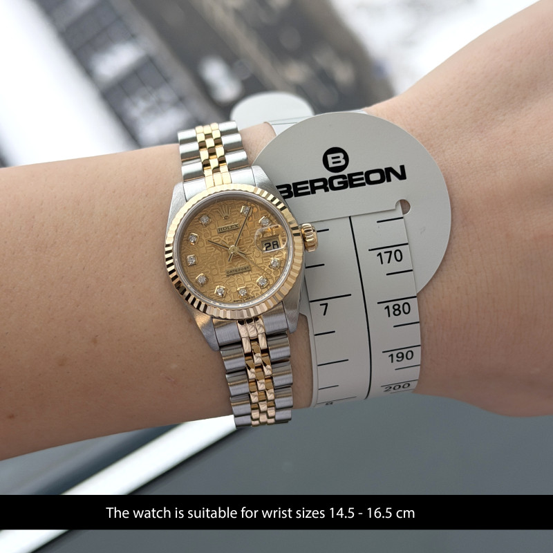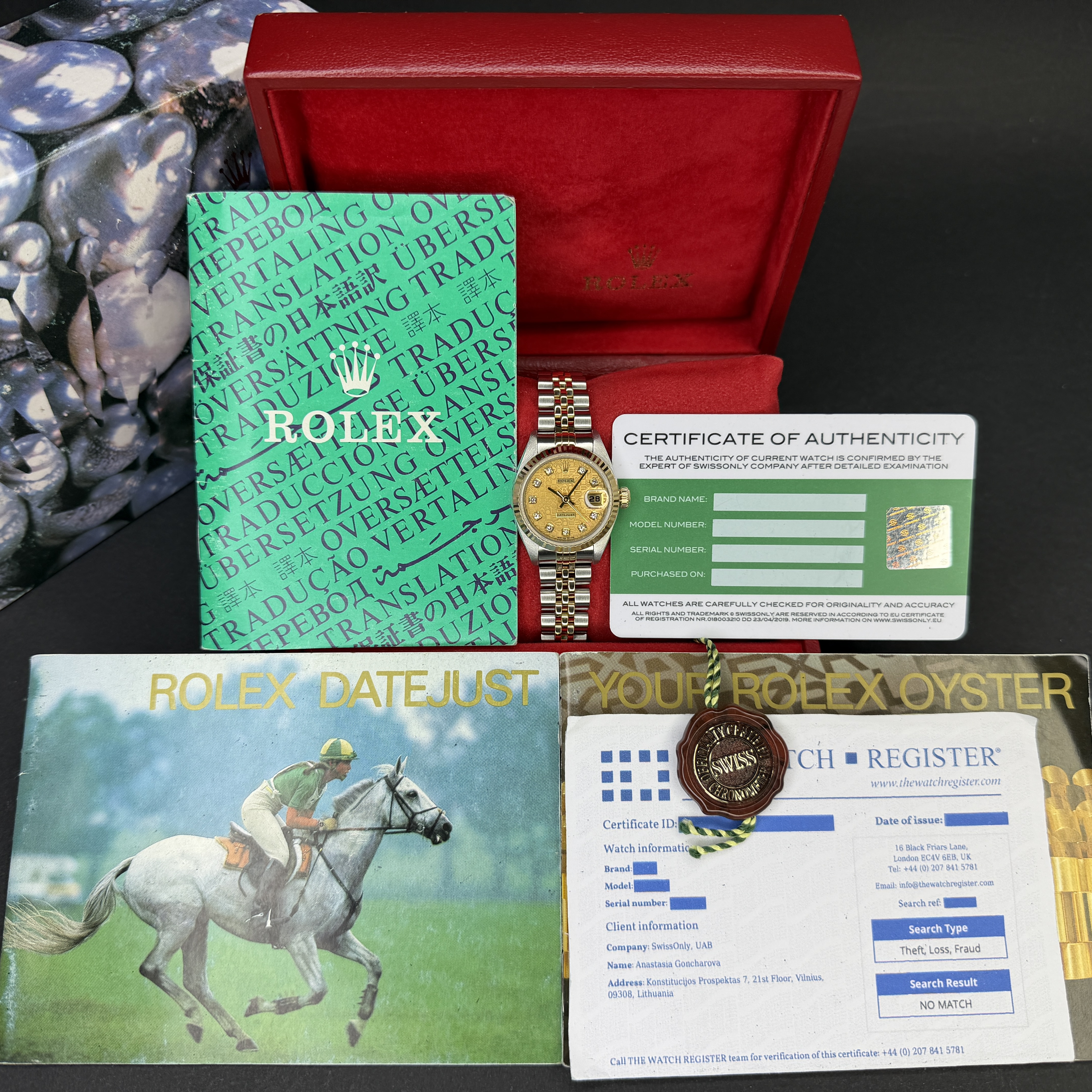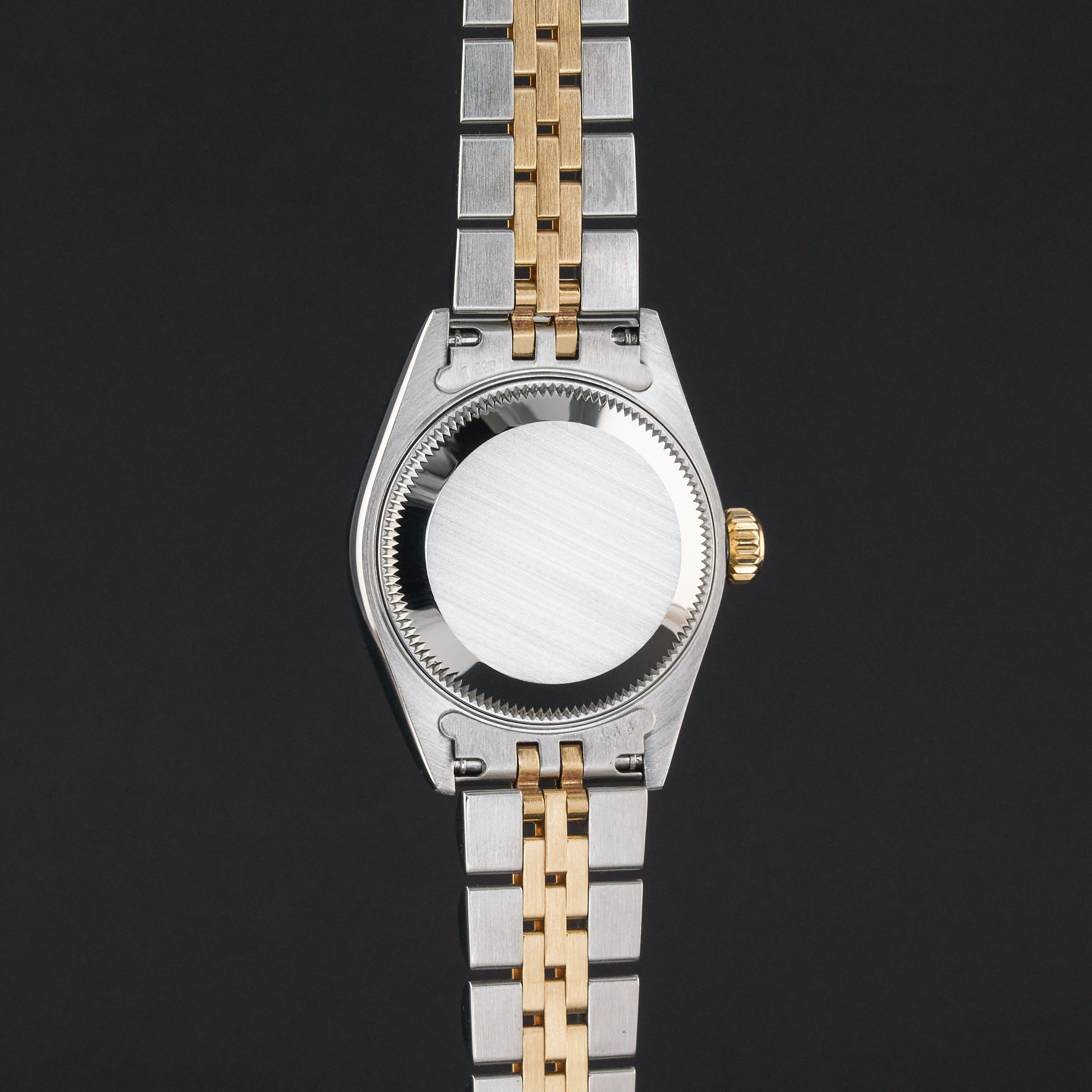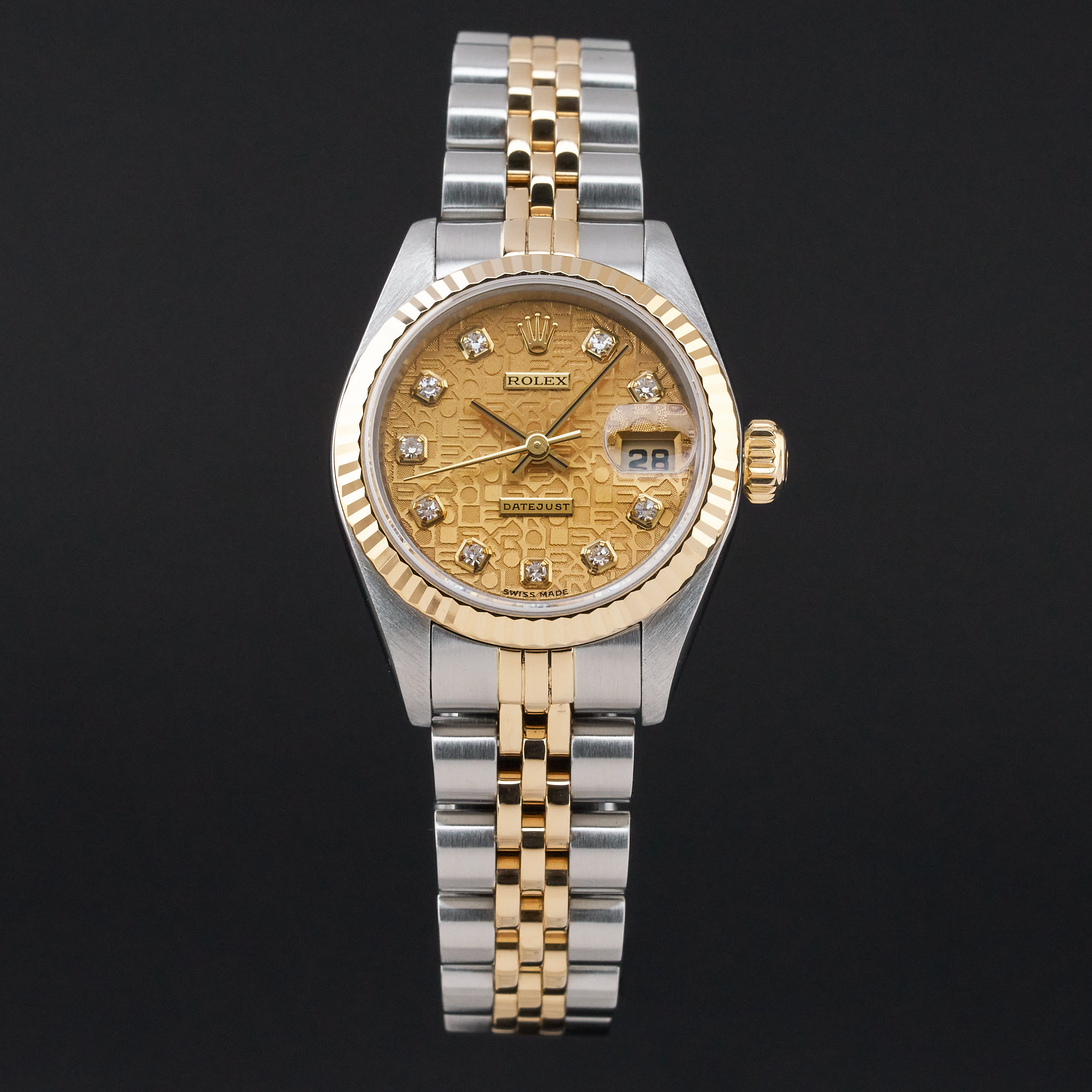 This Rolex Lady-Datejust 79173 features a Champagne jubilee diamond dial and is crafted from 18K yellow gold and stainless steel, with a production year of 1999.
