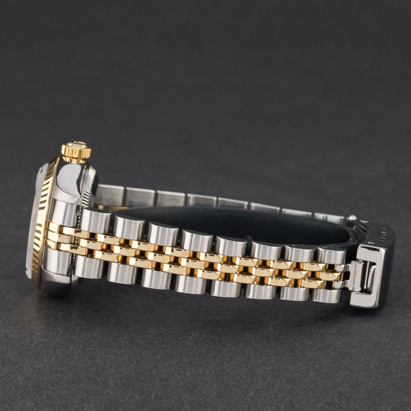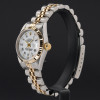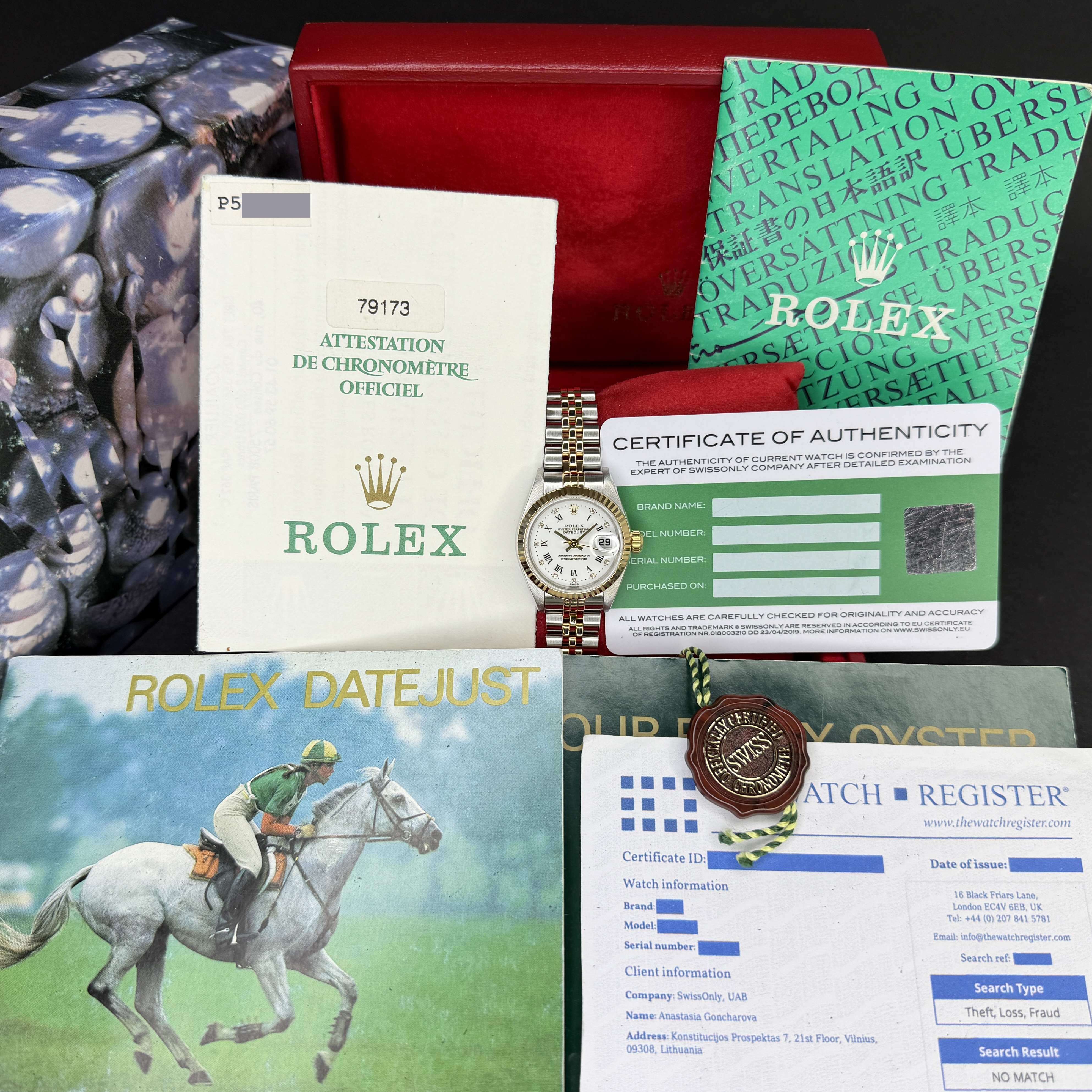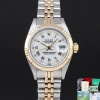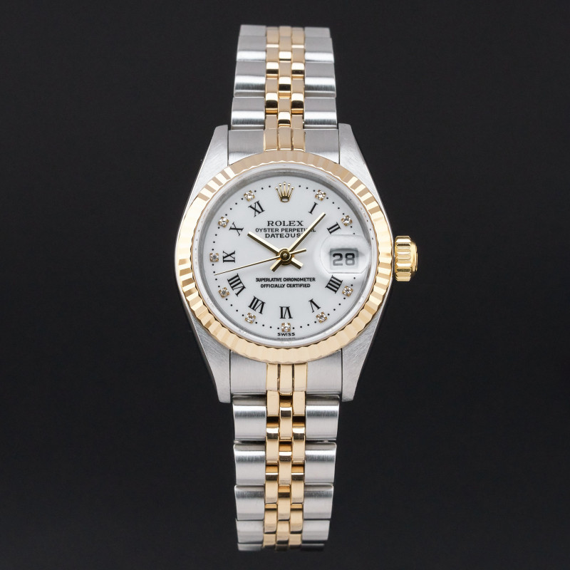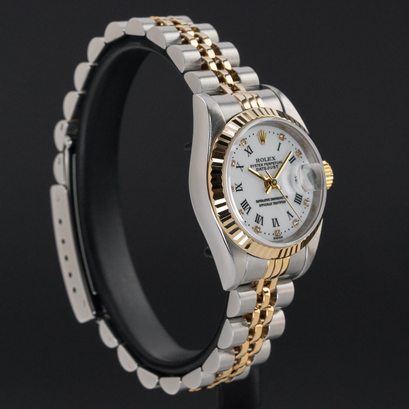 This Rolex Lady-Datejust 79173 features a White Roman diamond dial and is crafted from 18K yellow gold and stainless steel, with a production year of 2000.